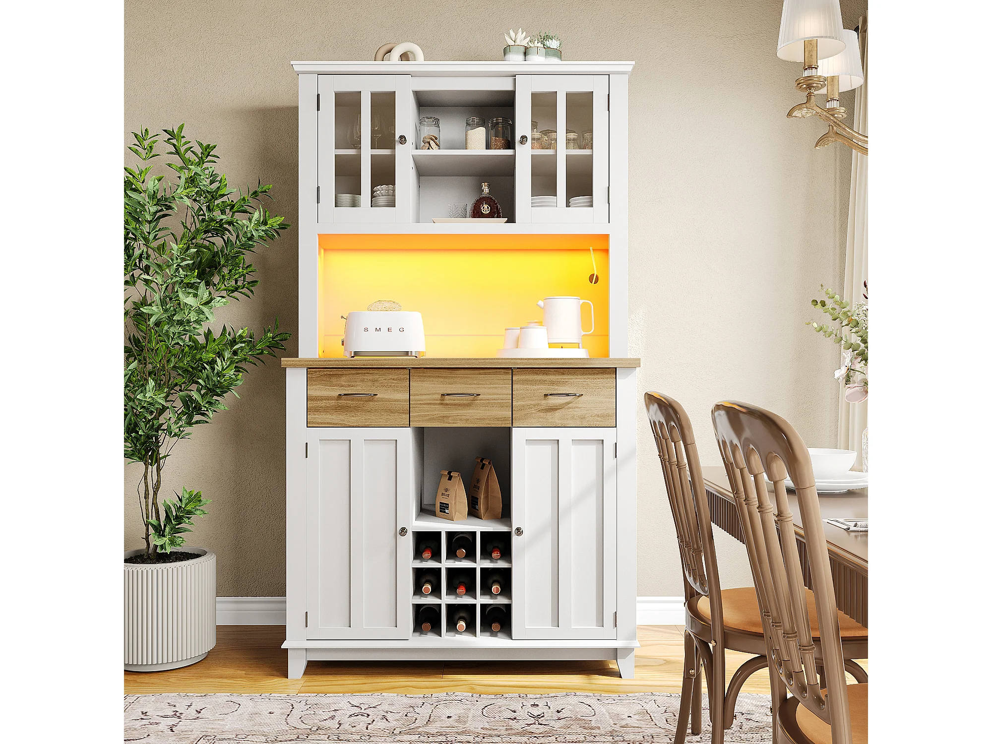 Credenza alta da cucina con 4 ante + 3 cassetti + ripiano + LED - 106 x 40 x 179,5 cm - MDF - Bianco + naturale