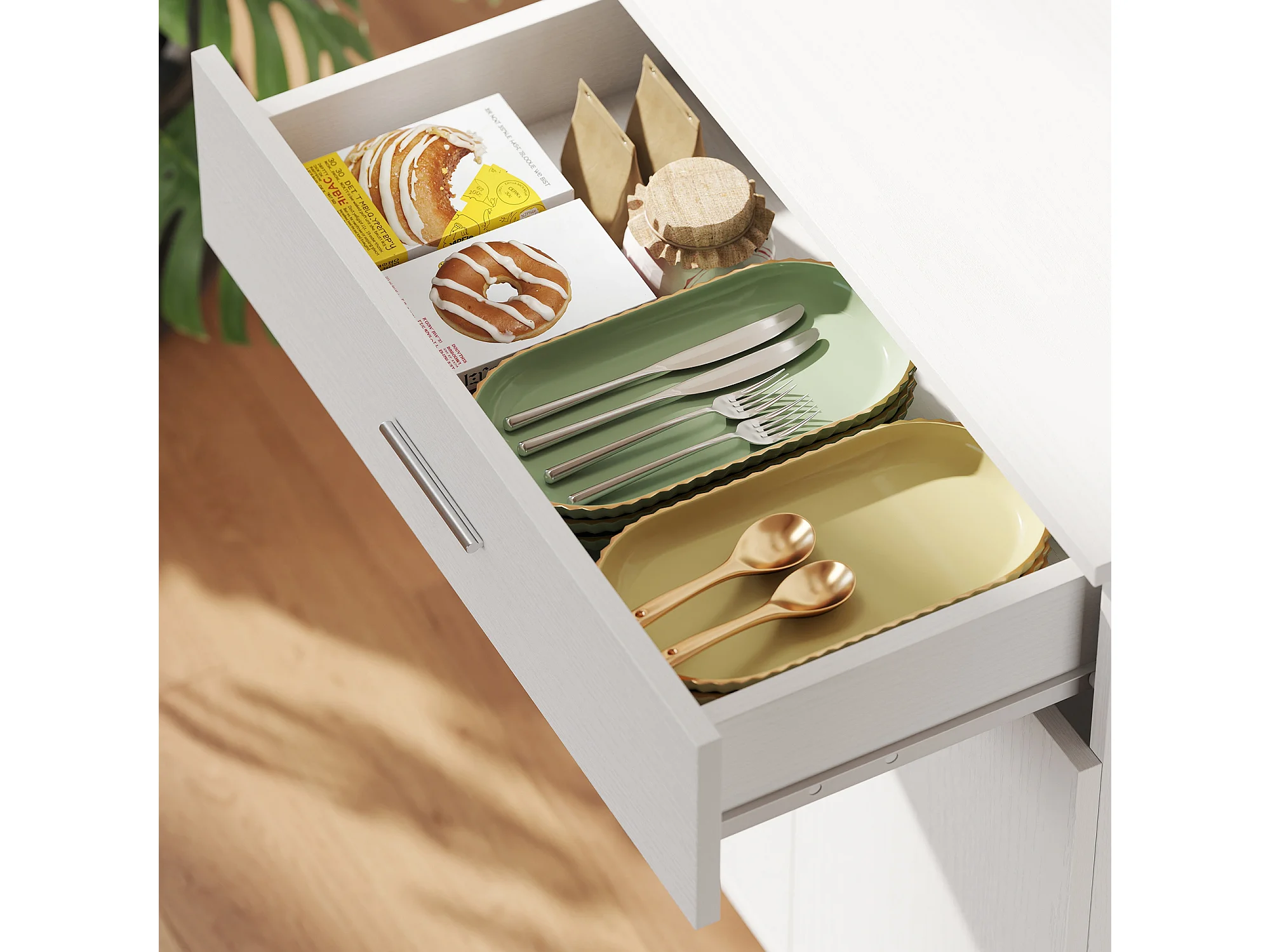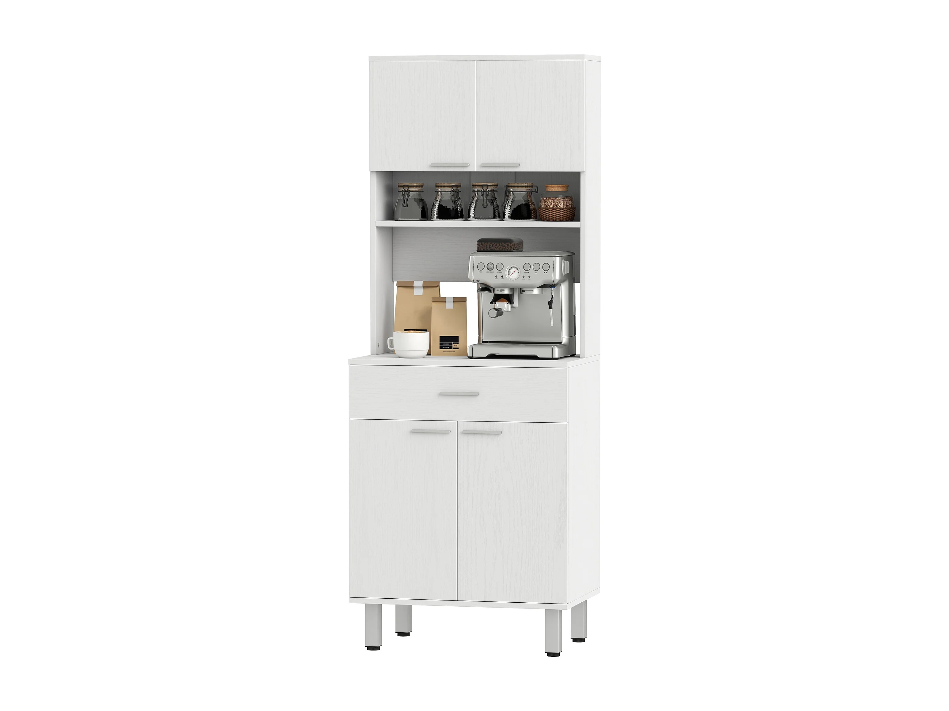 Credenza cucina alta con cassetto 4 armadietti e 3 scomparti aperti