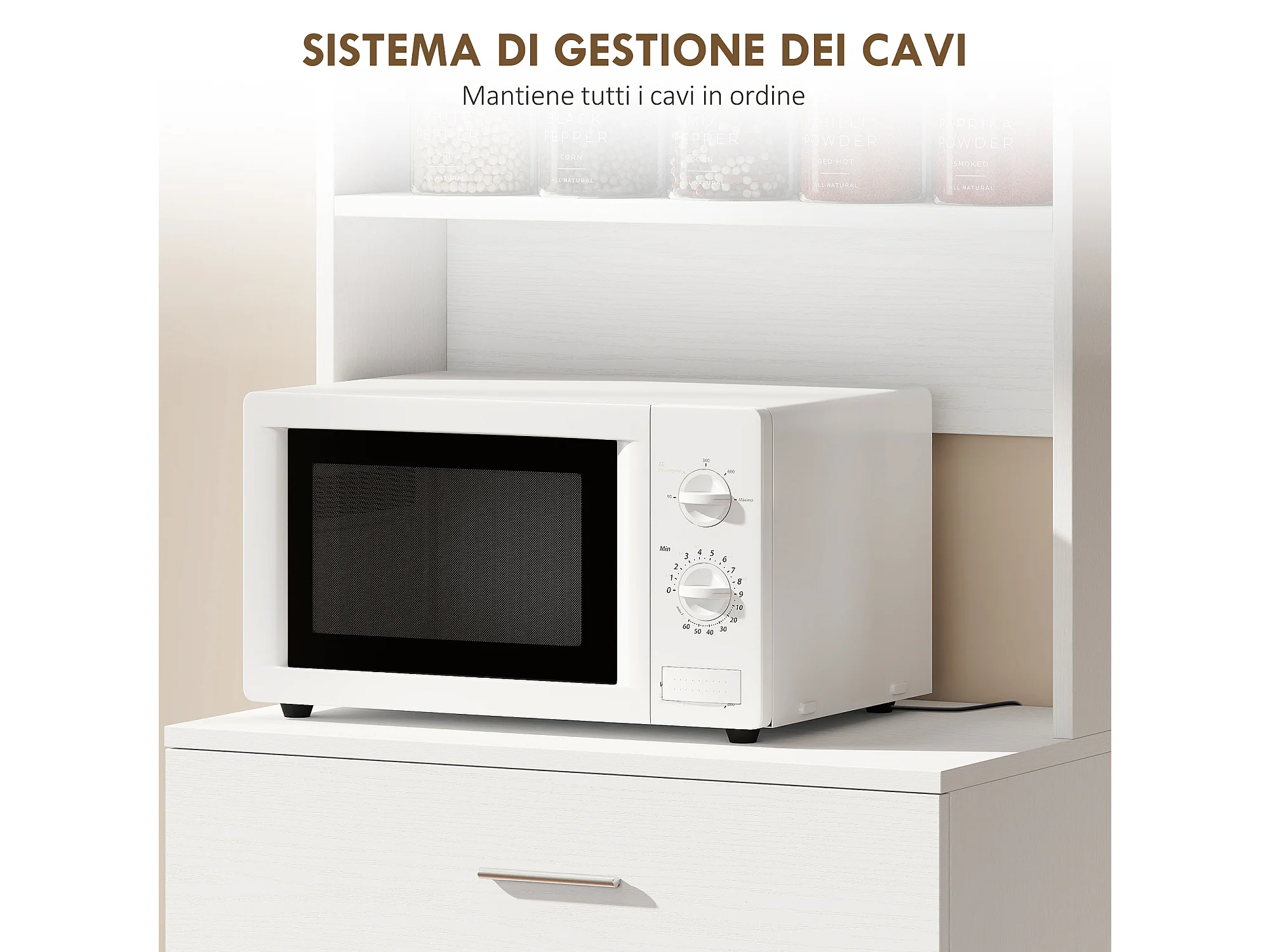 Credenza cucina alta, mobile dispensa con foro passacavi e piano portamicroonde