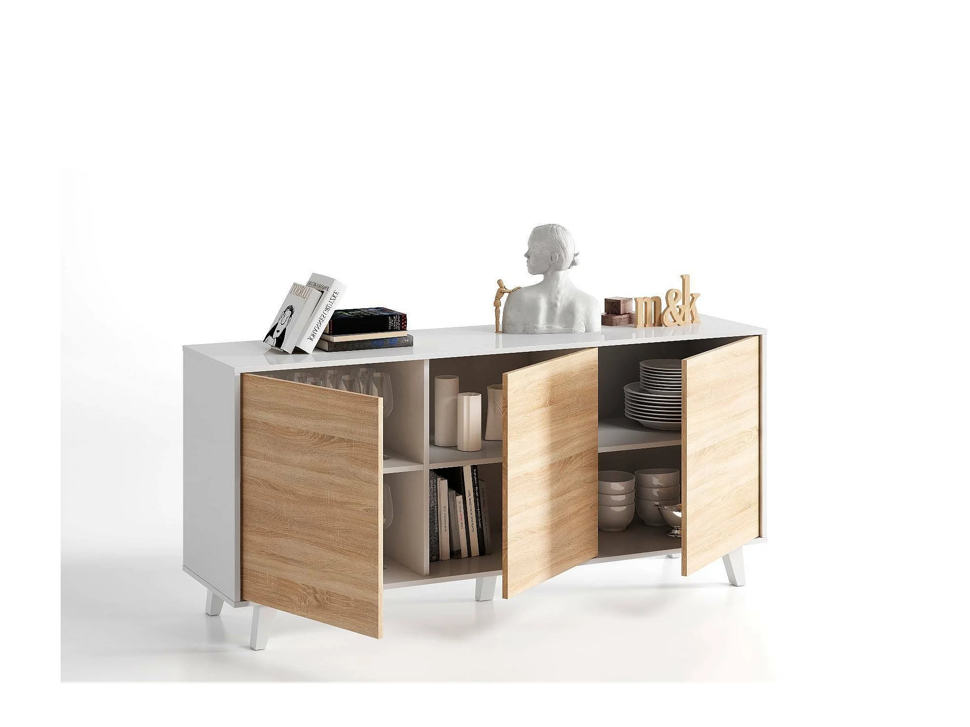 Credenza Arvada, Madia moderna a 3 ante e ripiani, Buffet da cucina, Buffet di design da soggiorno, 154x40h75 cm, Bianco e Rovere