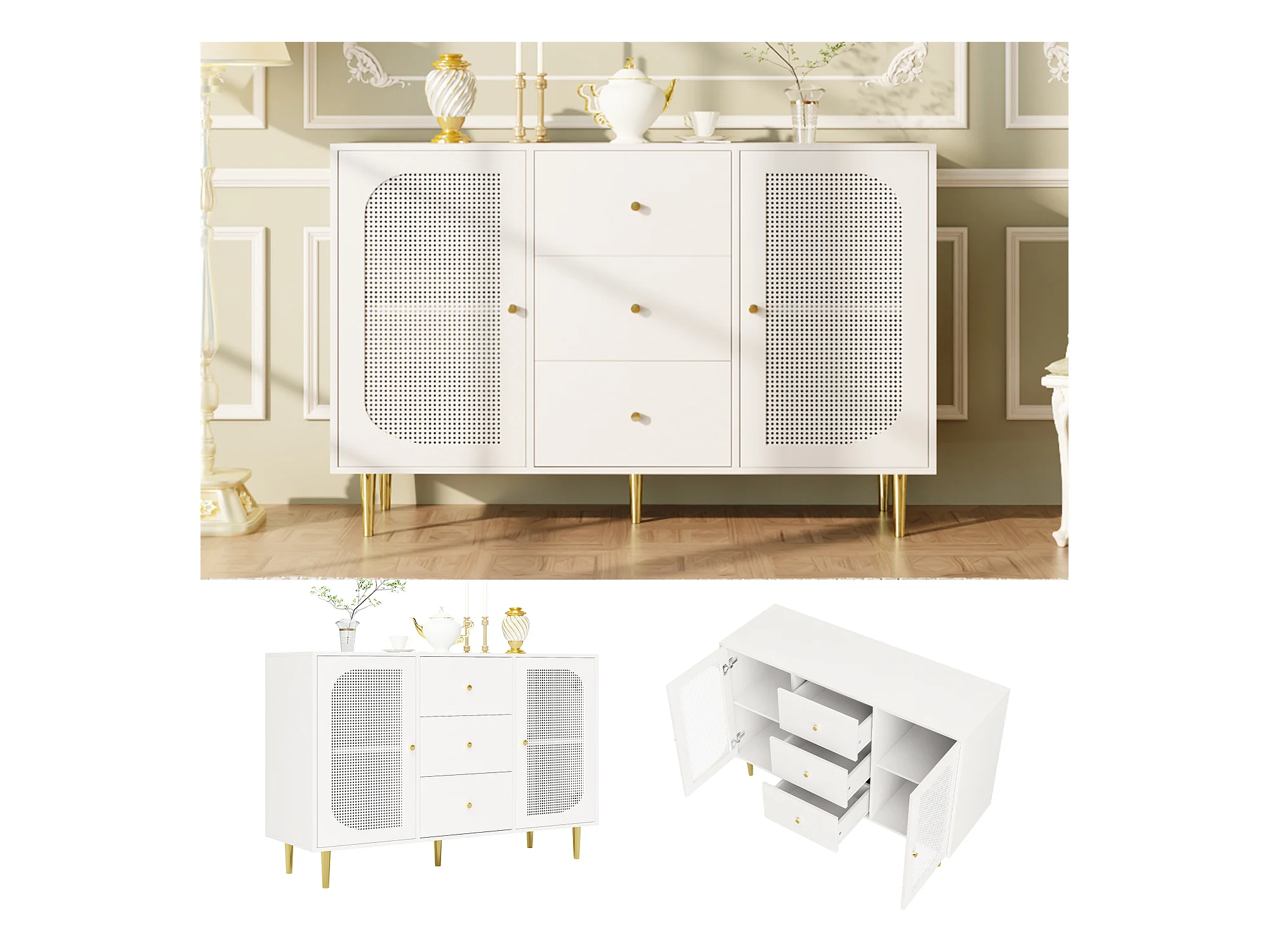 Credenza bassa con 2 ante e 3 cassetti - 120 x 40 x 90 cm - MDF e legno di rattan PE - Gambe in metallo dorato - Bianco