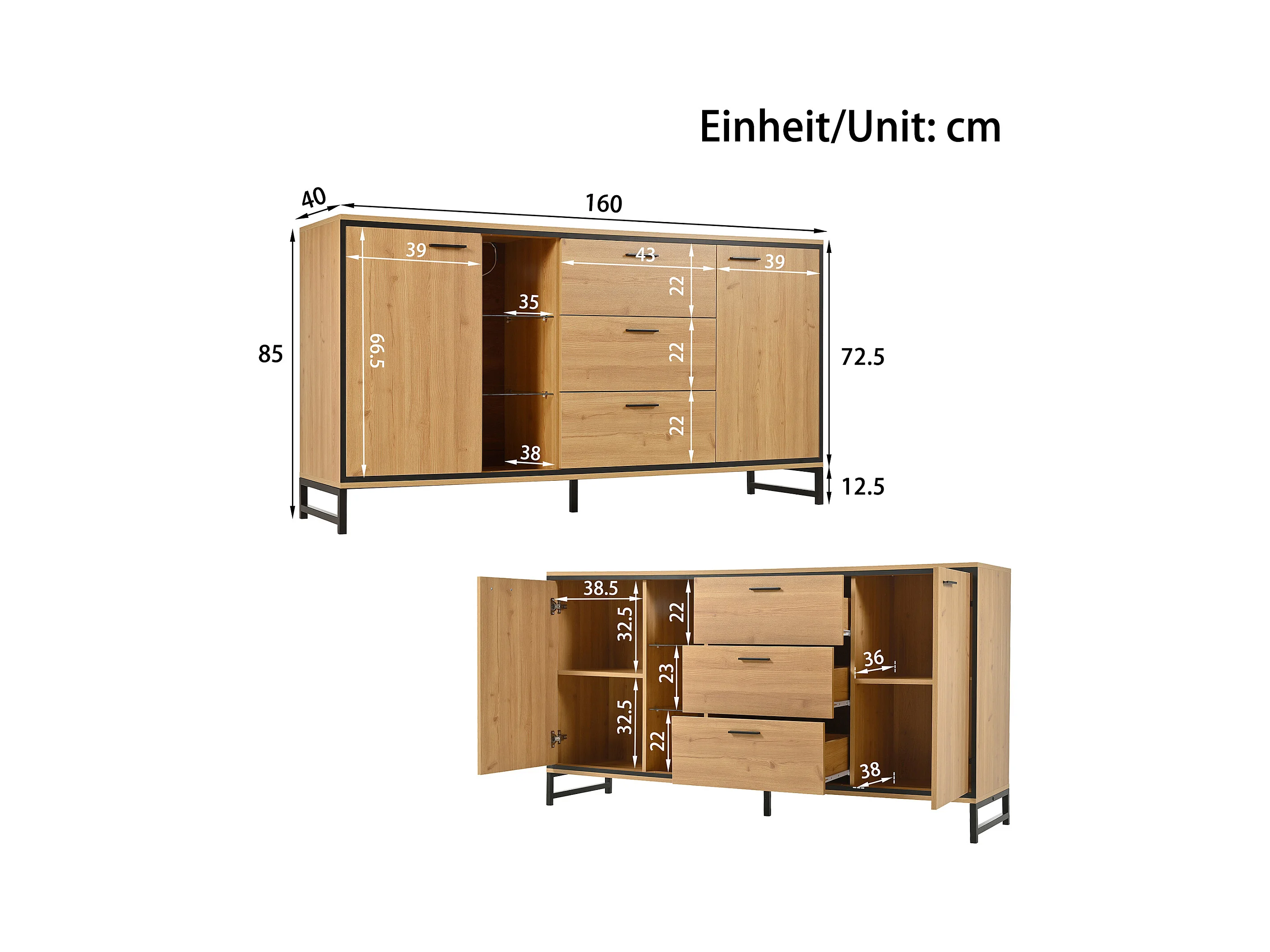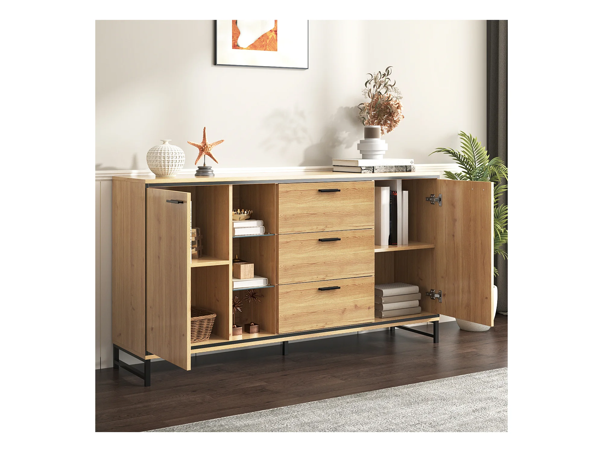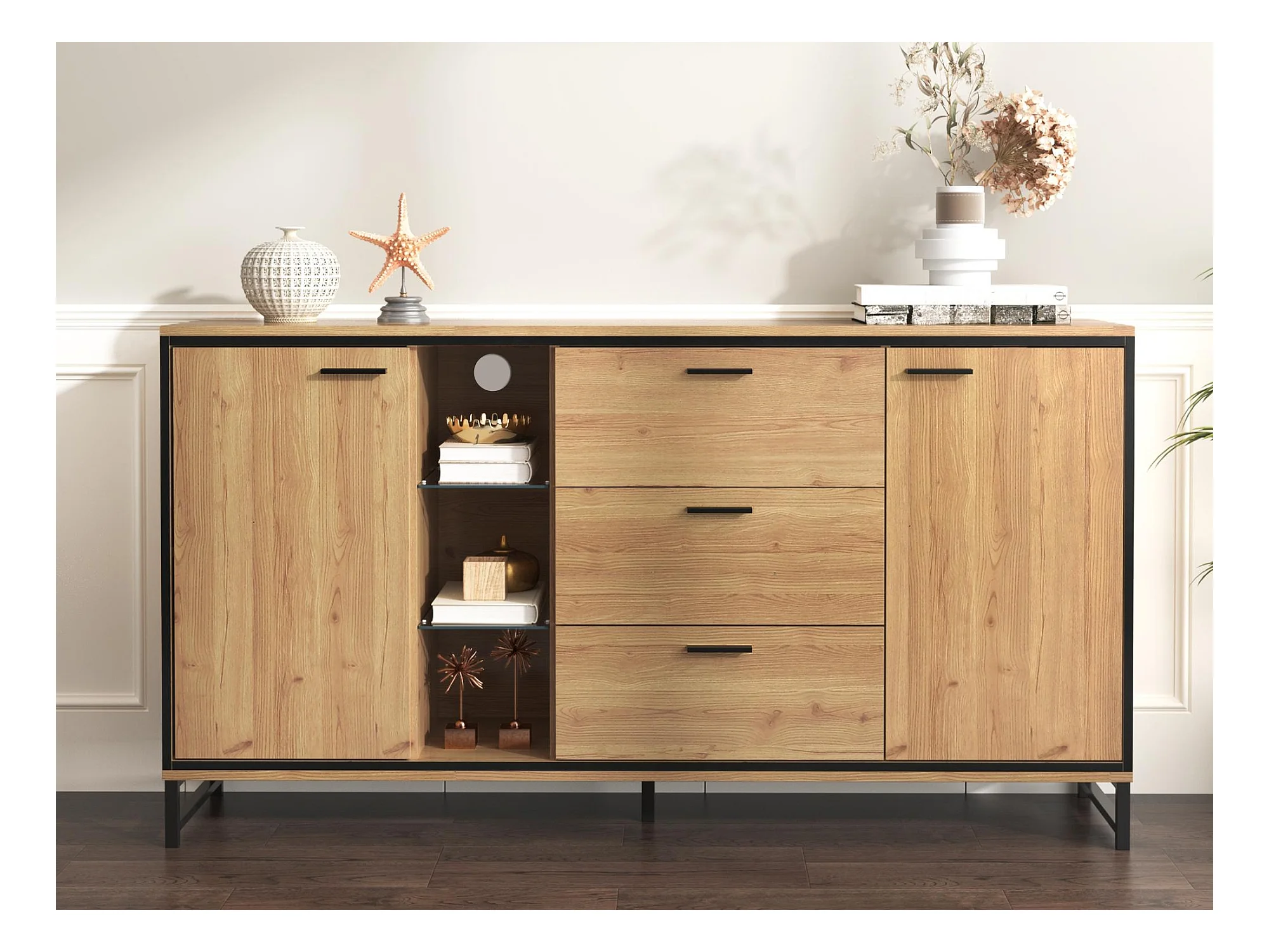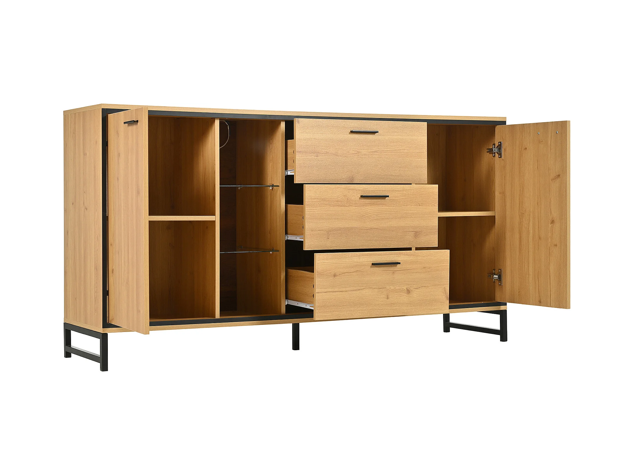 Credenza bassa con LED - 3 cassetti e 2 ante e 3 ripiani - Naturale