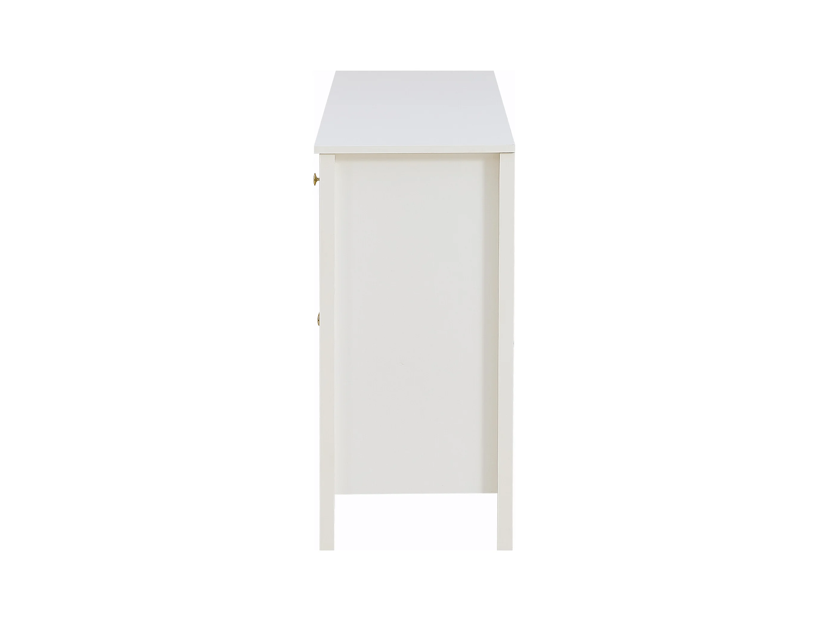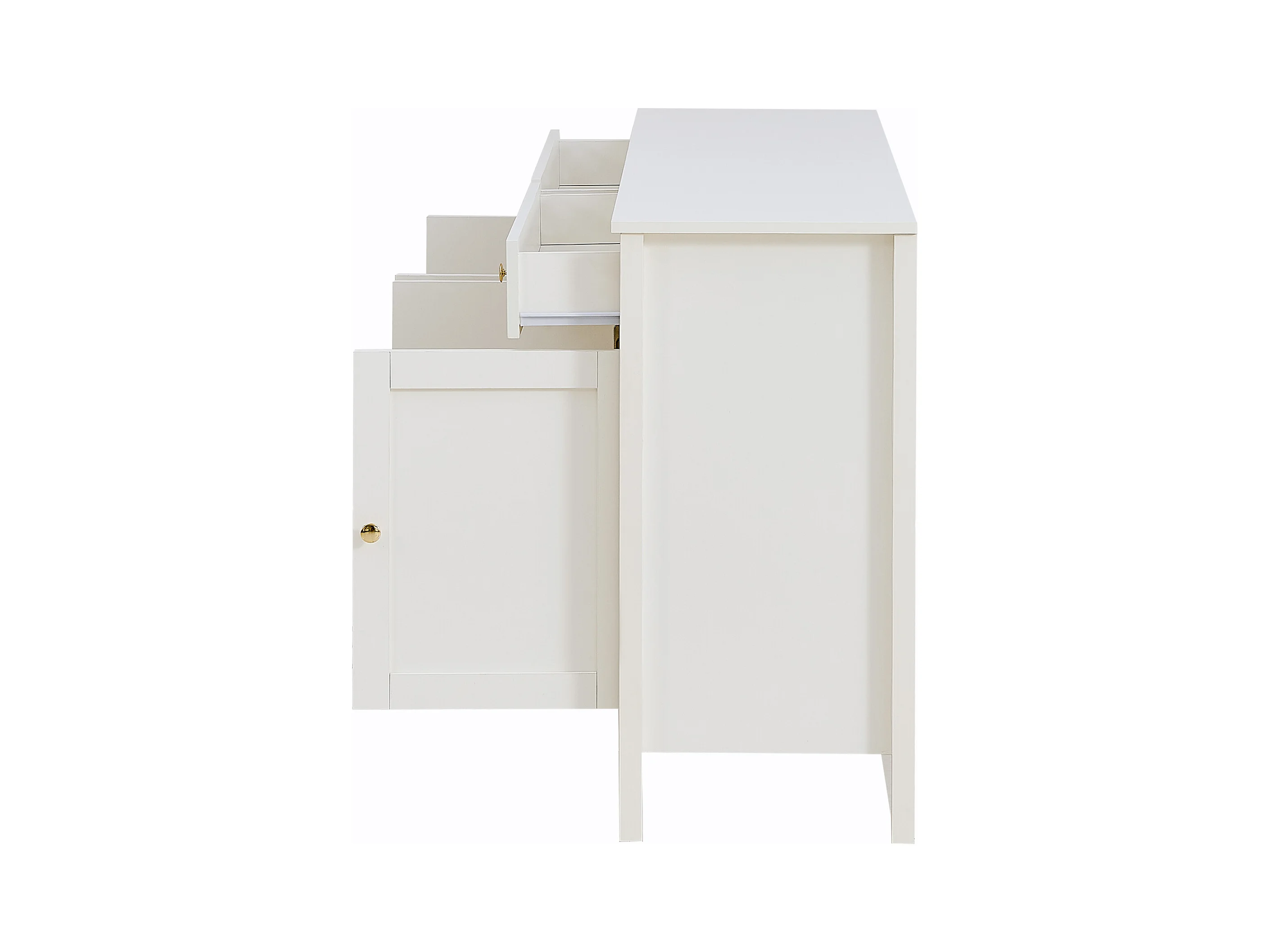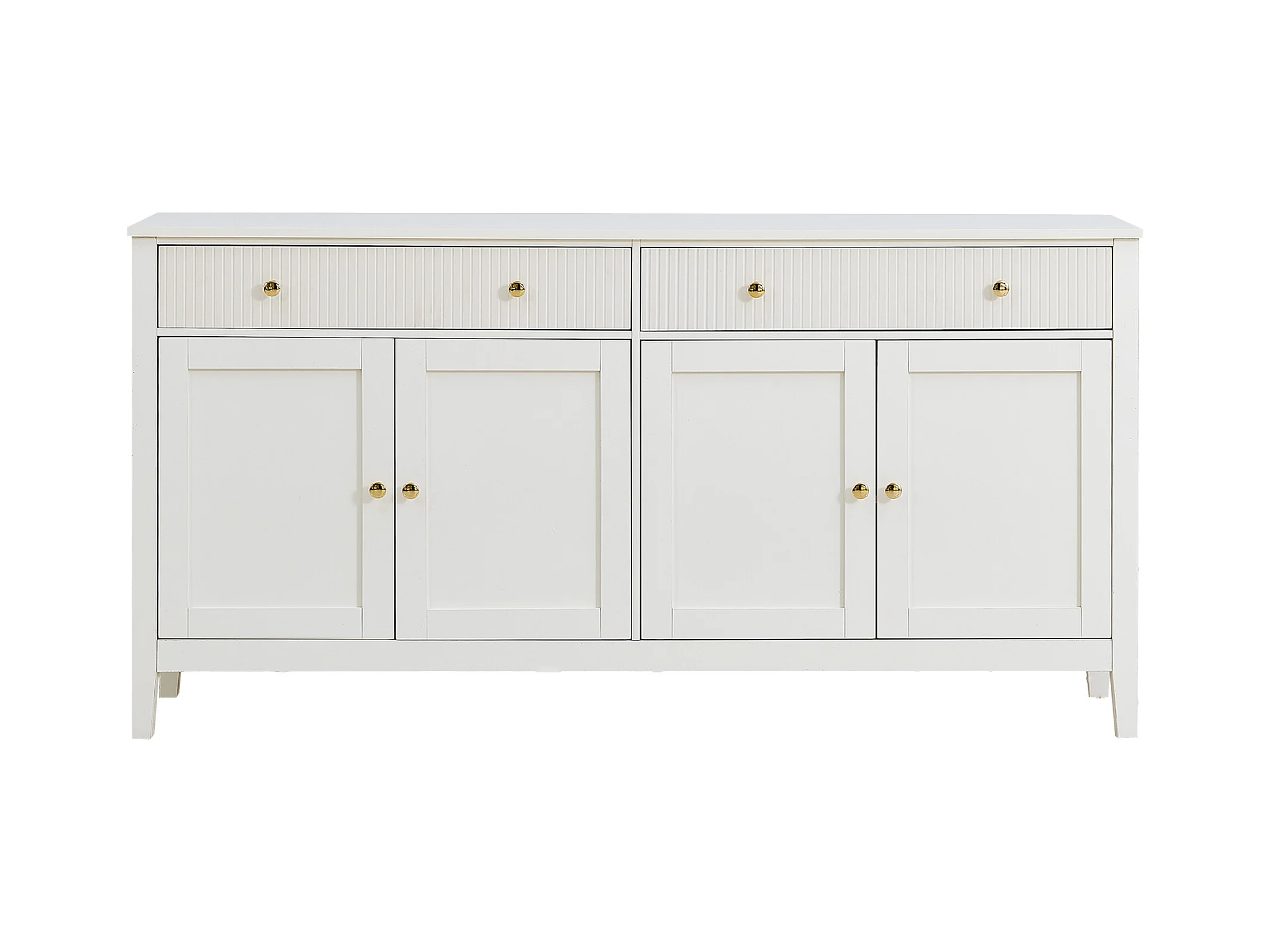 Credenza bianca con 2 cassetti e 4 ante, maniglie dorate, frontali dei cassetti verticali