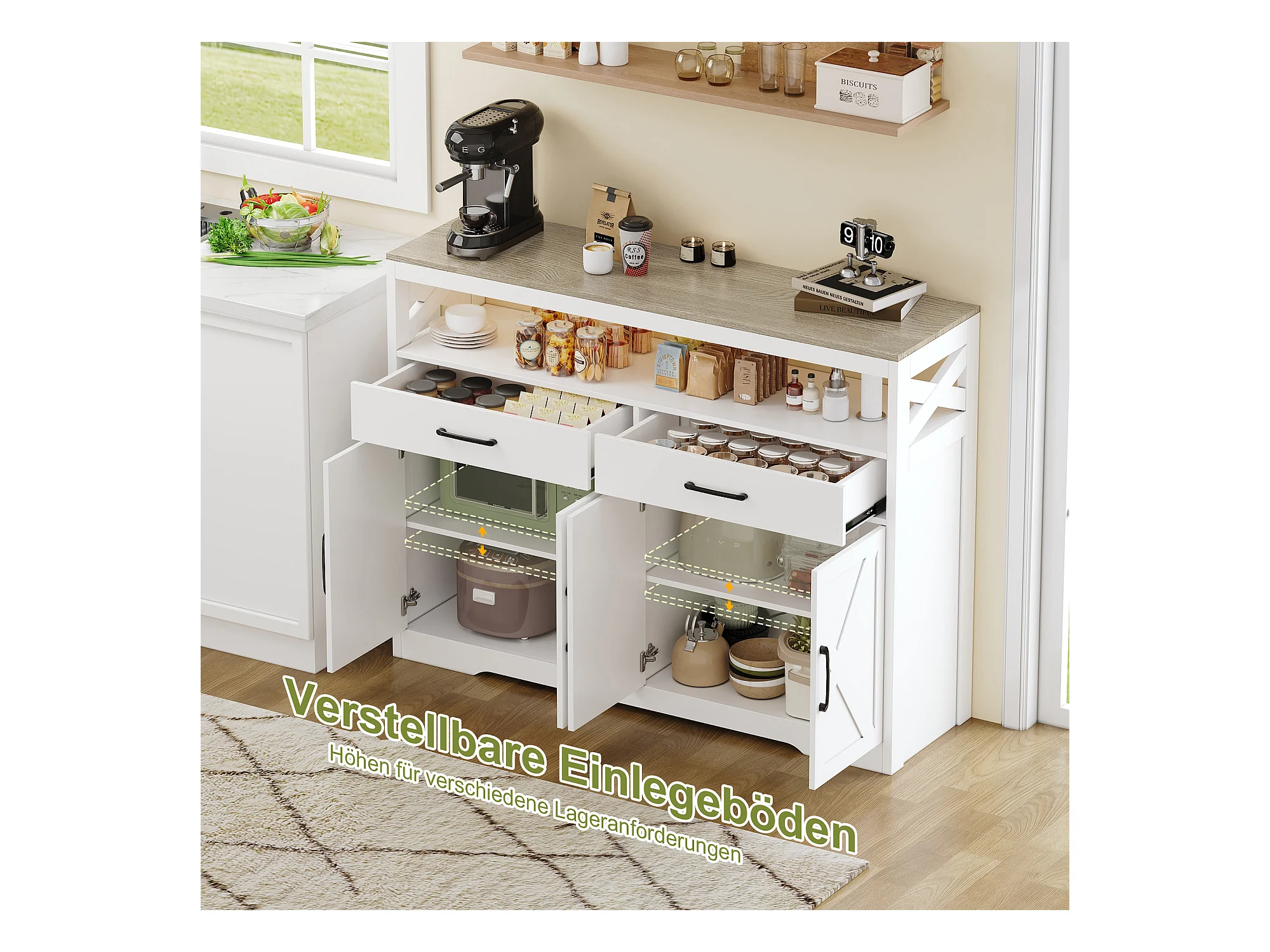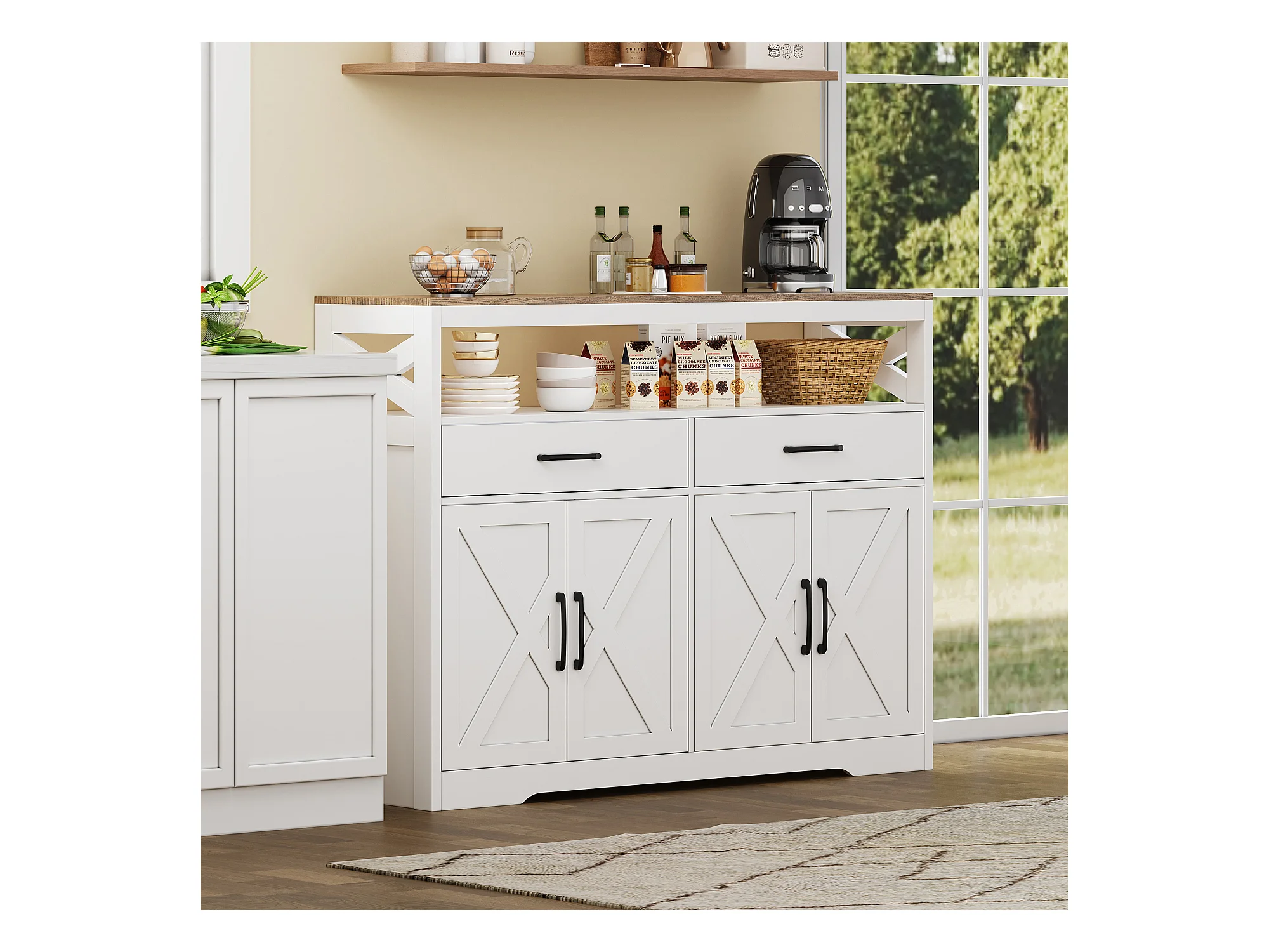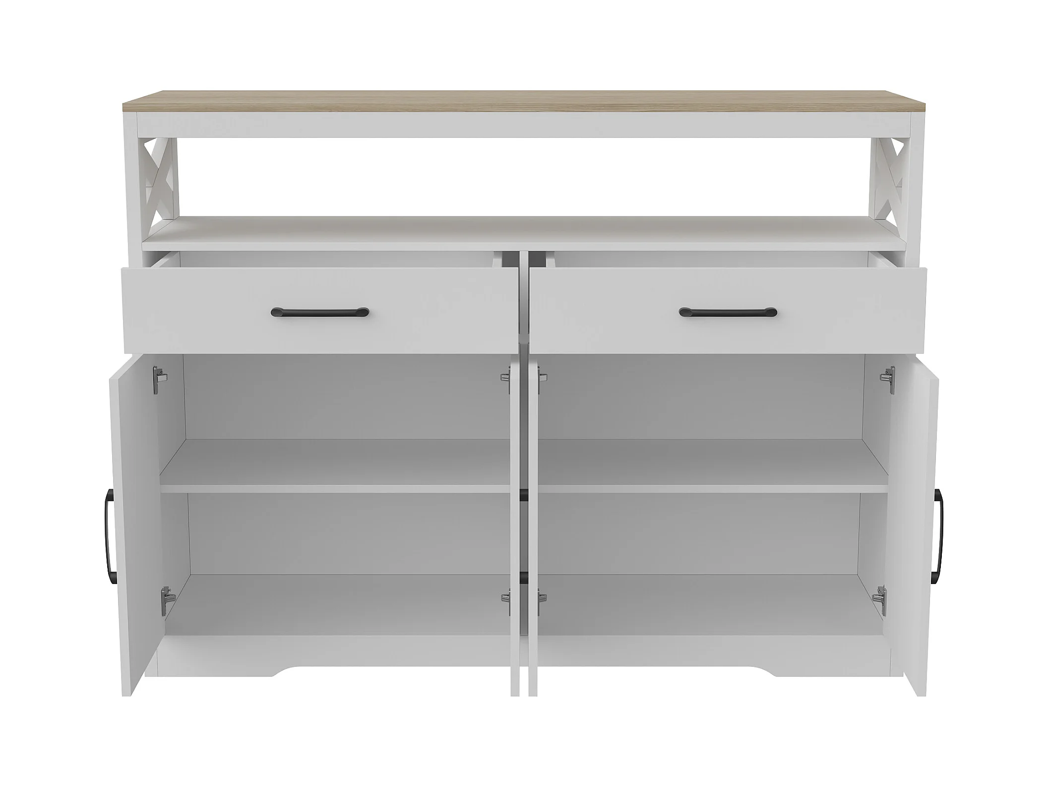 Credenza bianca e legno con 2 cassetti, 2 ante e ripiani aperti: design elegante, spazio funzionale e salvaspazio