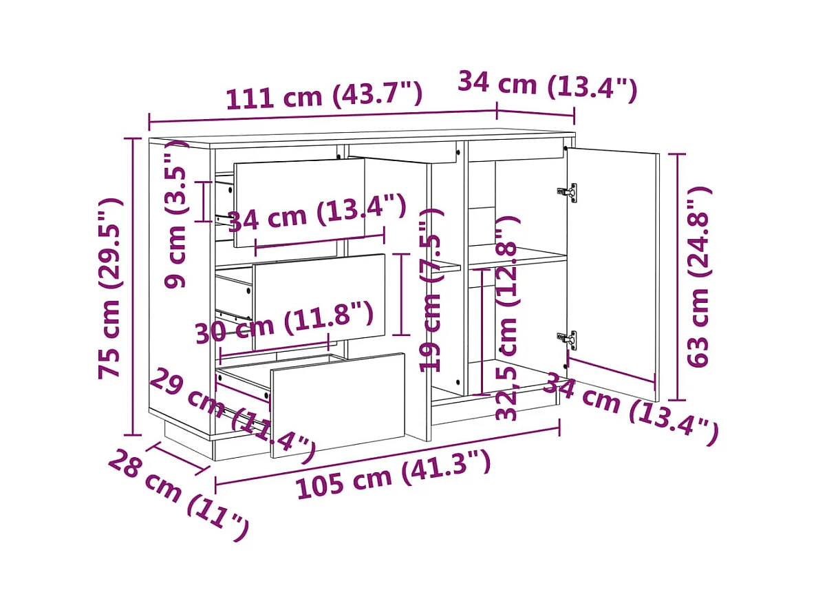 Credenza buffet cassettiera mobile contenitore organizer cucina soggiorno soggiorno 111 x 34 x 75 cm legno di pino massiccio marrone 02_0029524