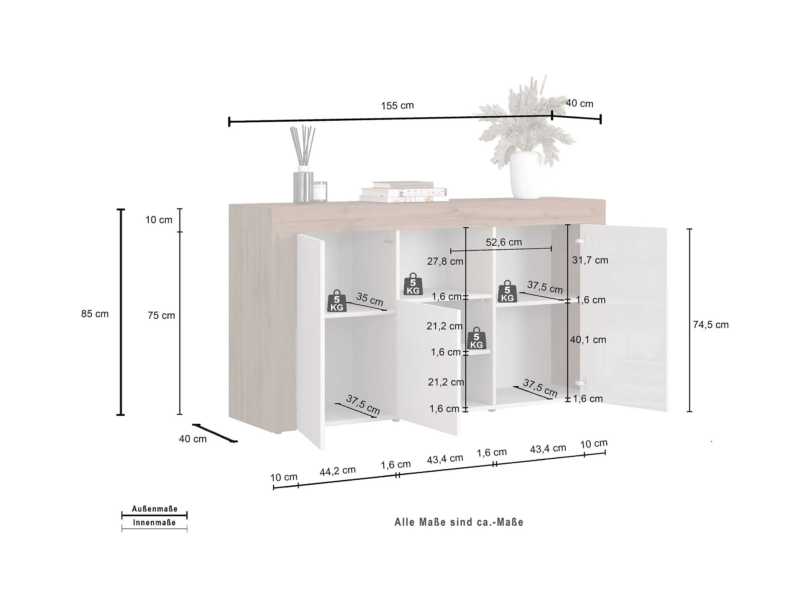 Credenza Garda a 3 ante e 3 cassetti antracite opaco/rovere 102x35x110 cm