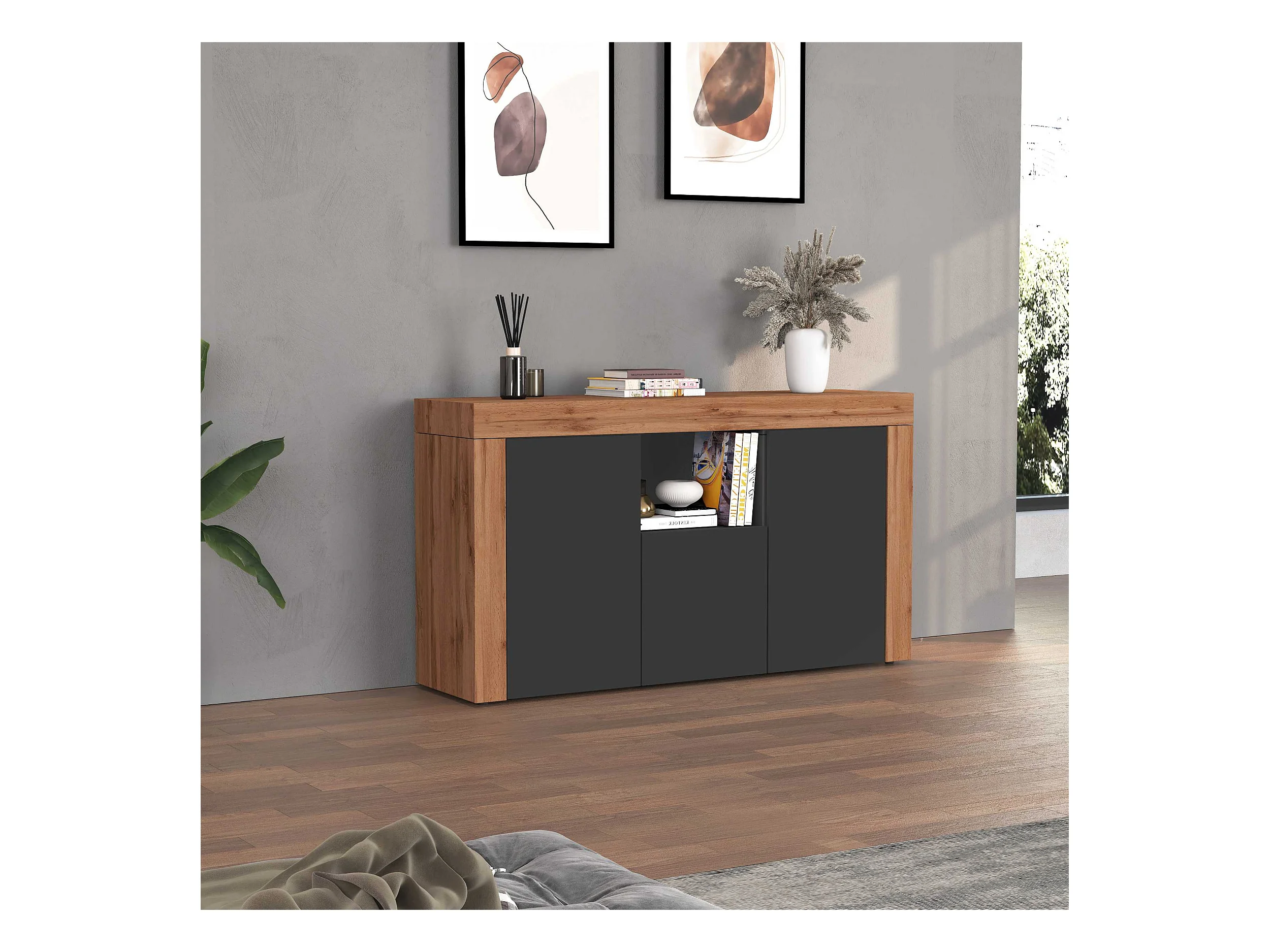 Credenza Garda 3 ante e 1 cassetto antracite opaco e rovere 120,1x35x70 cm