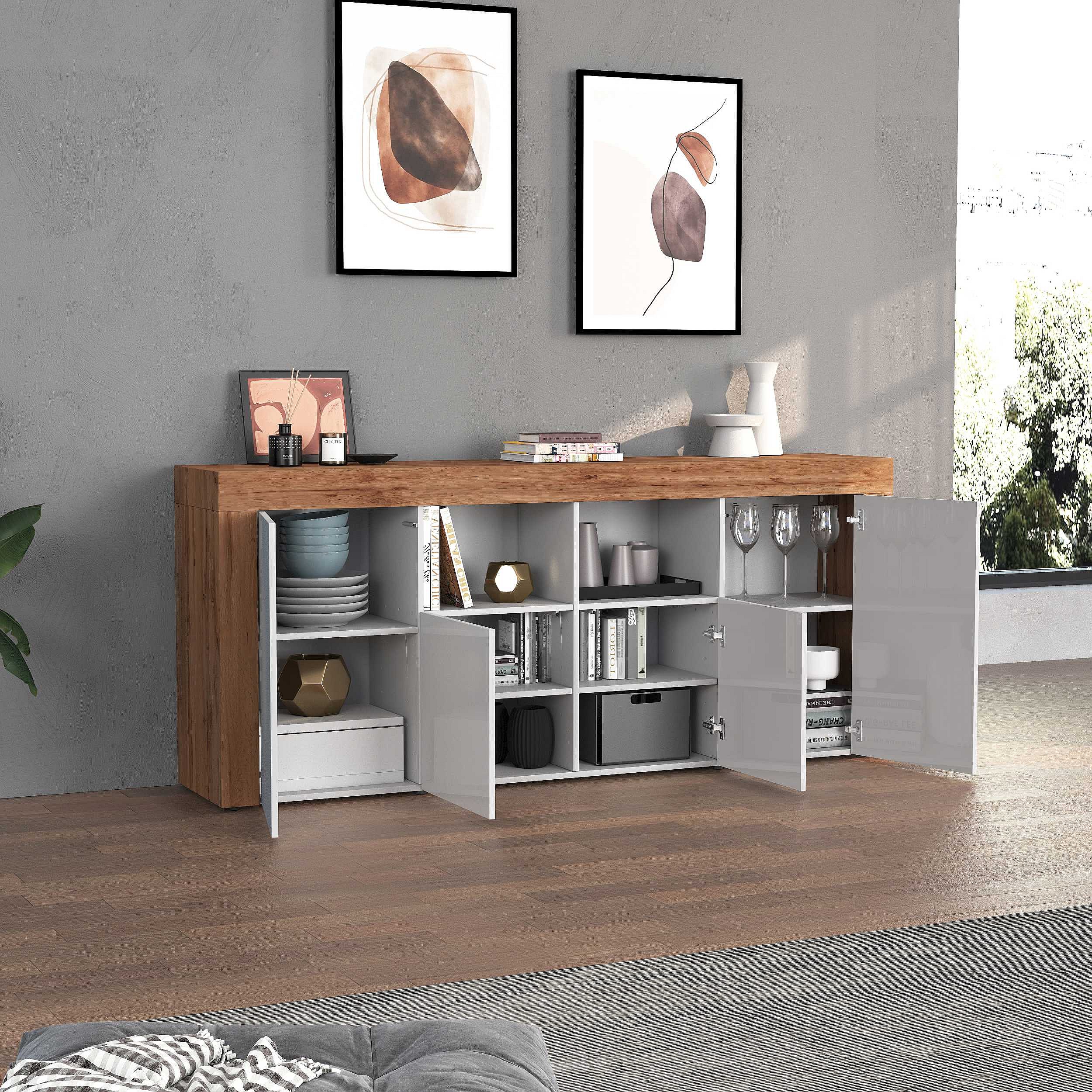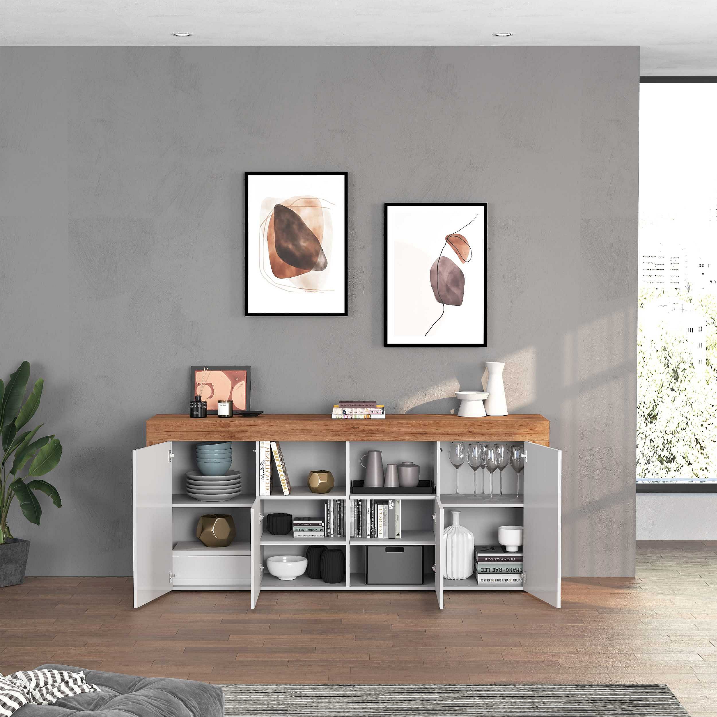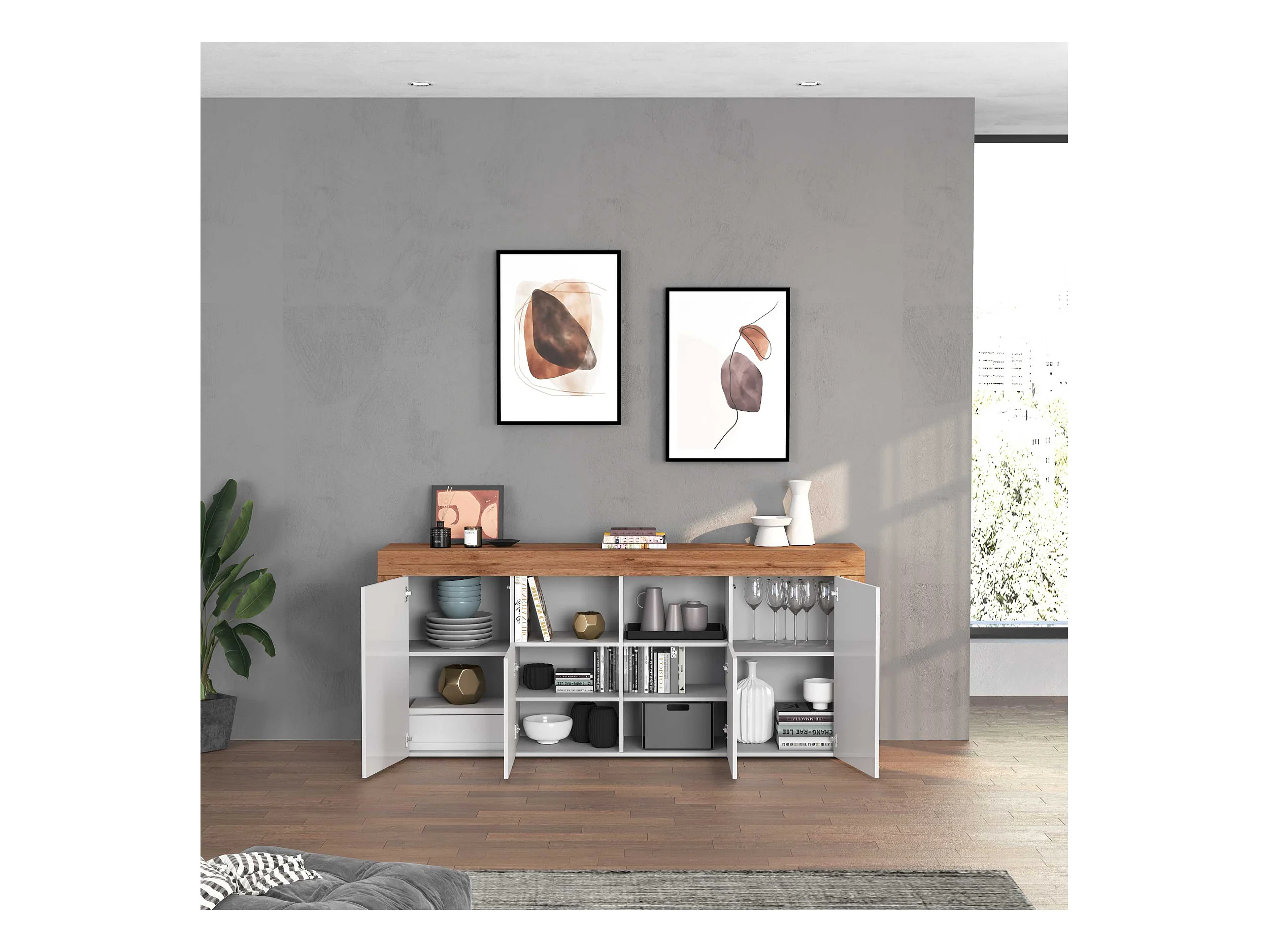 Credenza Chronos 4 ante e 2 vani bianco lucido e rovere 200x40x85 cm