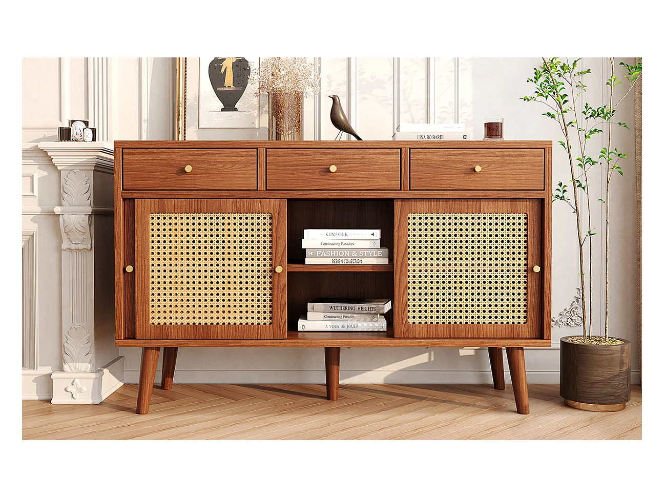 Credenza in legno con ante in rattan, 3 cassetti, MDF, rovere, (140x40x78 cm)