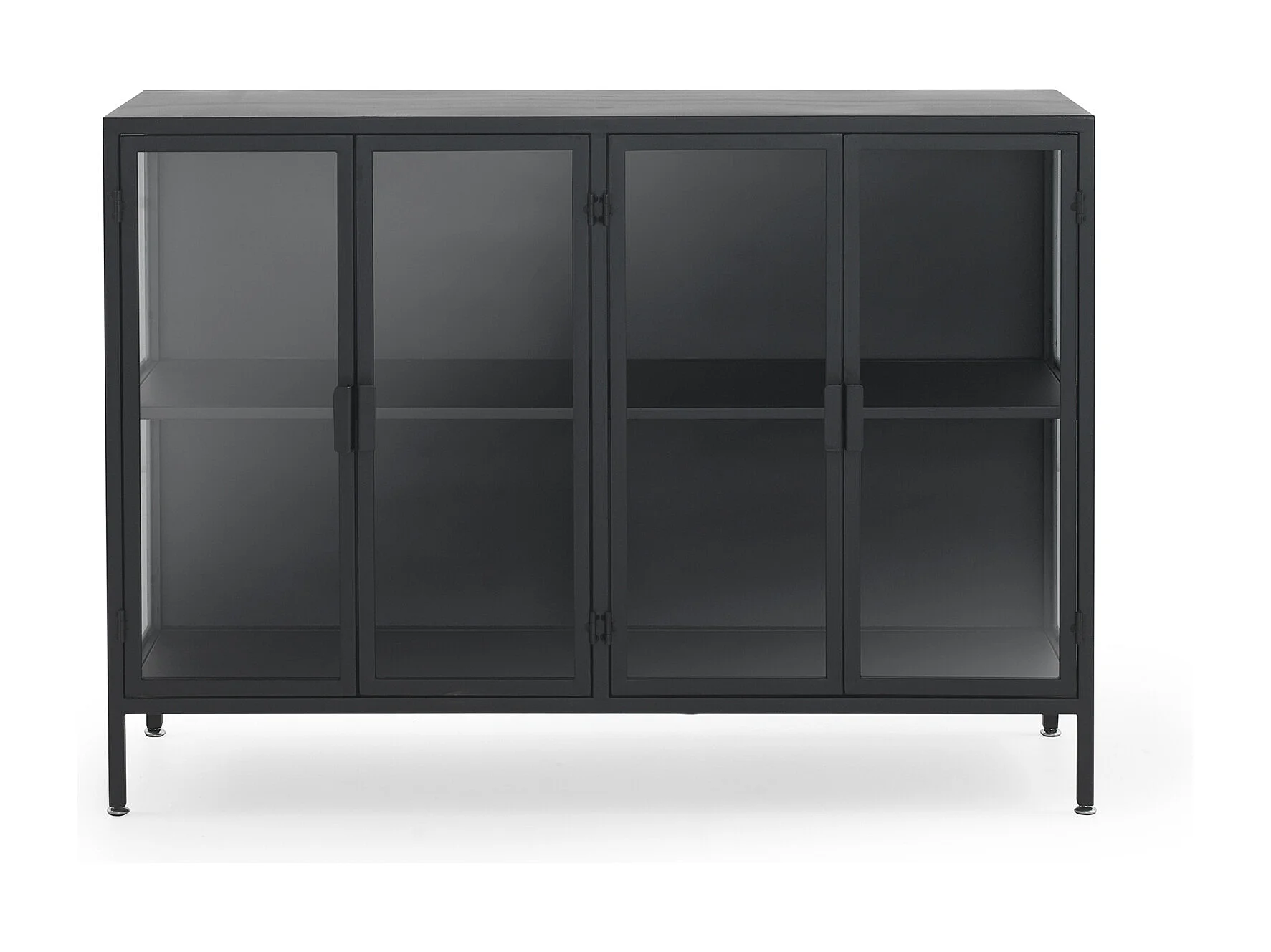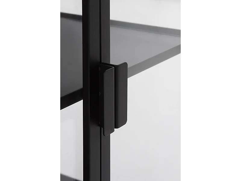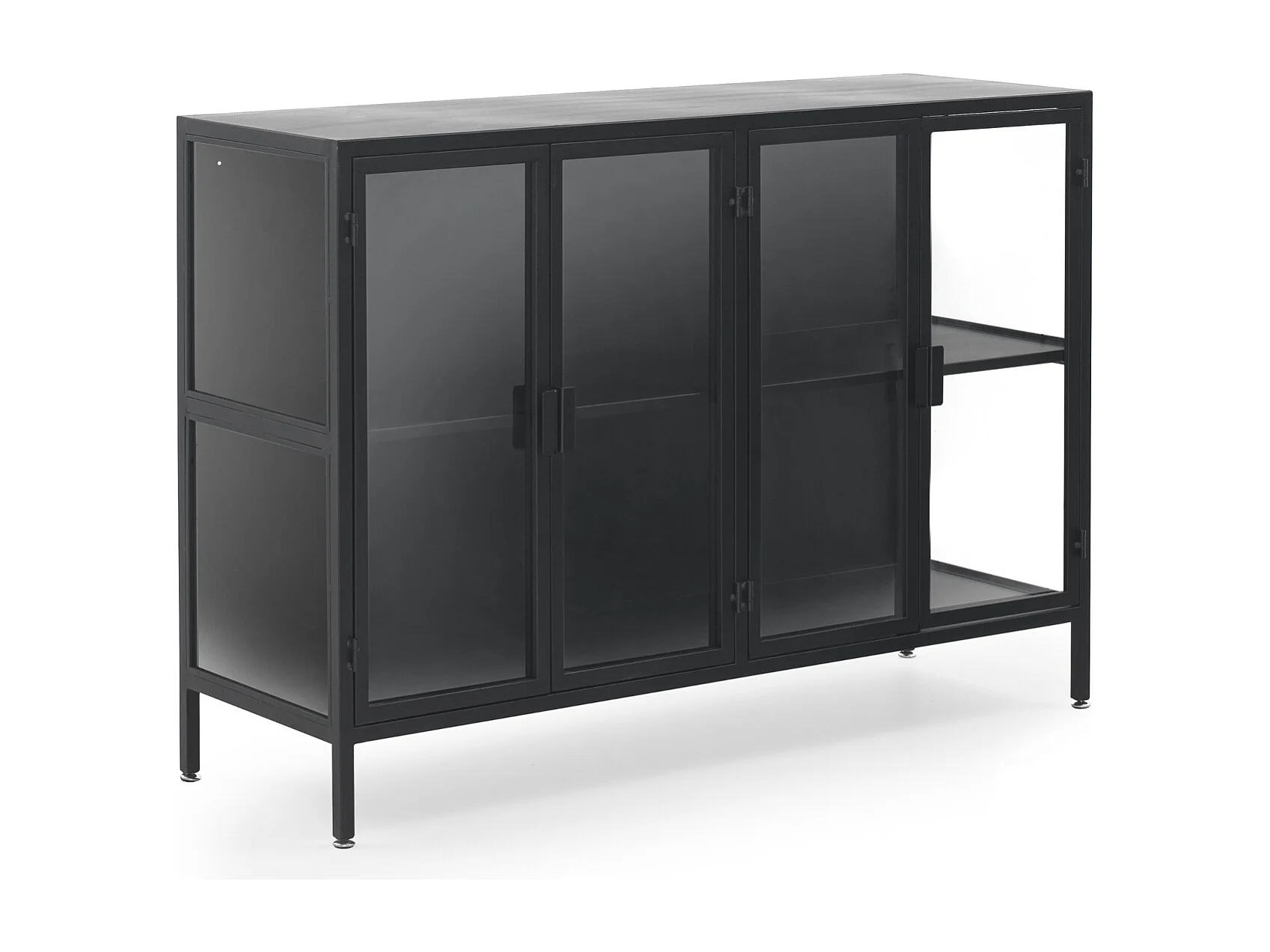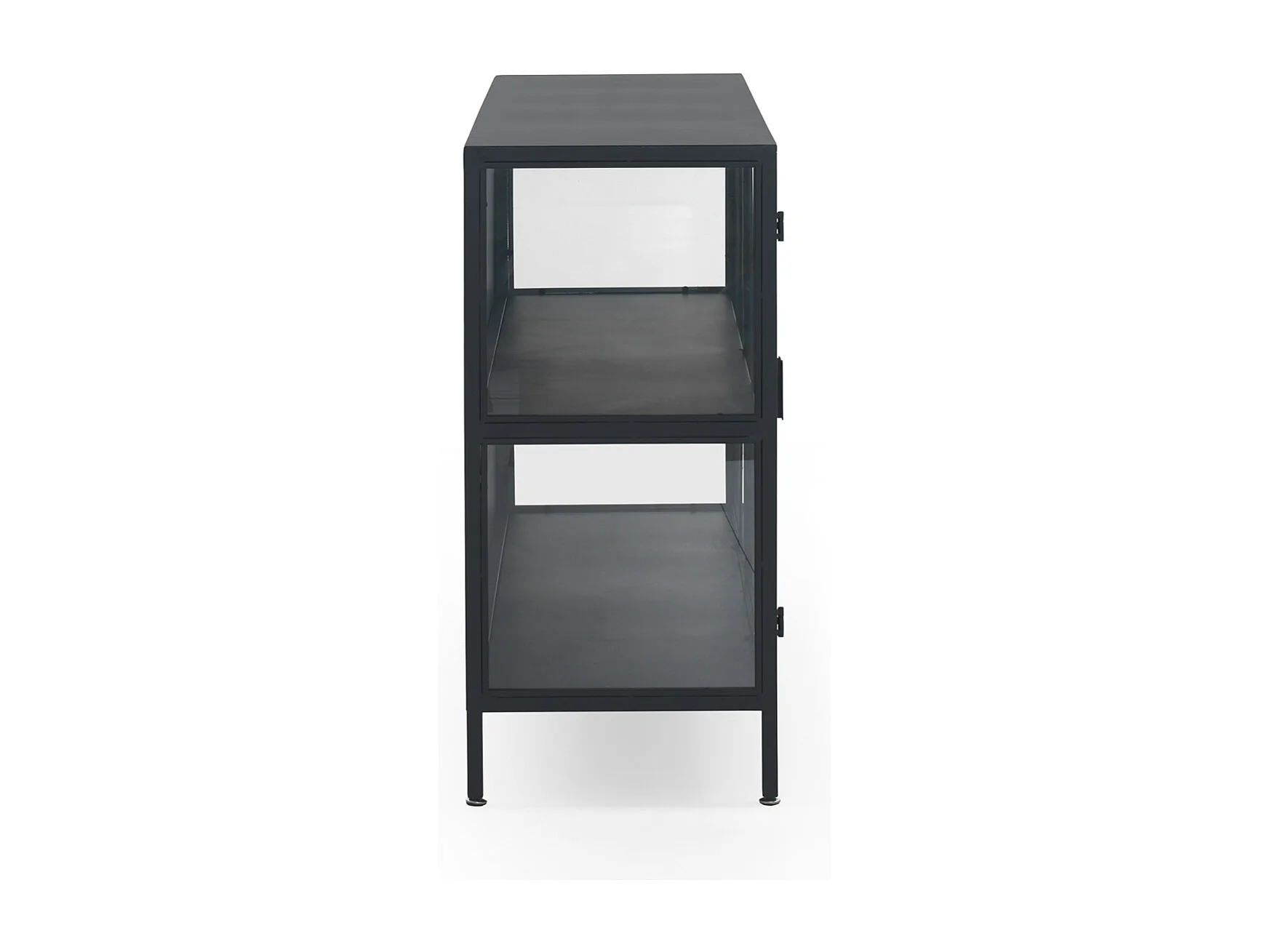 Credenza con ante e fianchi in vetro, struttura in metallo nero