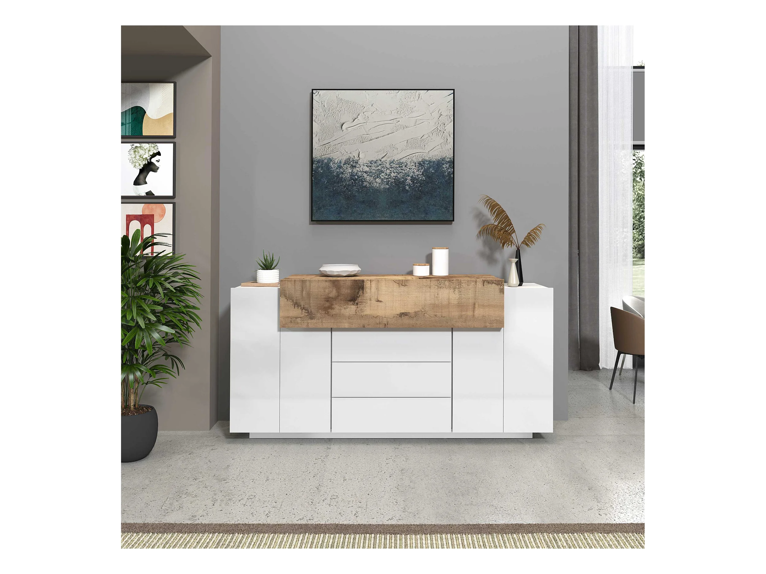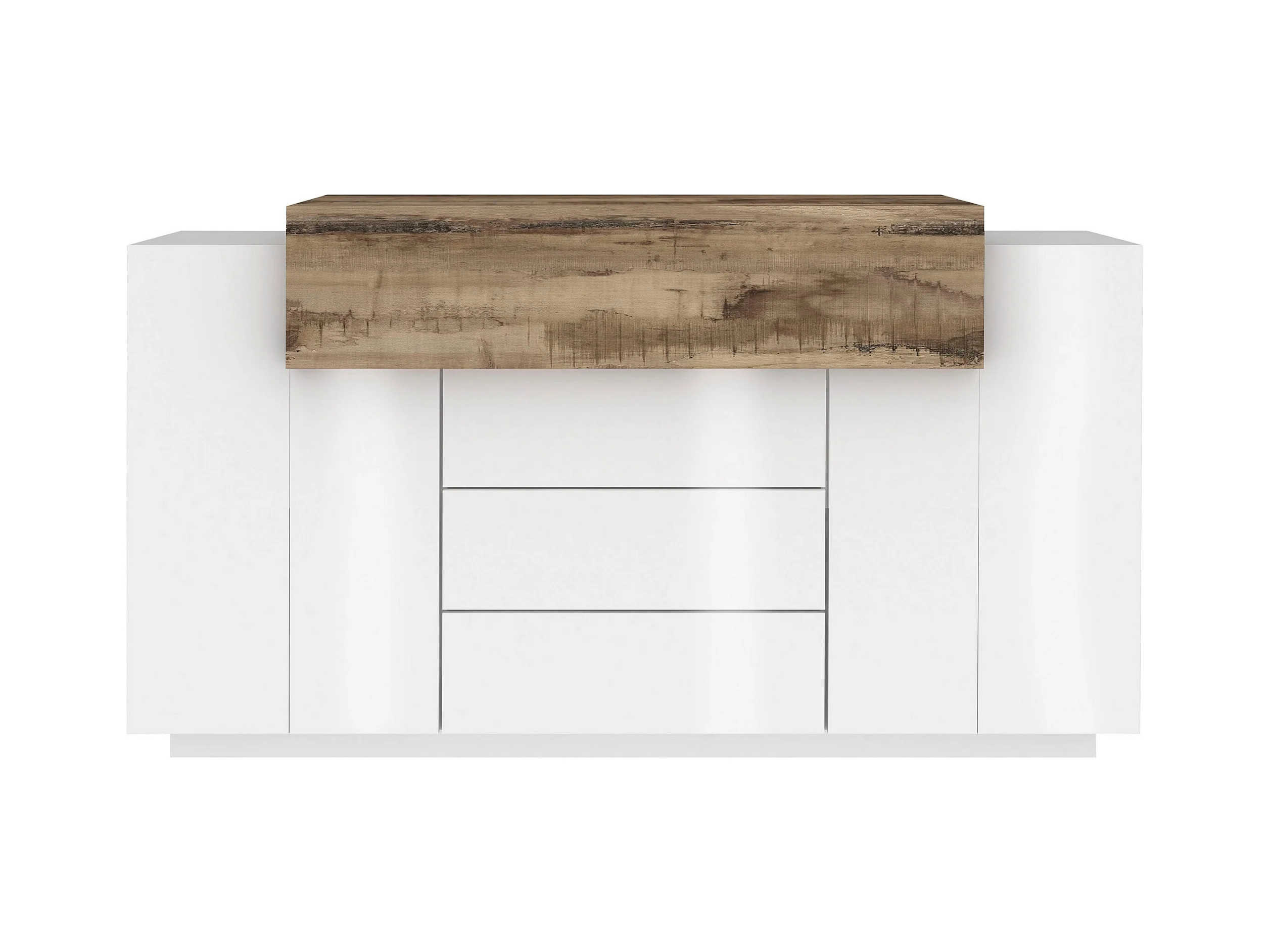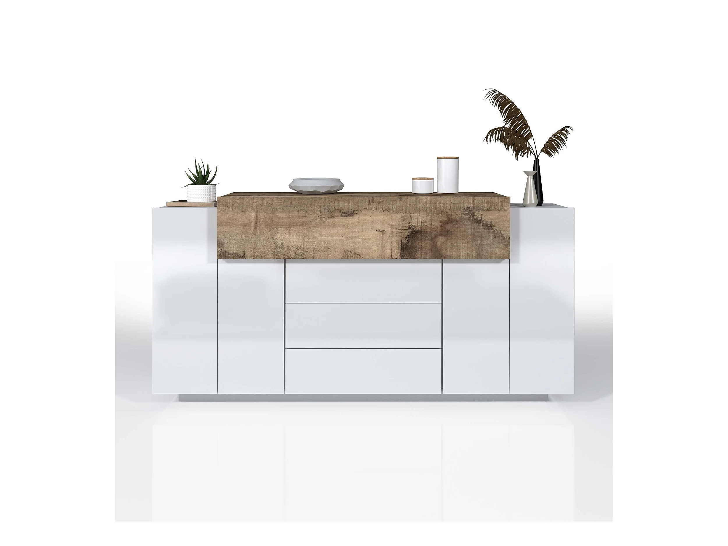 Credenza Garda 4 ante e 2 cassetti bianco lucido e rovere 160,1x35x70 cm