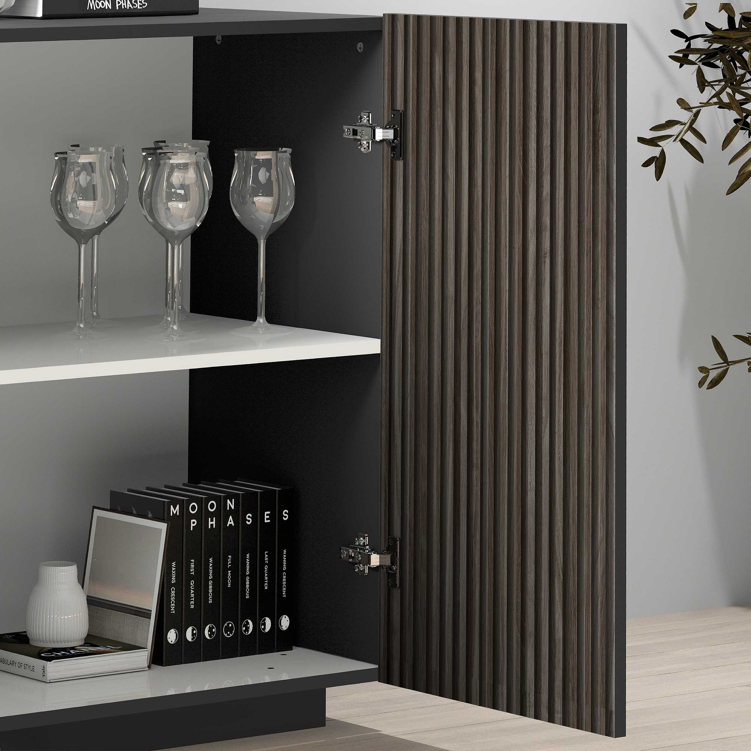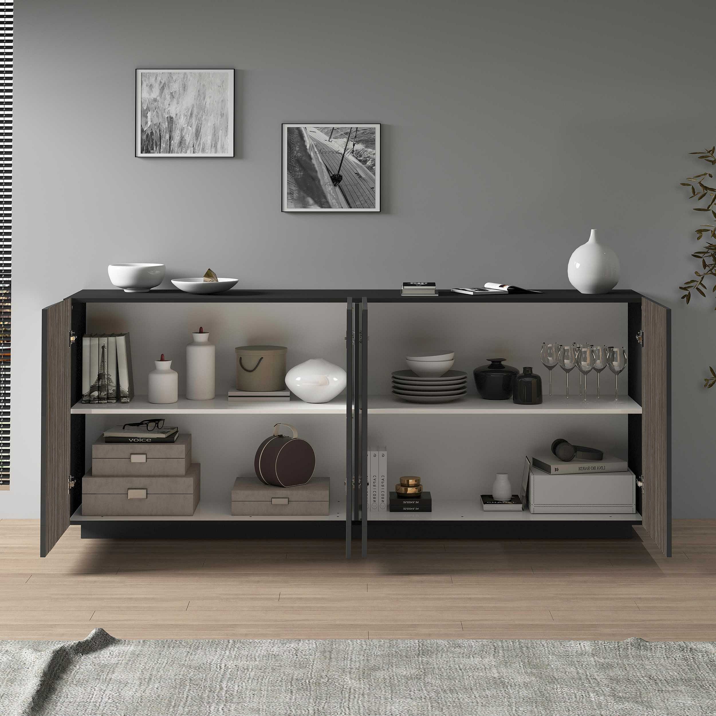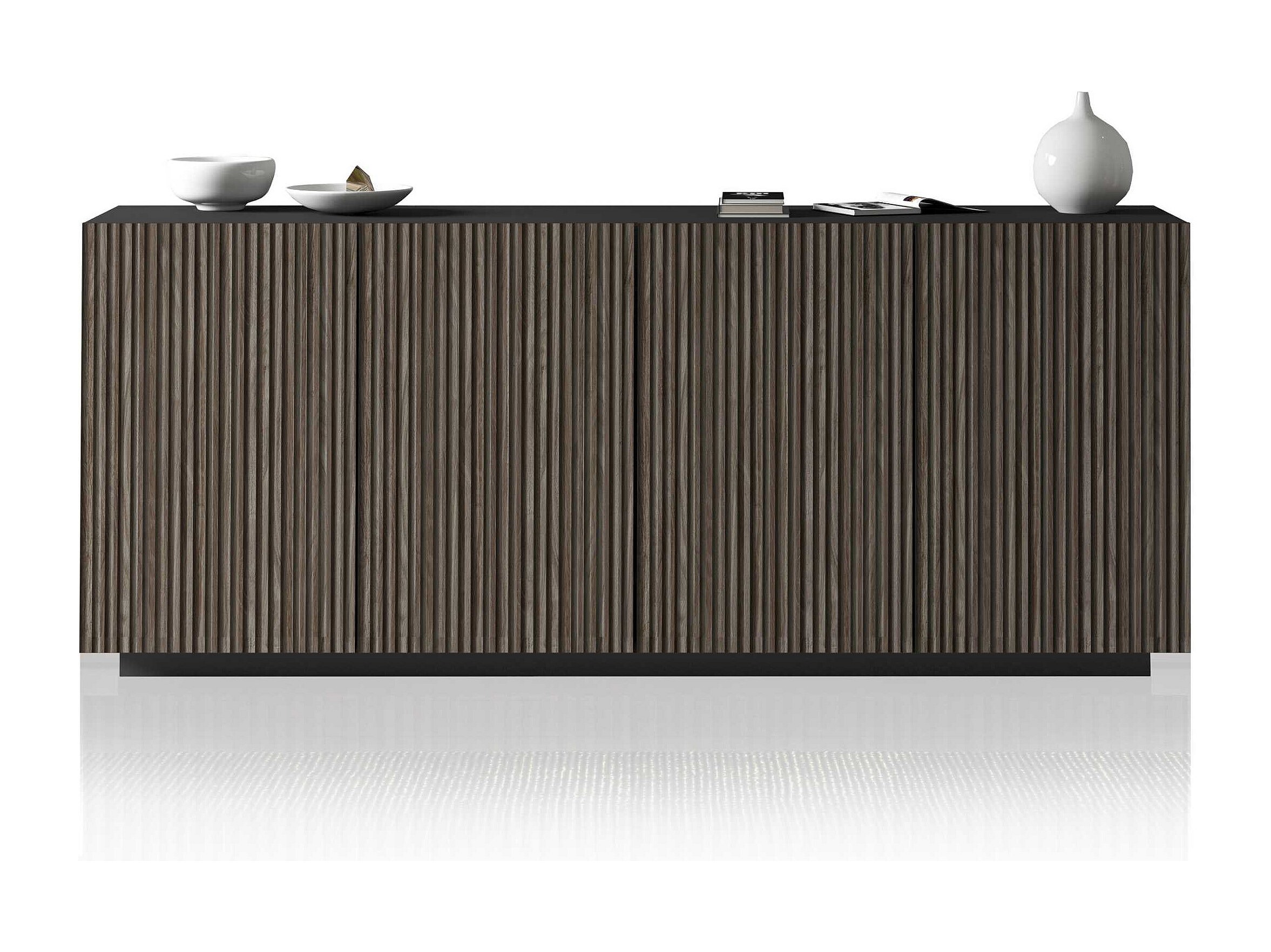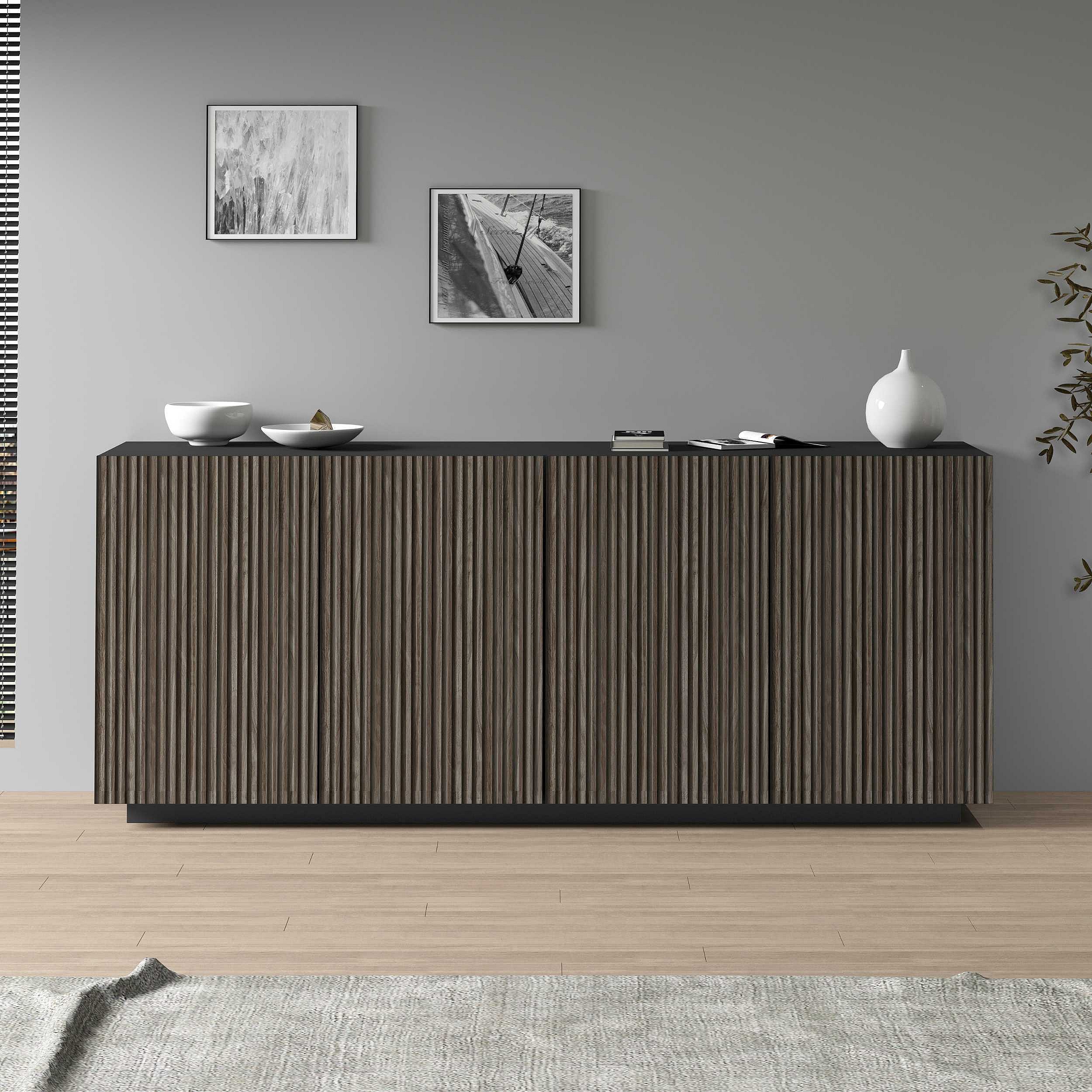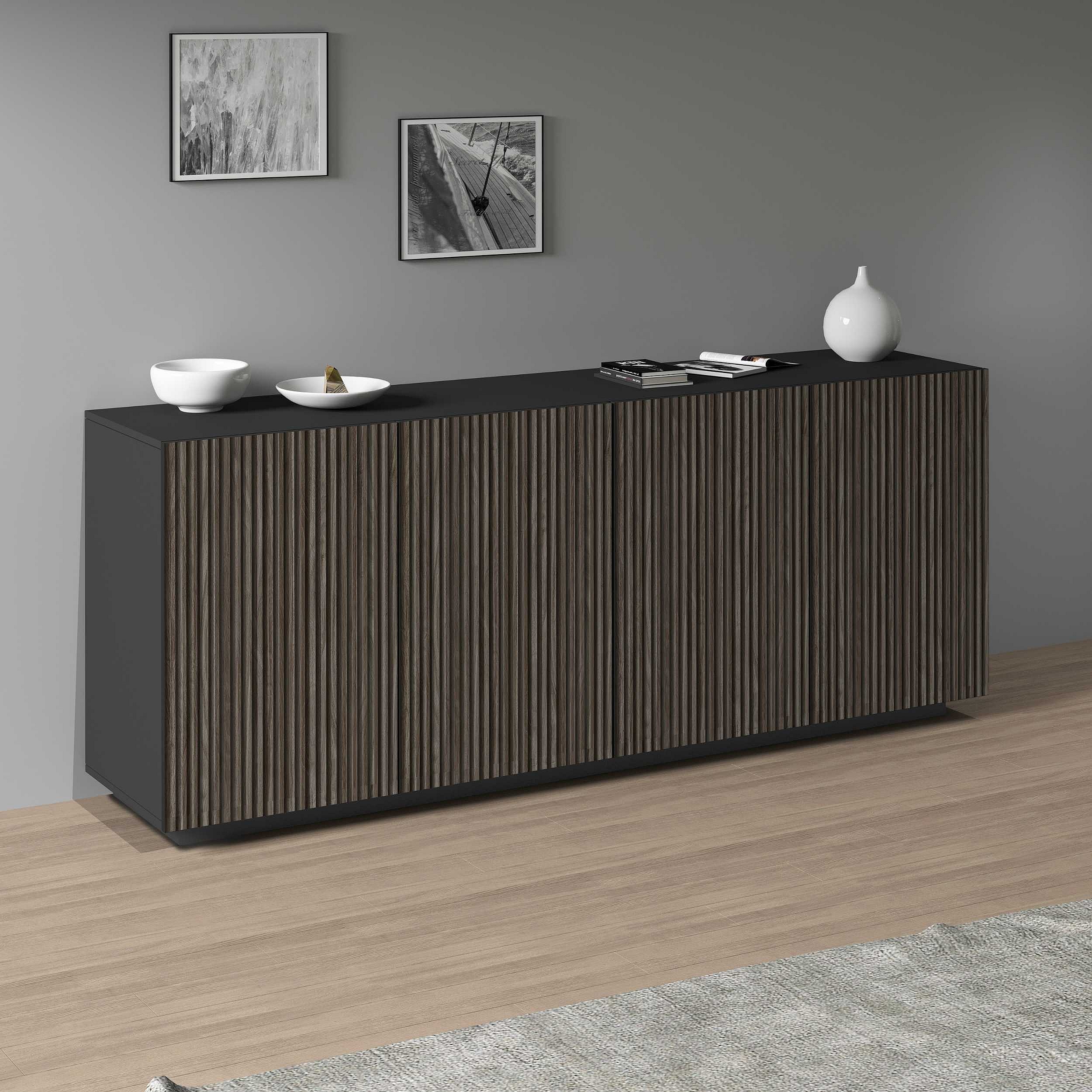 Credenza Coste a 4 ante effetto cannetè antracite opaco e legno scuro 200x43x86 cm