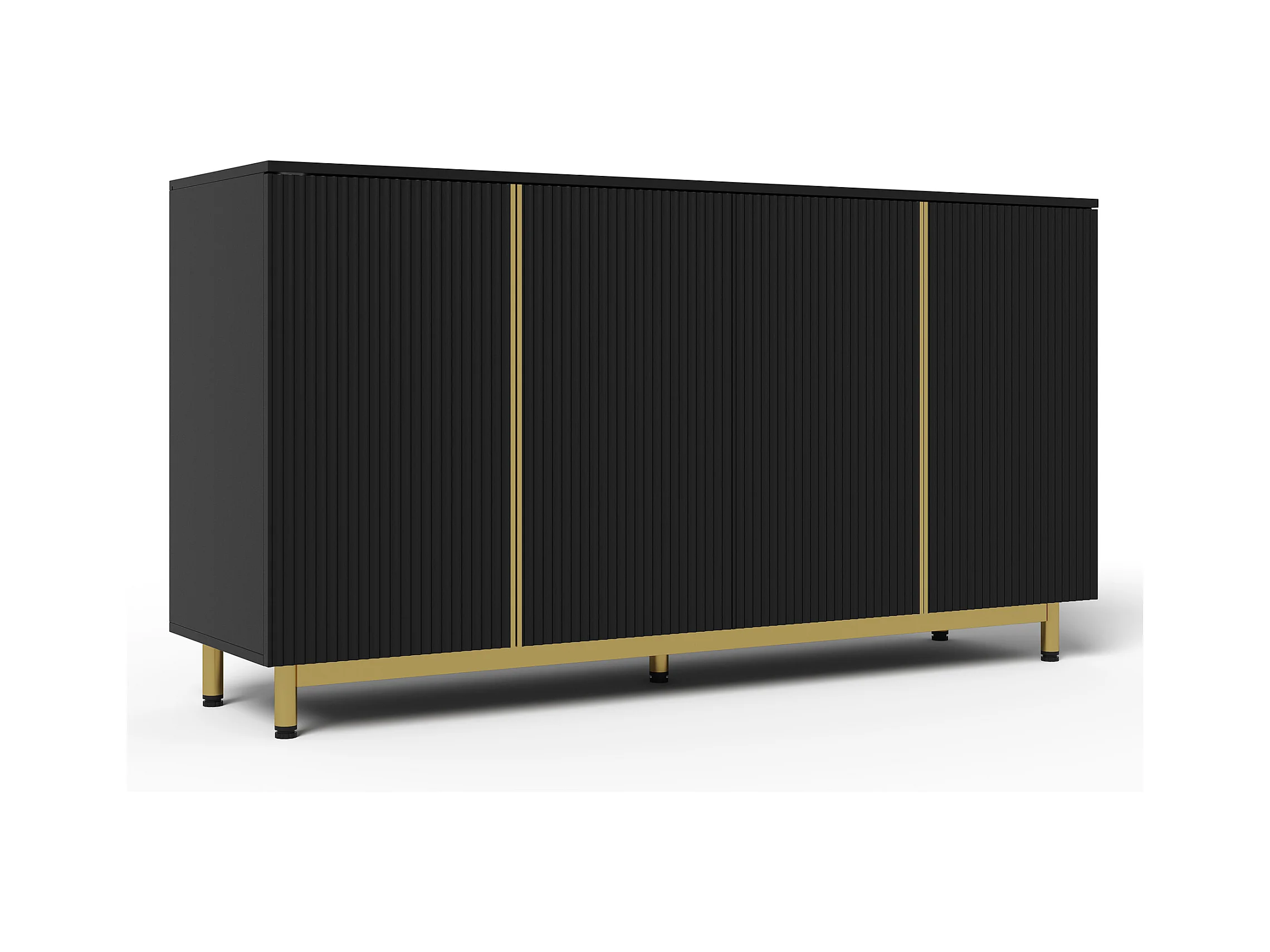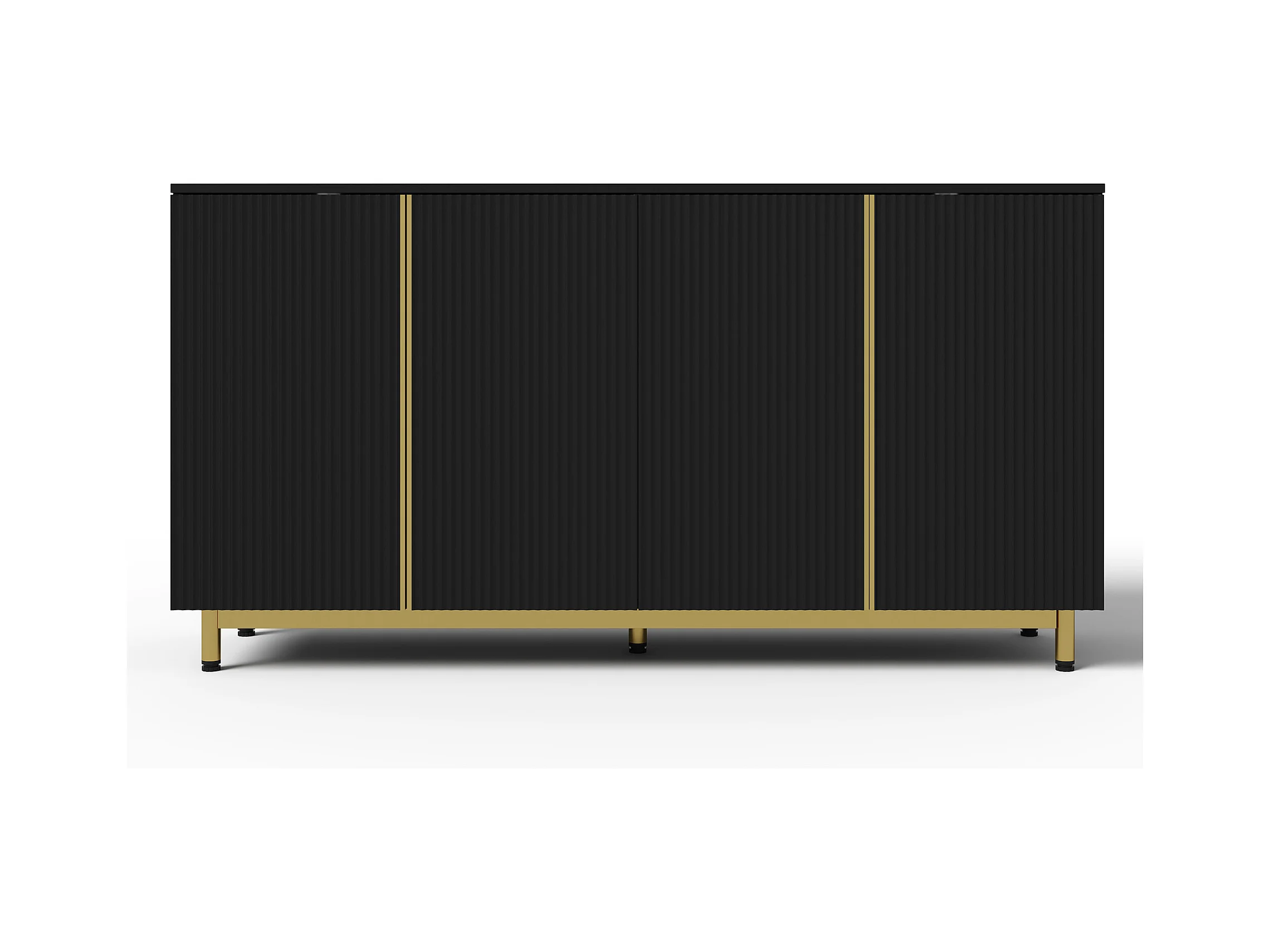 Credenza nera con 4 ante e modanature dorate, piedini in metallo - per soggiorni e camere da letto