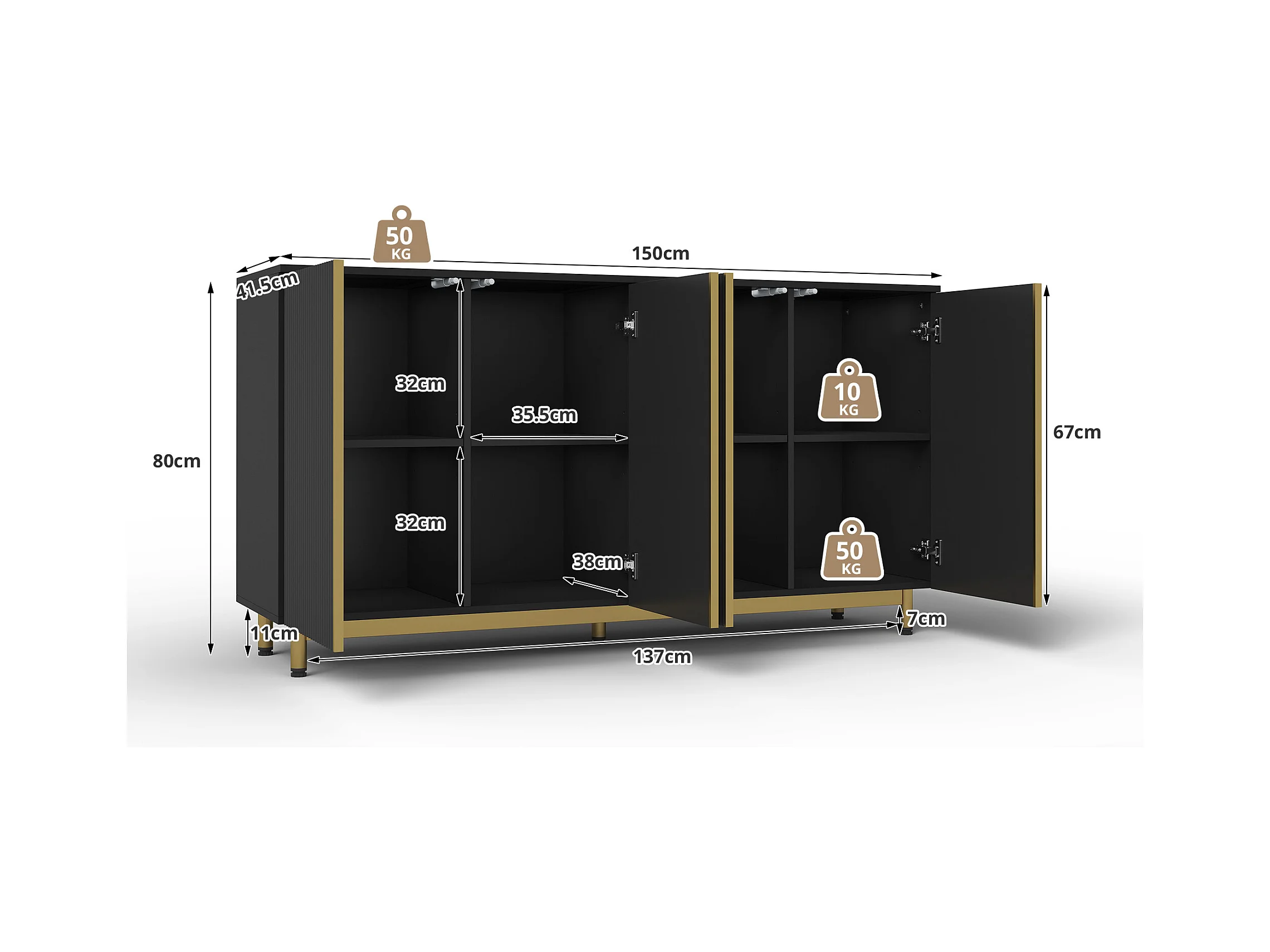 Credenza da cucina 150x41,5x80cm con 4 ante, corpo nero con dettagli oro