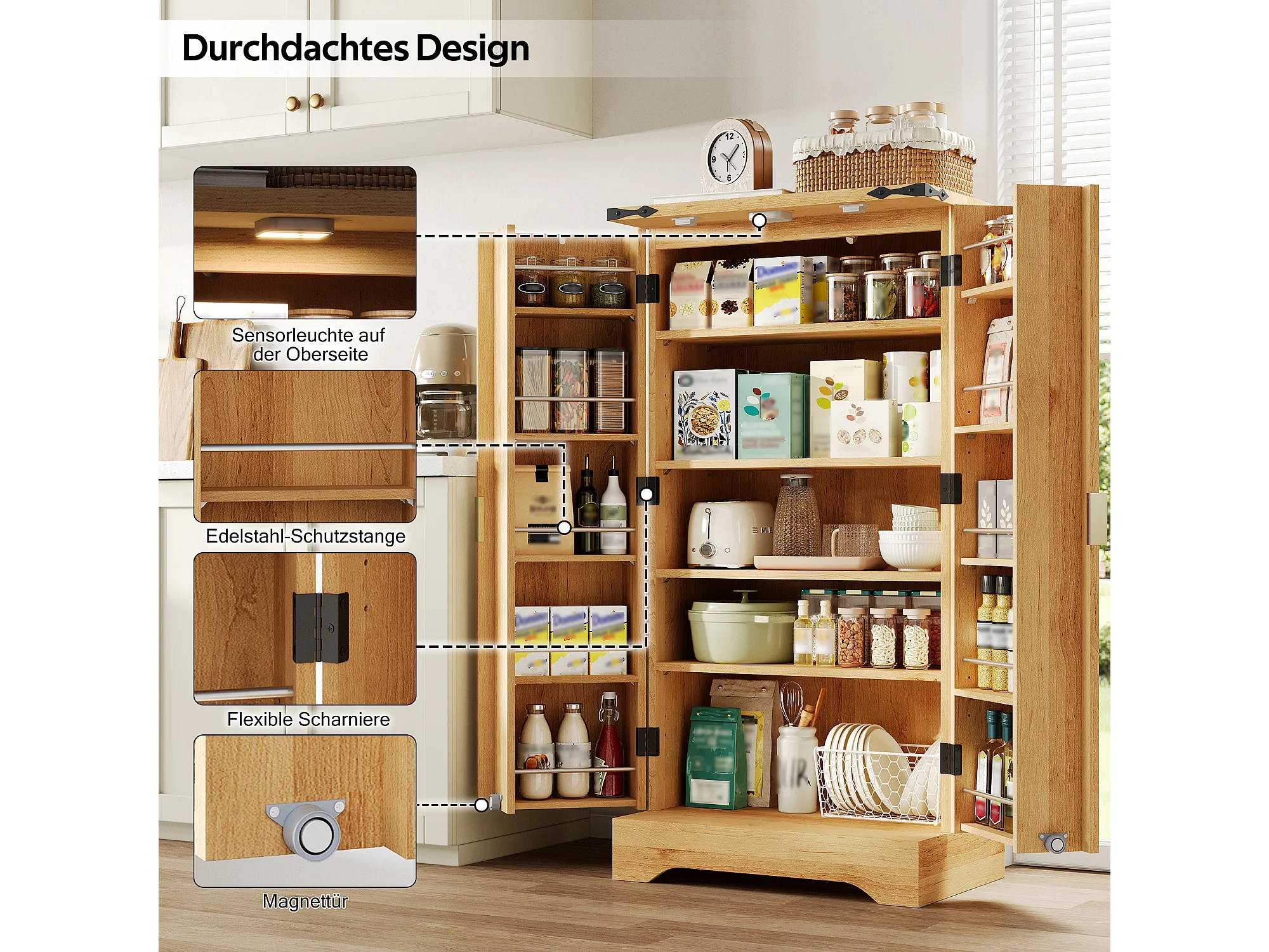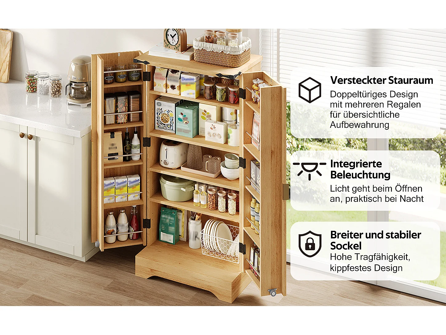 Credenza da cucina - 60,5 x 40 x 120 cm - con LED + 2 ante + ripiani regolabili - MDF - naturale