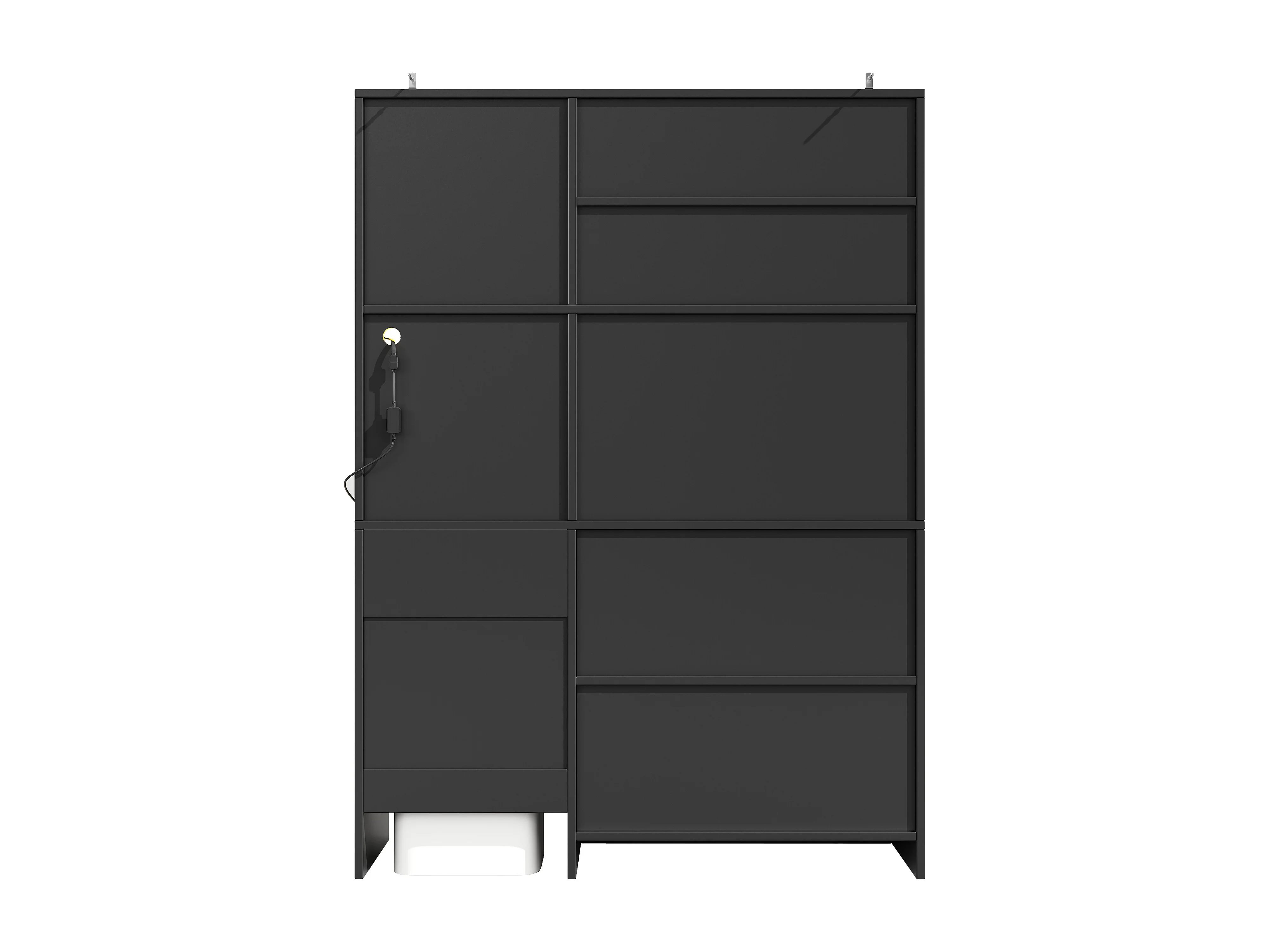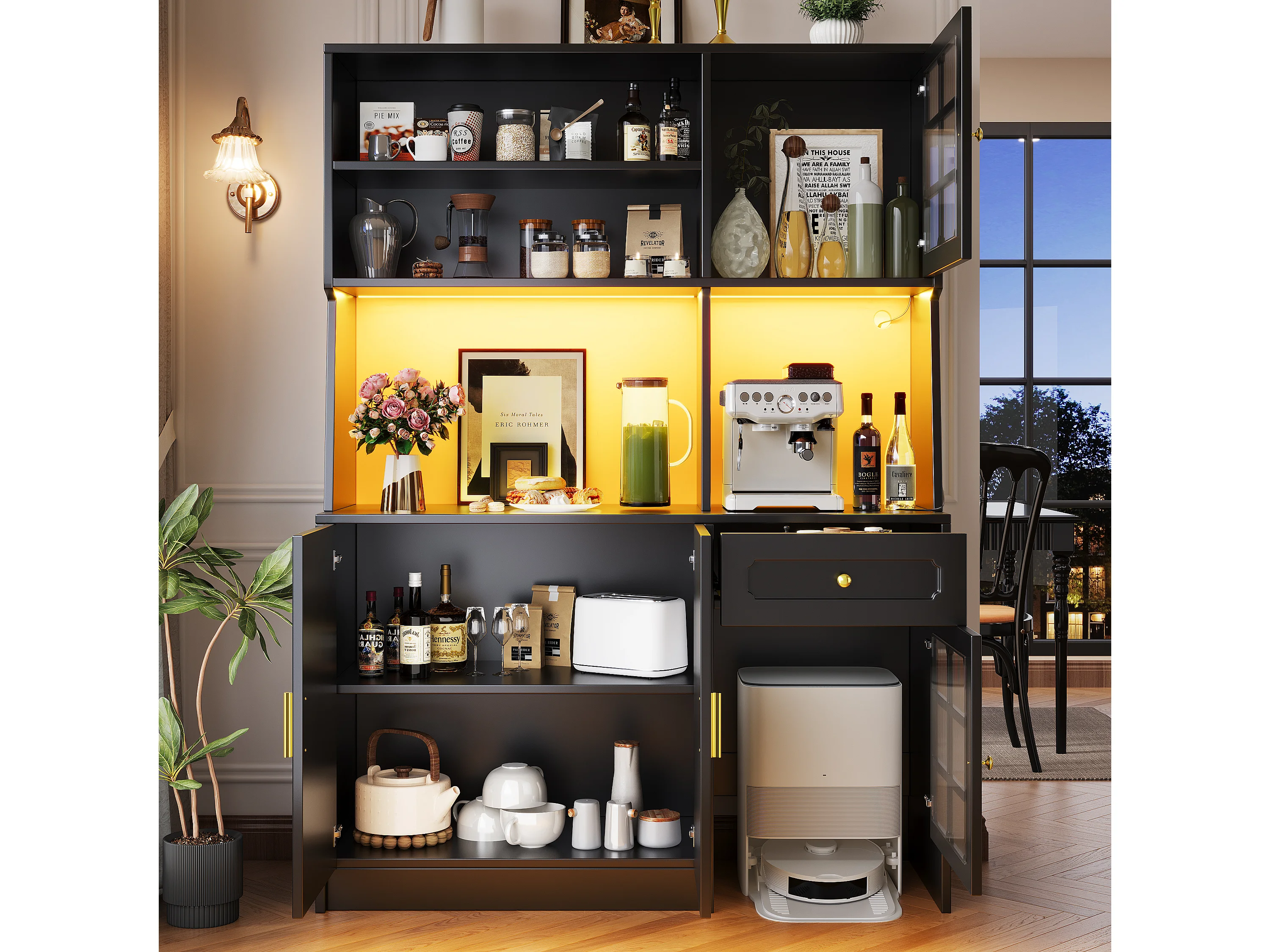 Credenza da cucina nera e naturale con 4 ante, 5 cassetti e luci LED, MDF