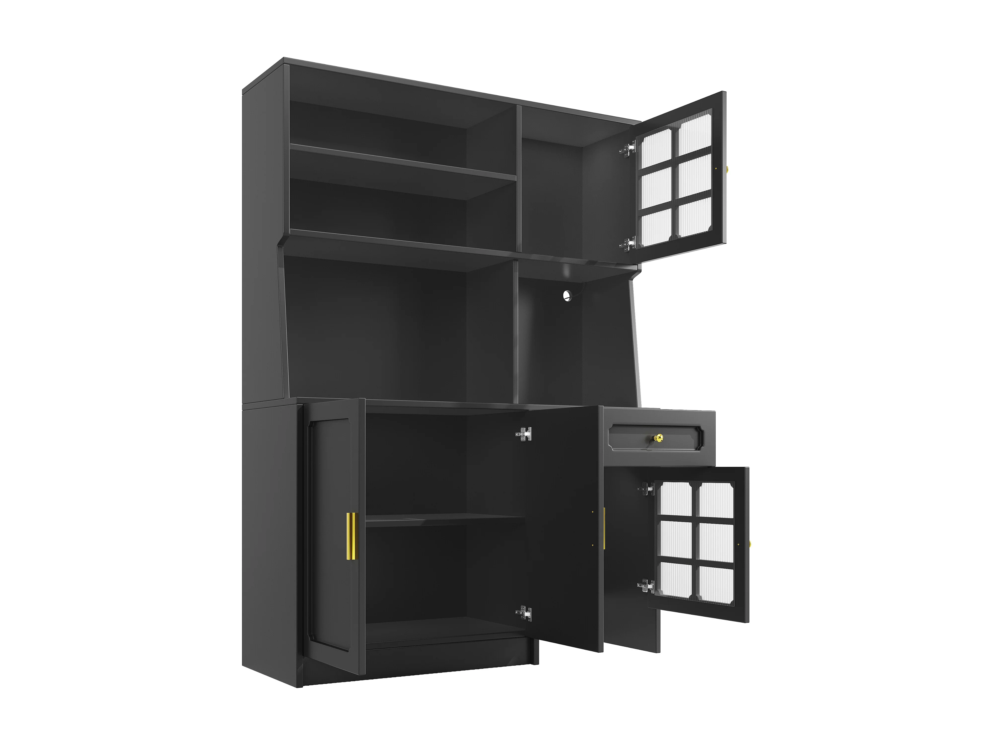 Credenza da cucina nera con 3 ante, 3 ante in vetro, 3 cassetti e luci a LED, MDF
