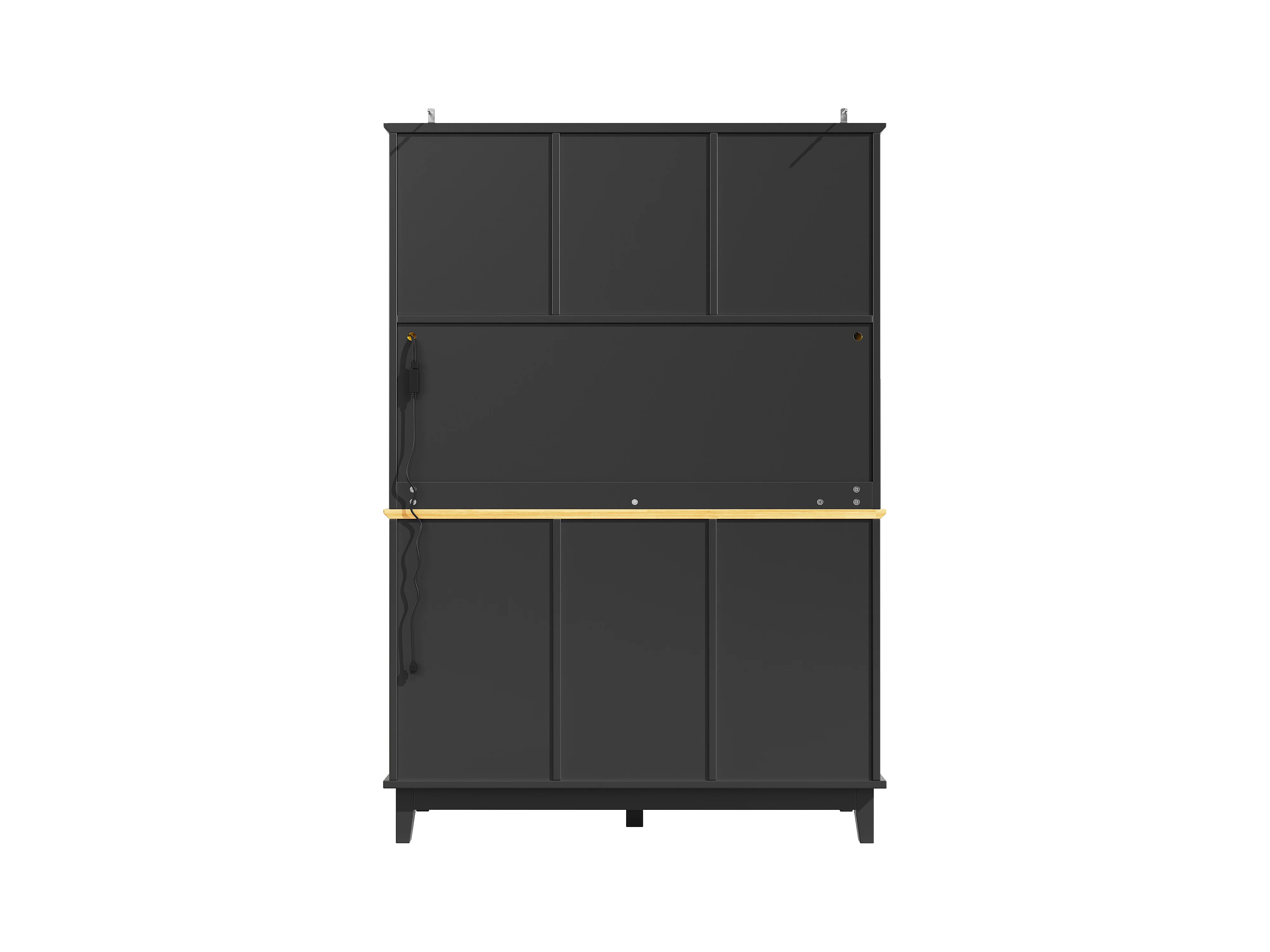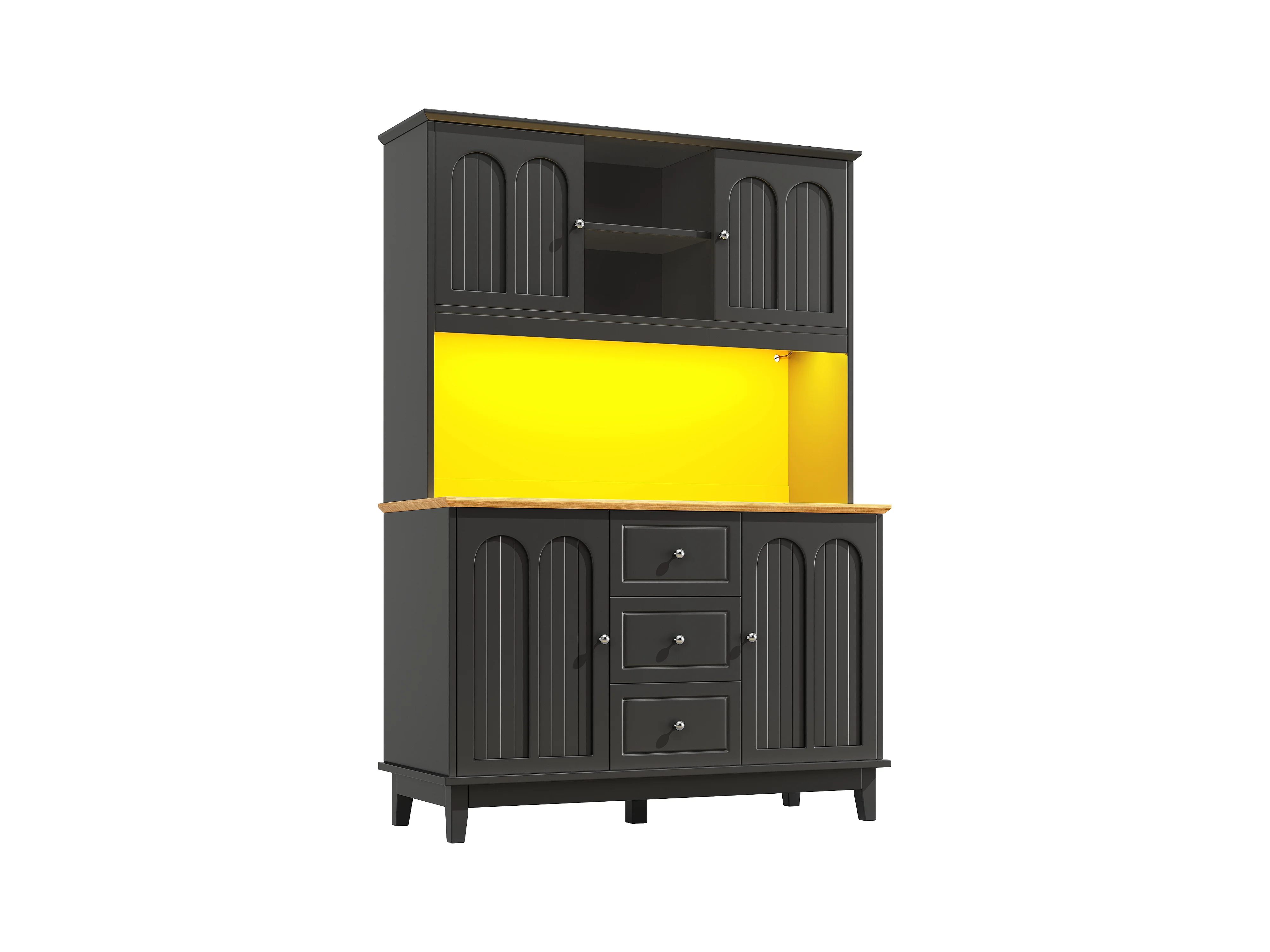 Credenza da cucina nera e naturale con 4 ante, 5 cassetti e luci LED, MDF