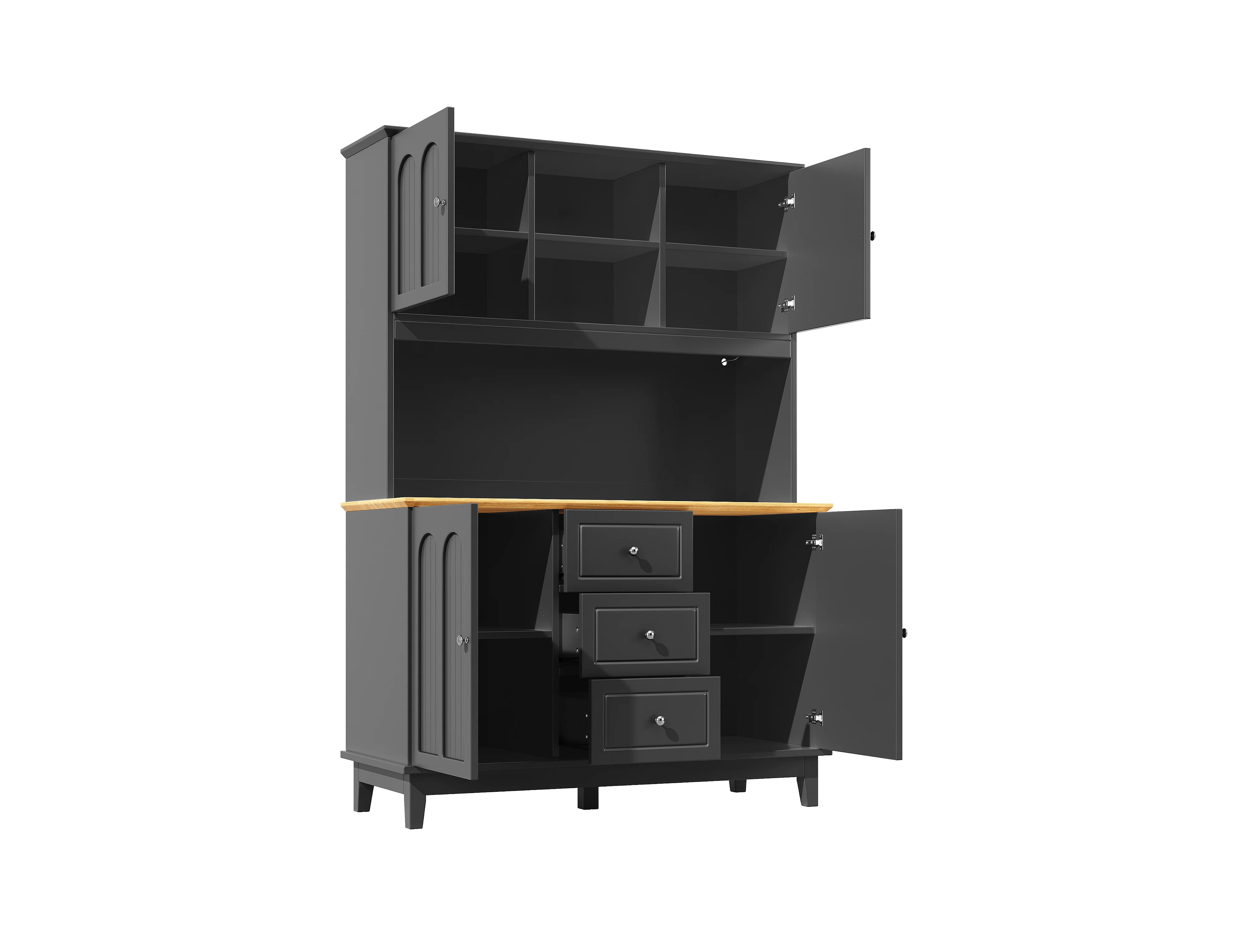 Credenza da cucina nera con illuminazione a LED, 4 ante e 3 cassetti, piano in legno impiallacciato