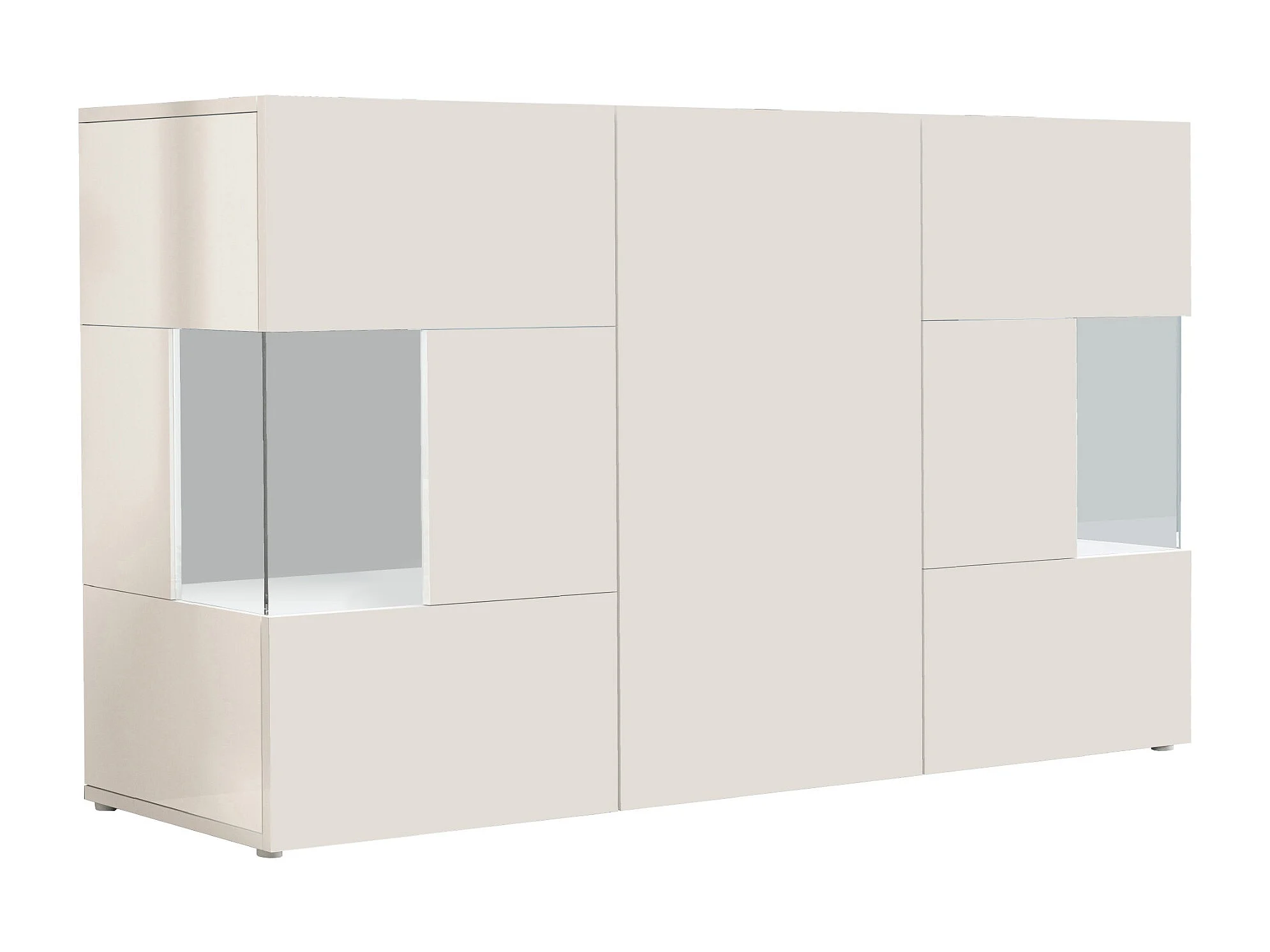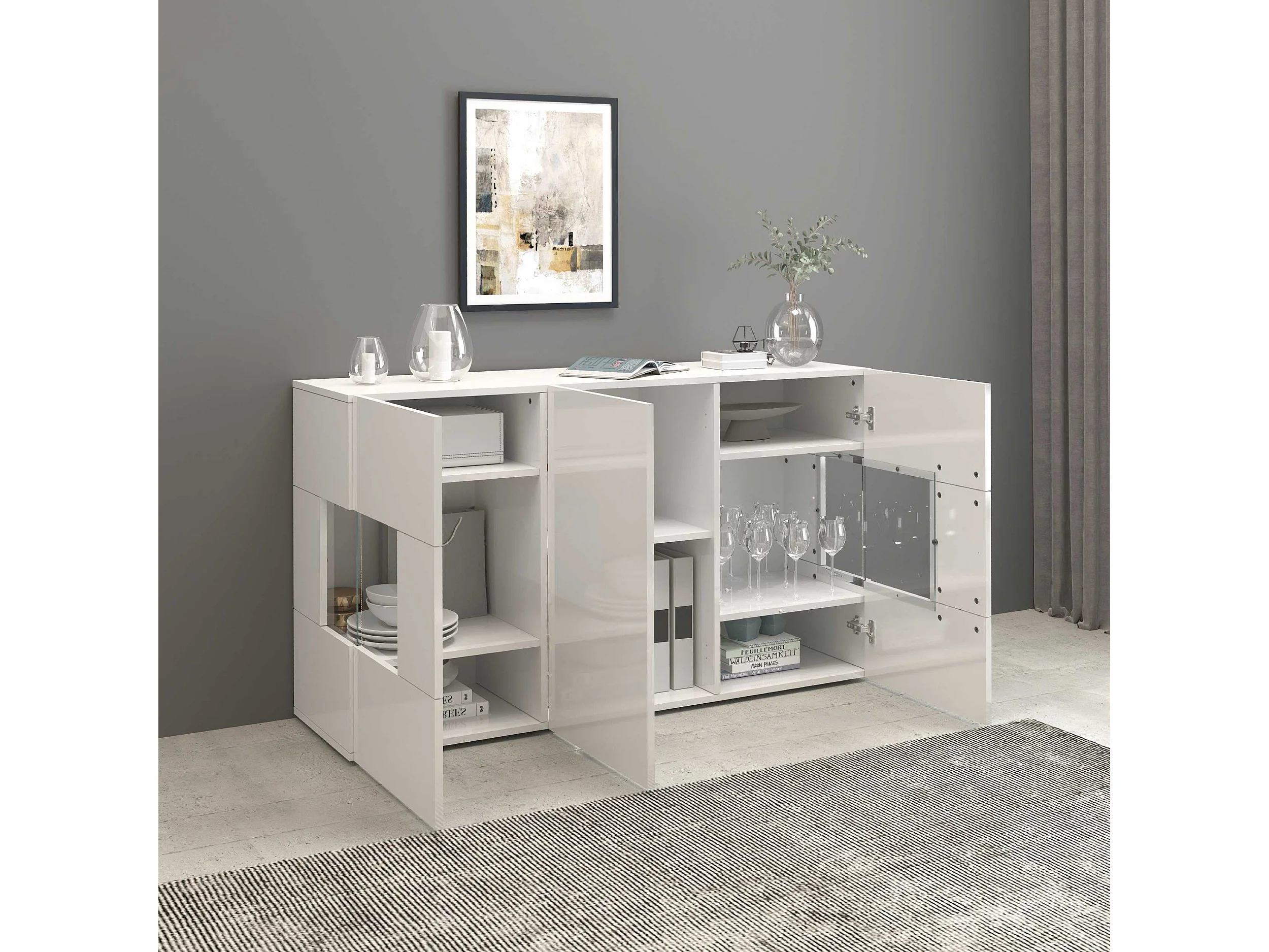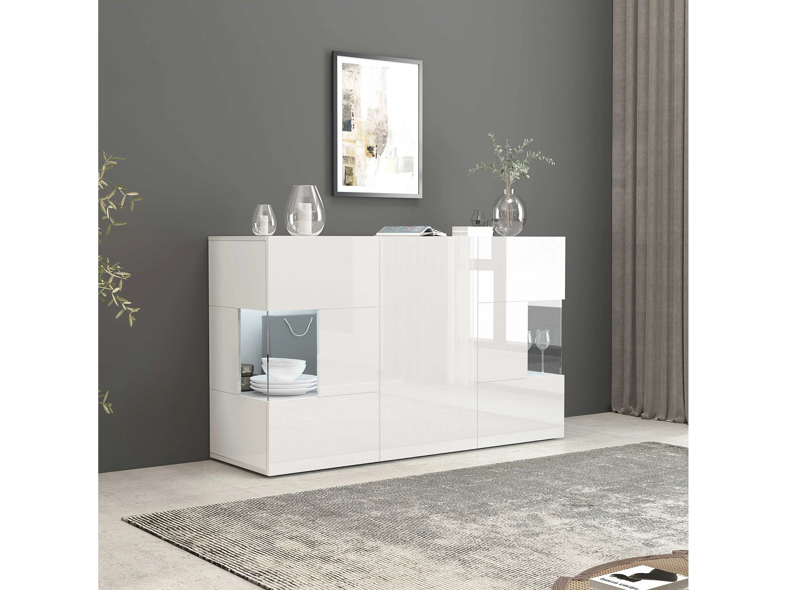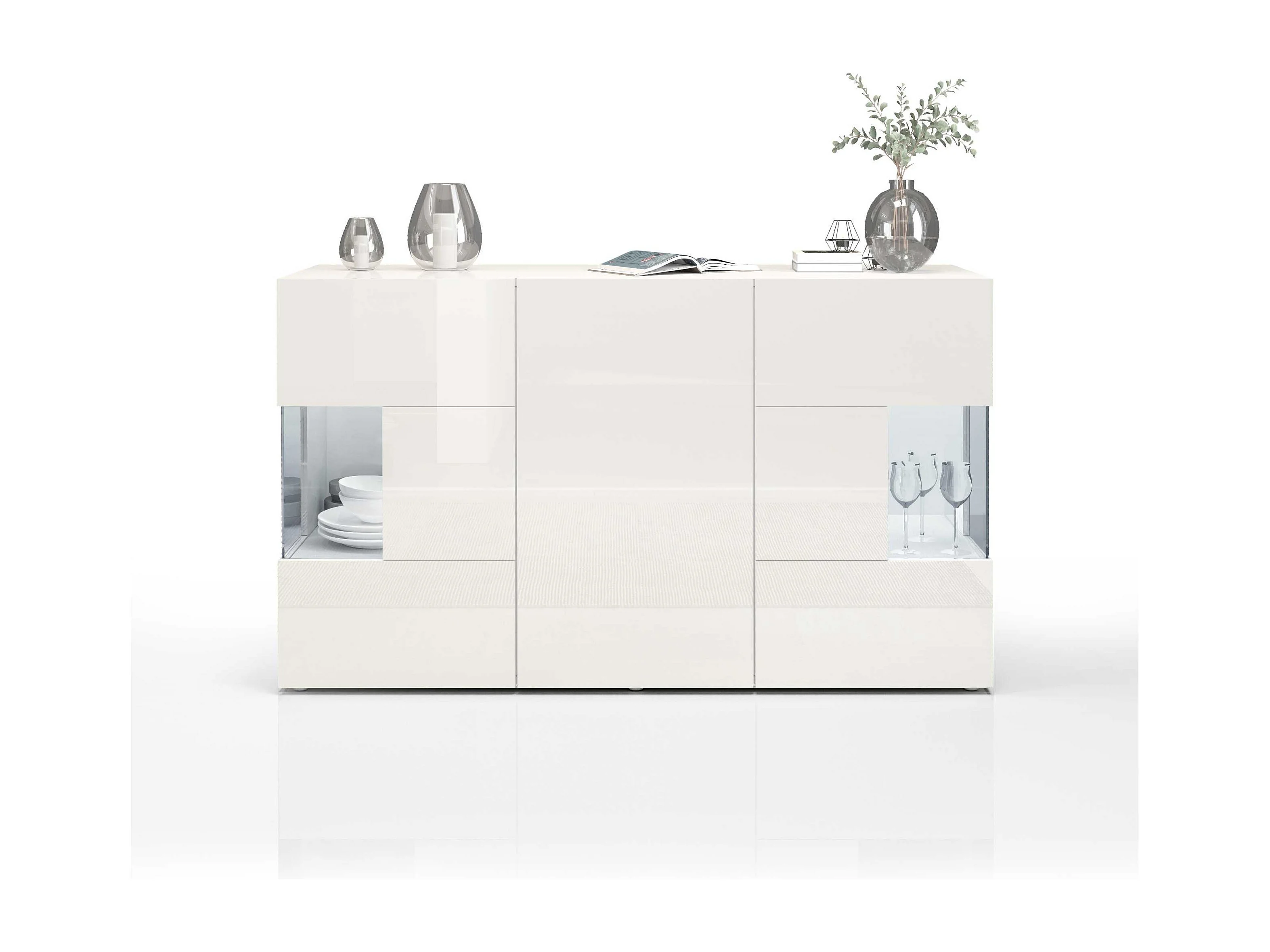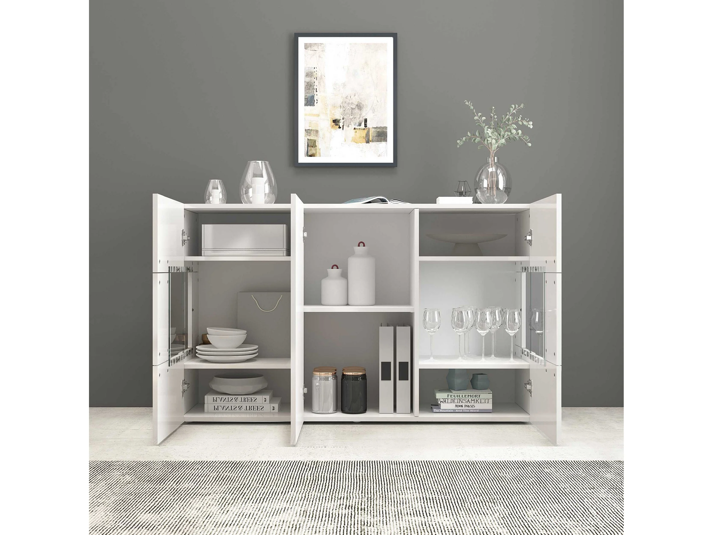 Credenza Egypt con 3 ante e inserti in vetro espositivi bianco lucido 135x40x120 cm