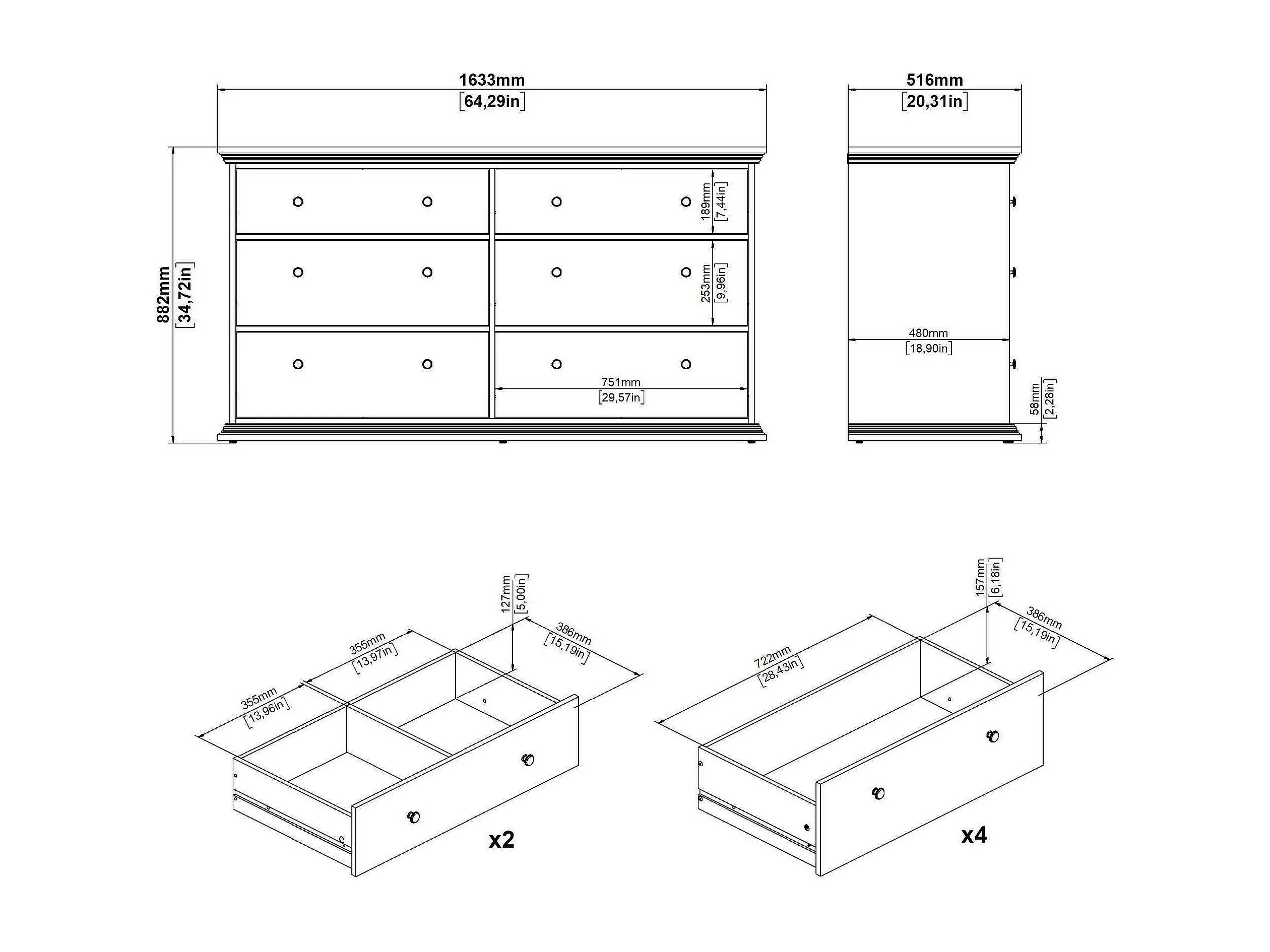 Credenza Hibaru, 6 Cassetti, 51.6x163.3x88.2h cm Nero, Madia