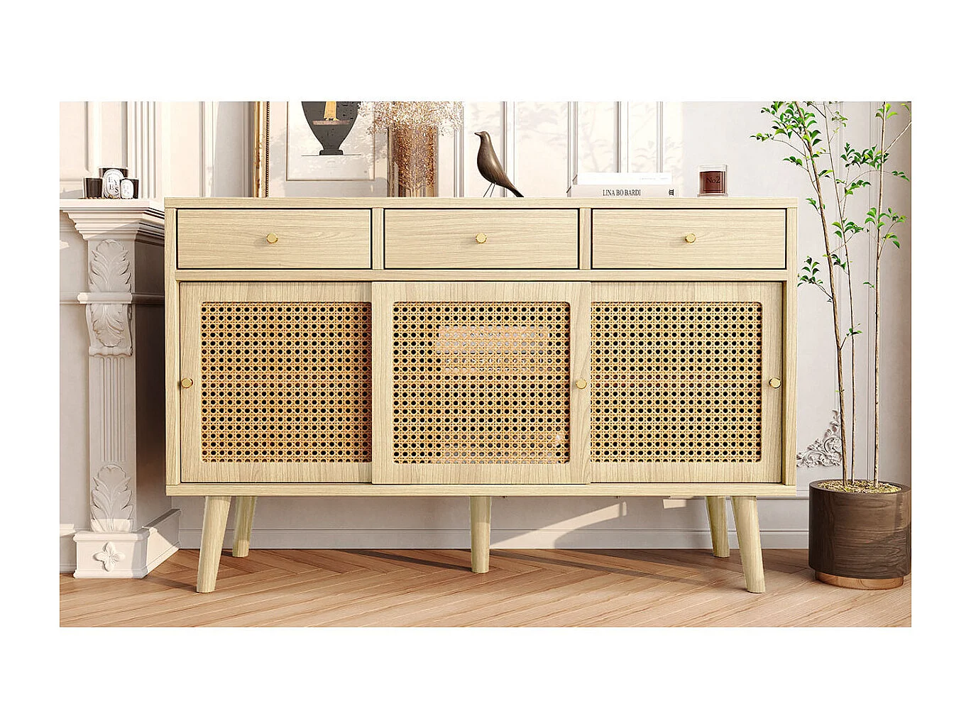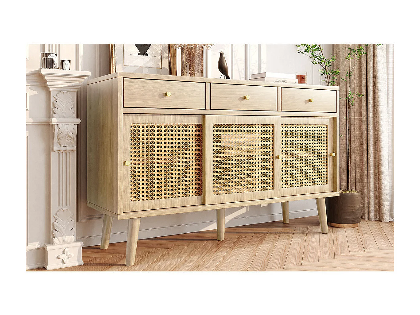 Credenza in rovere con 3 cassetti e 3 ante scorrevoli, rete in rattan, gambe in legno massello, maniglia dorata, 120x40x78 cm