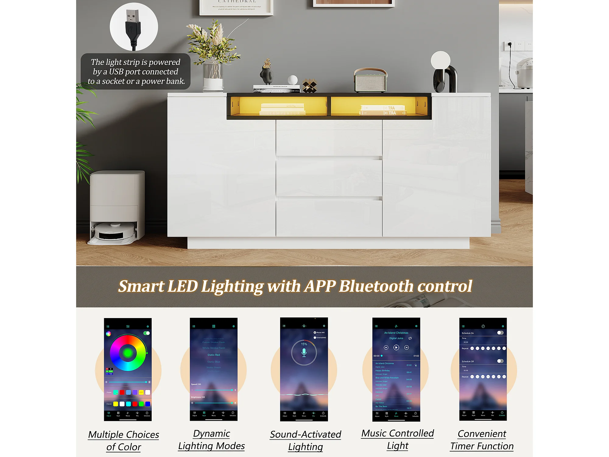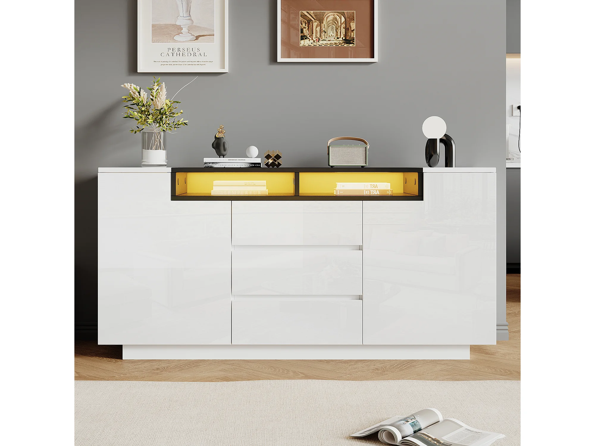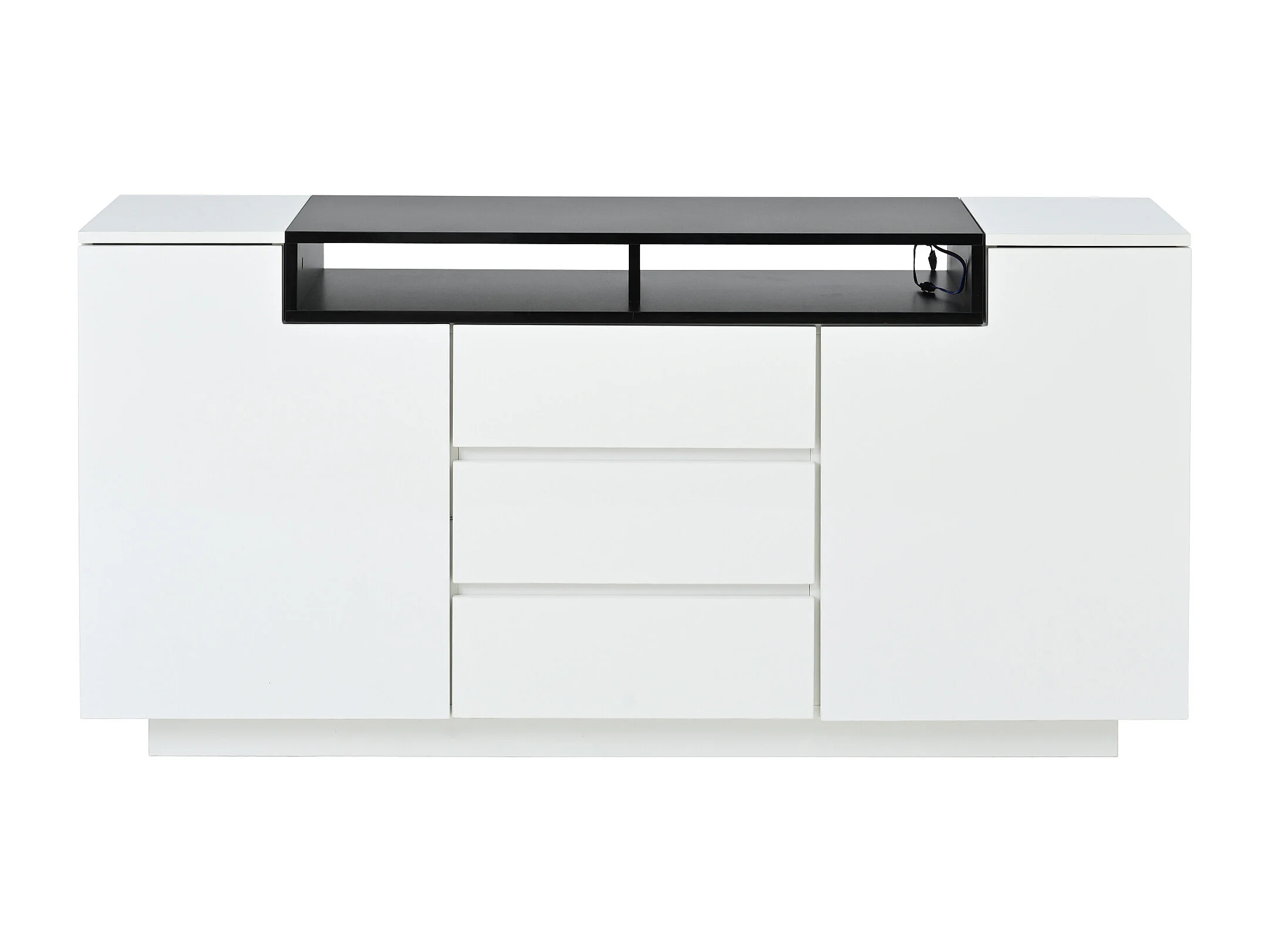 Credenza laccata lucida con illuminazione a LED, 2 ante a L e 3 cassetti - Bianco e nero
