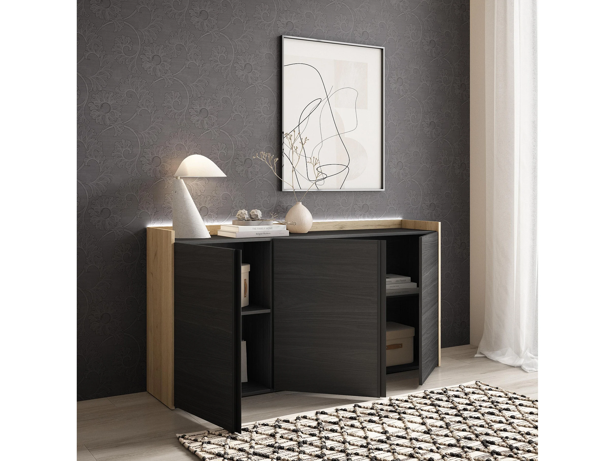 Credenza, Mobile, Cucina, 156x80x35 cm, 3 Porte, LED, Nero e rovere