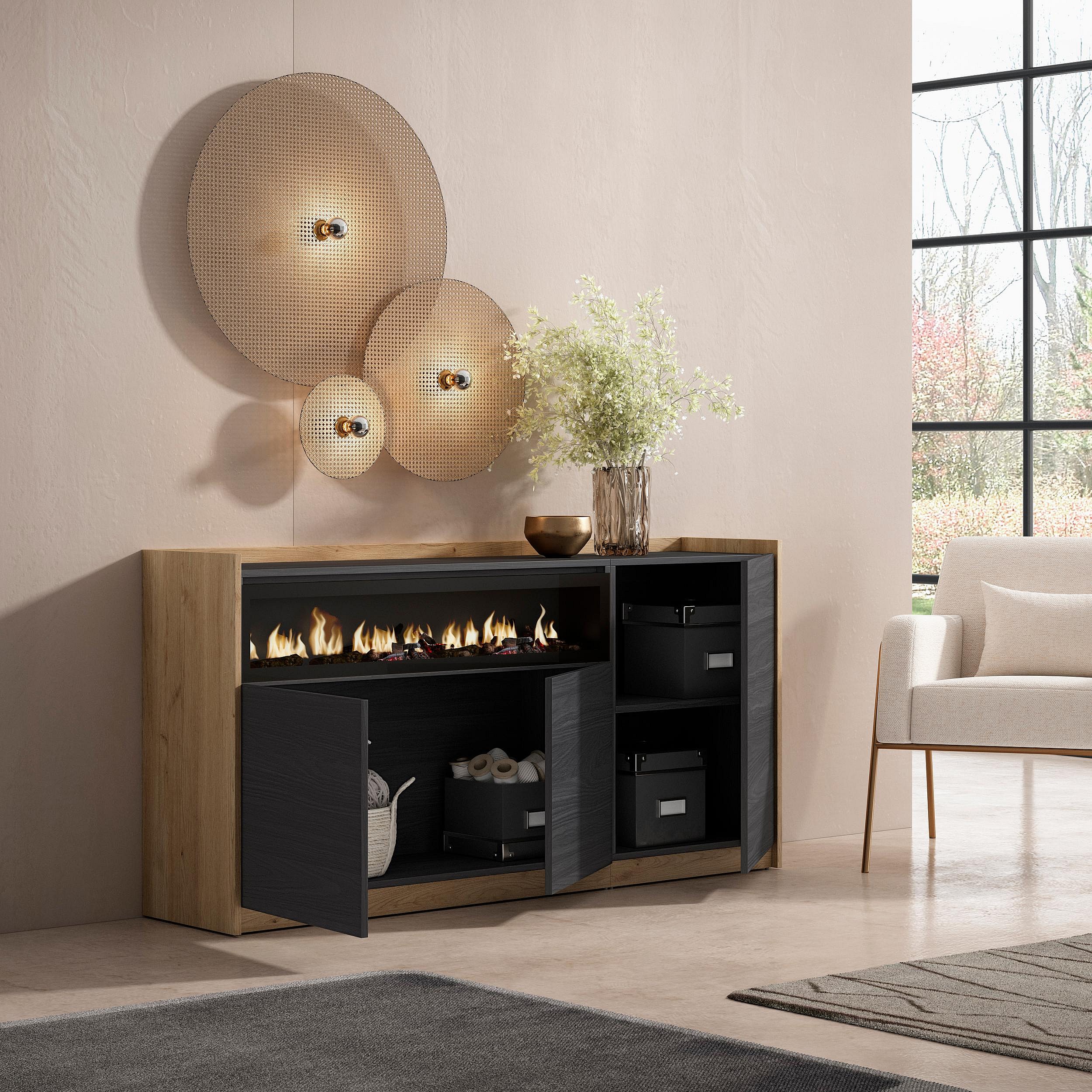 Credenza, Mobile, Cucina, 156x80x37 cm, 3 Porte, Camino elettrico, Nero e rovere