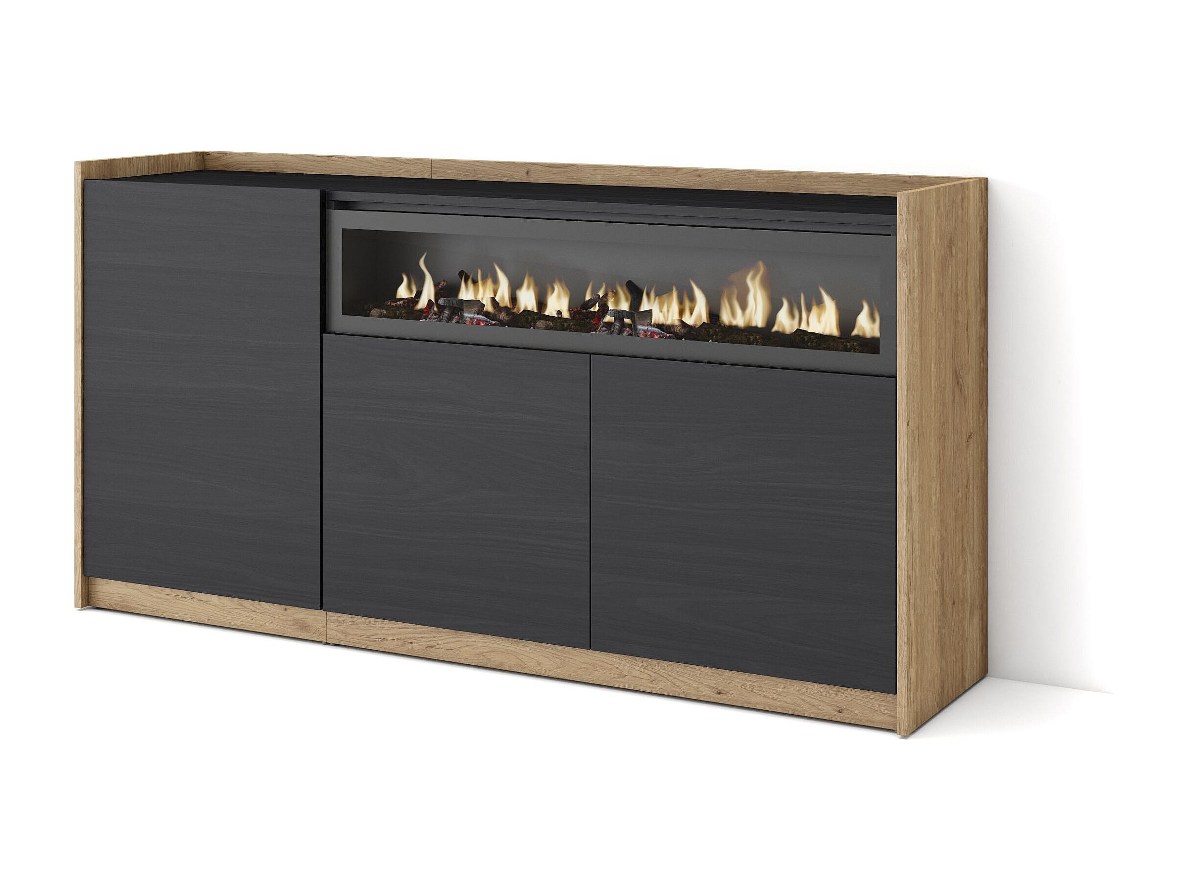 Credenza, Mobile, Cucina, 156x80x37 cm, 3 Porte, Camino elettrico, Nero e rovere