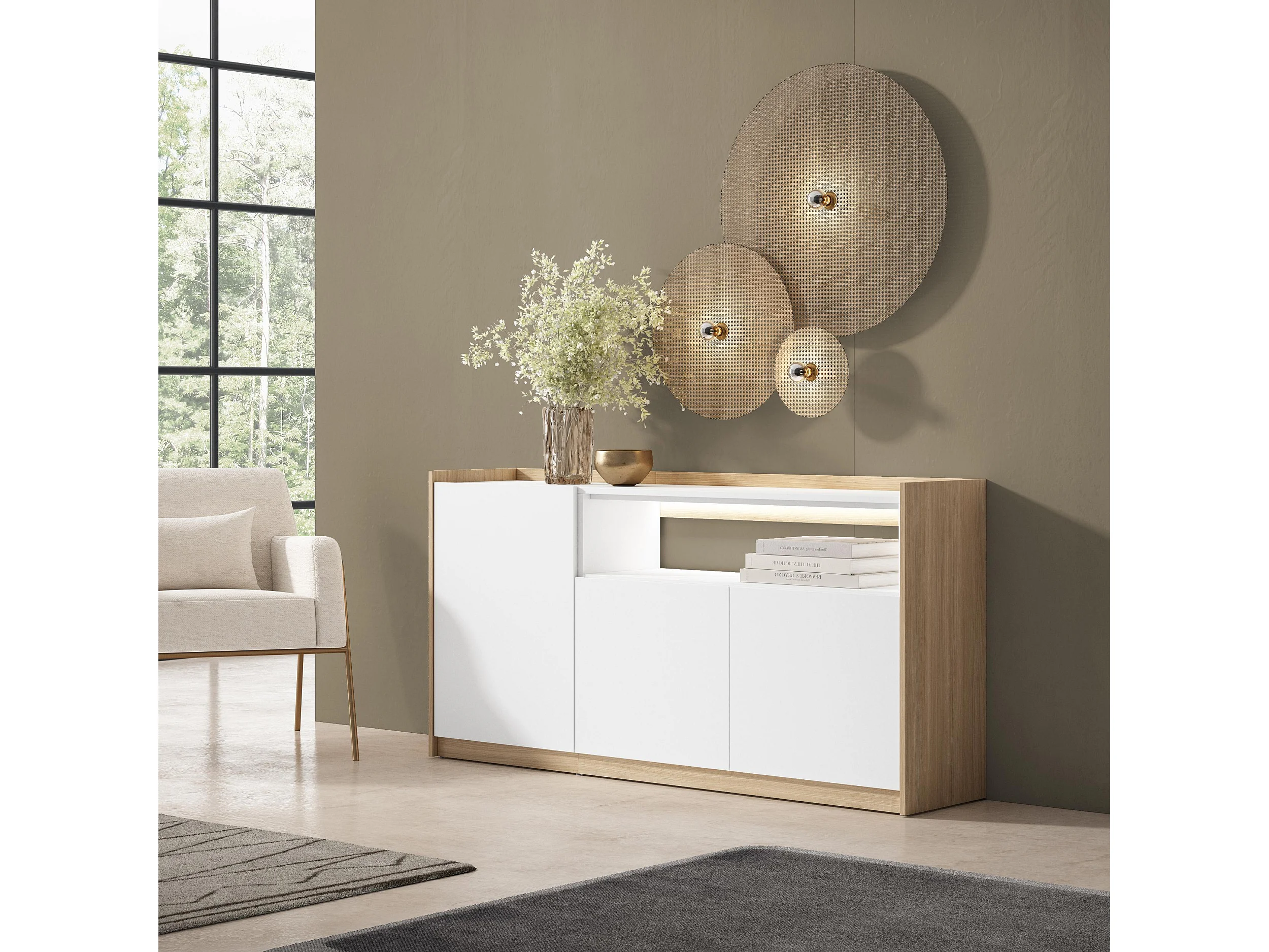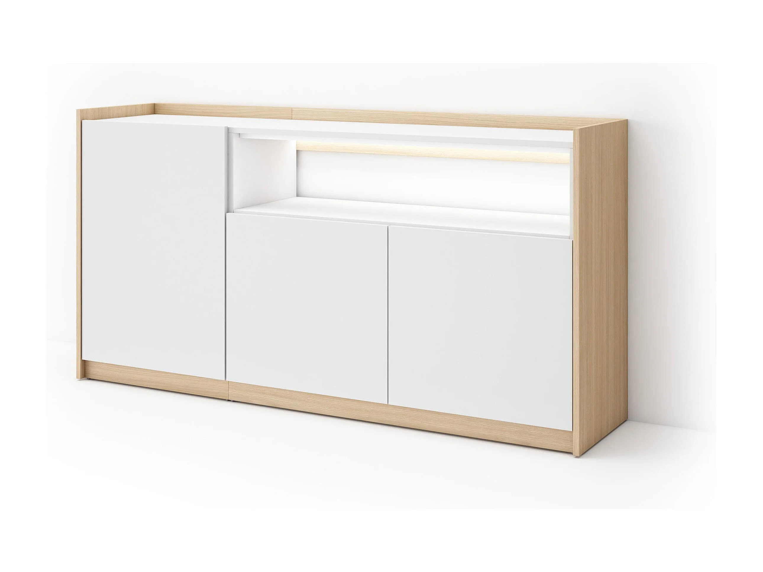 Credenza, Mobile, Cucina, 156x80x37 cm, 3 Porte, LED, Bianco e Rovere soft