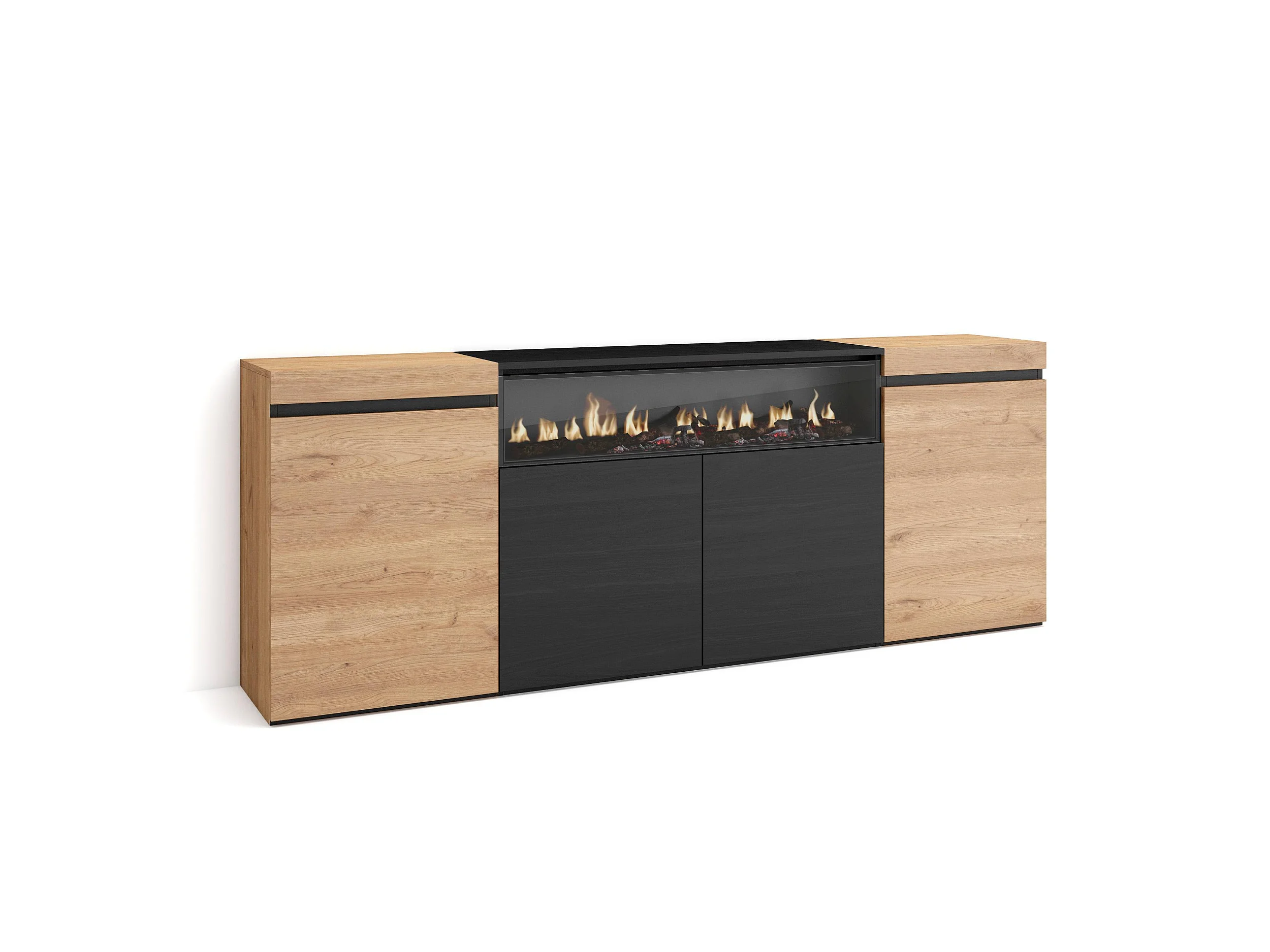 Credenza, Mobile, Cucina, 200x35x75cm, 4 Porte, Camino elettrico, Rovere e nero