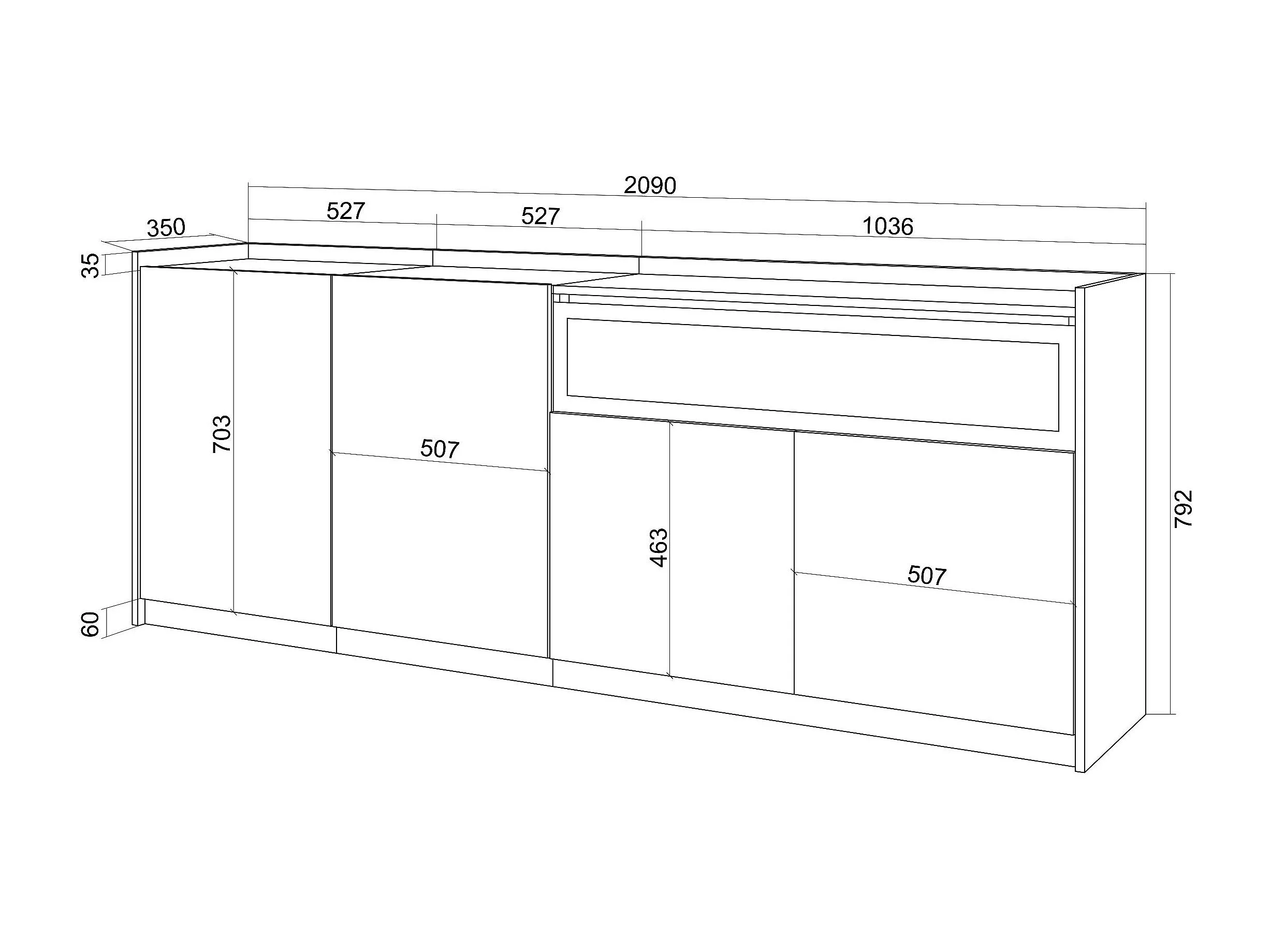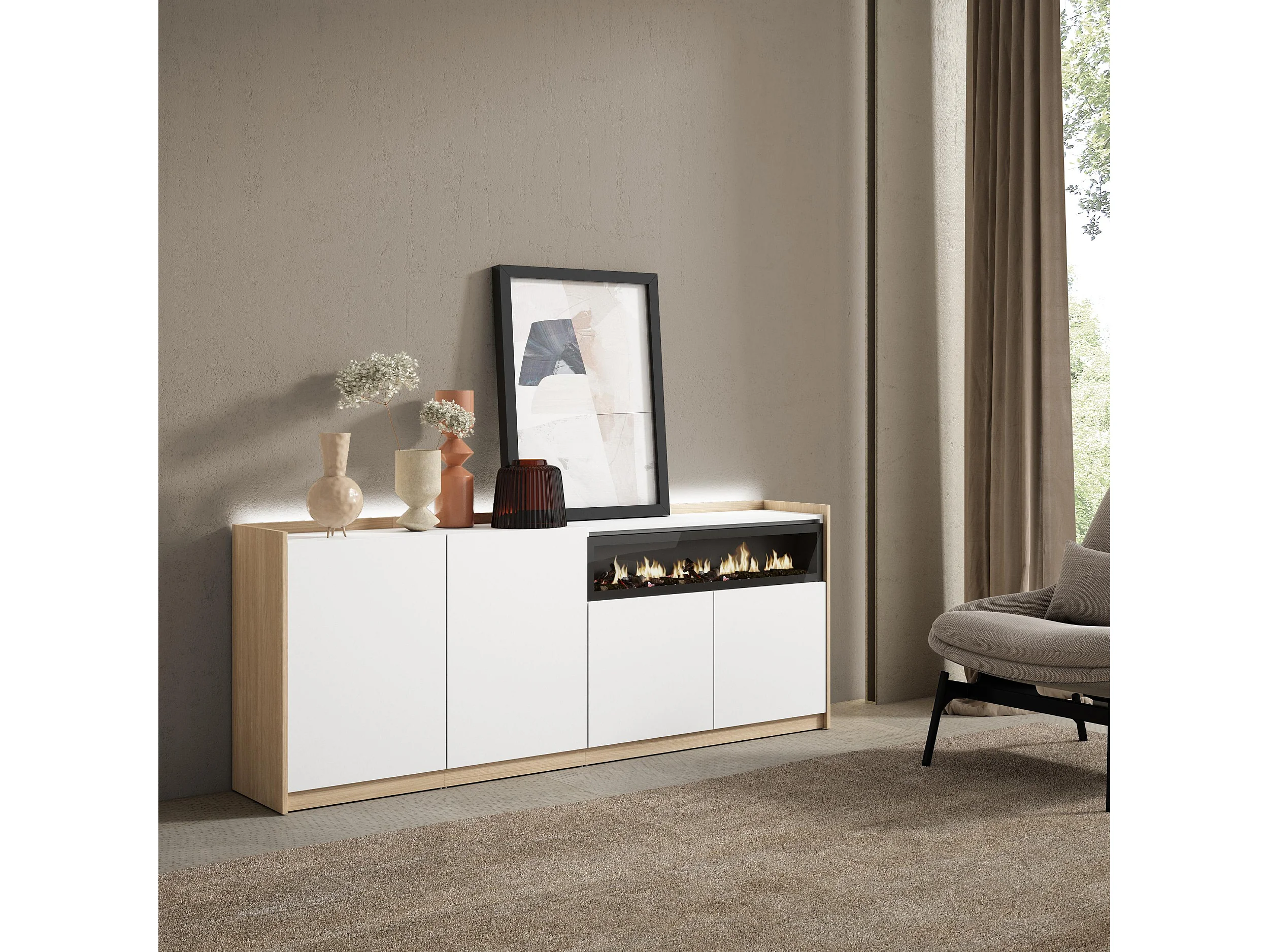 Credenza, Mobile, Cucina, 207x80x37 cm, 4 Porte, Camino elettrico, LED, Bianco e Rovere soft