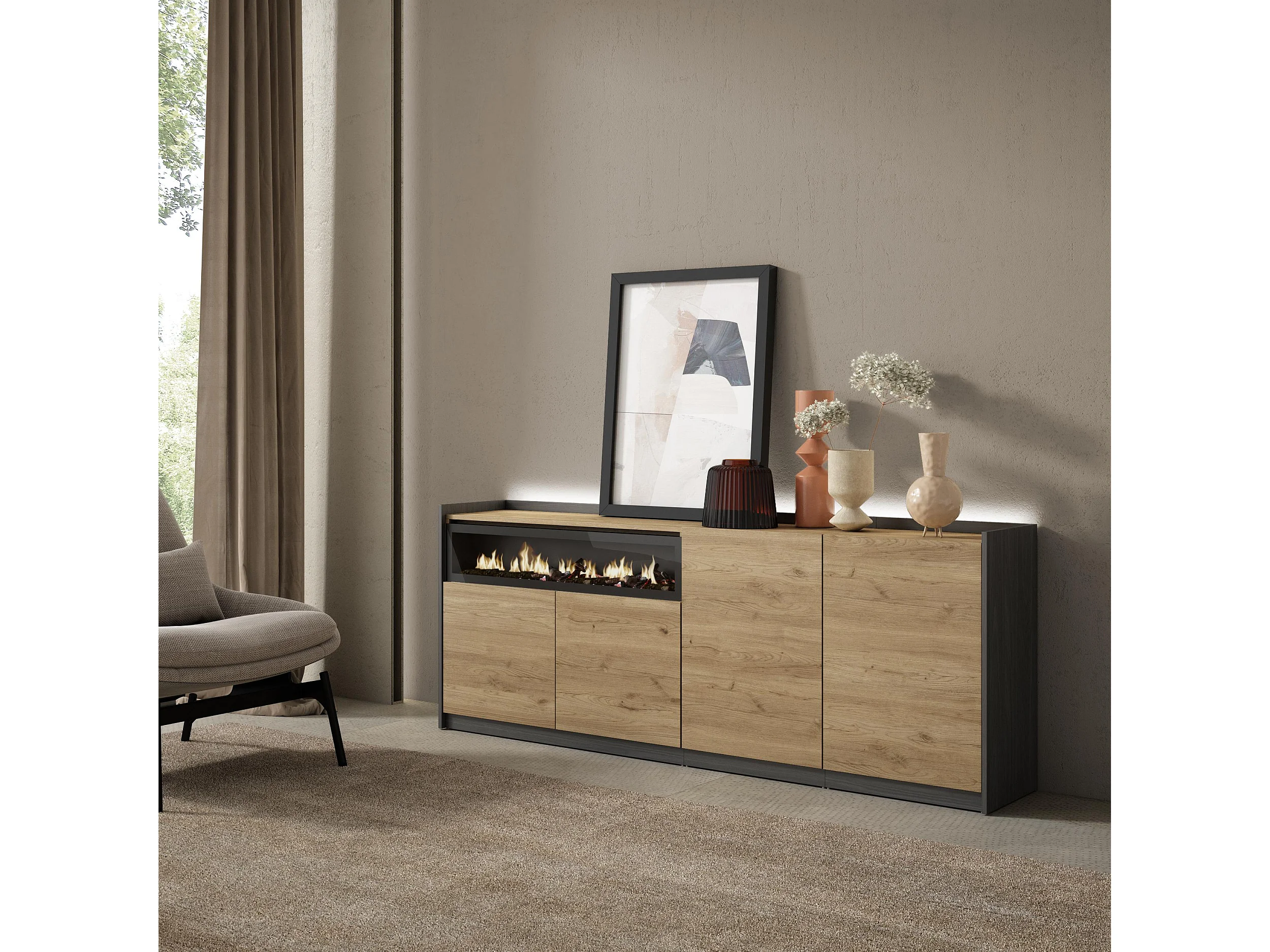 Credenza, Mobile, Cucina, 207x80x37 cm, 4 Porte, Camino elettrico, LED, Rovere e nero