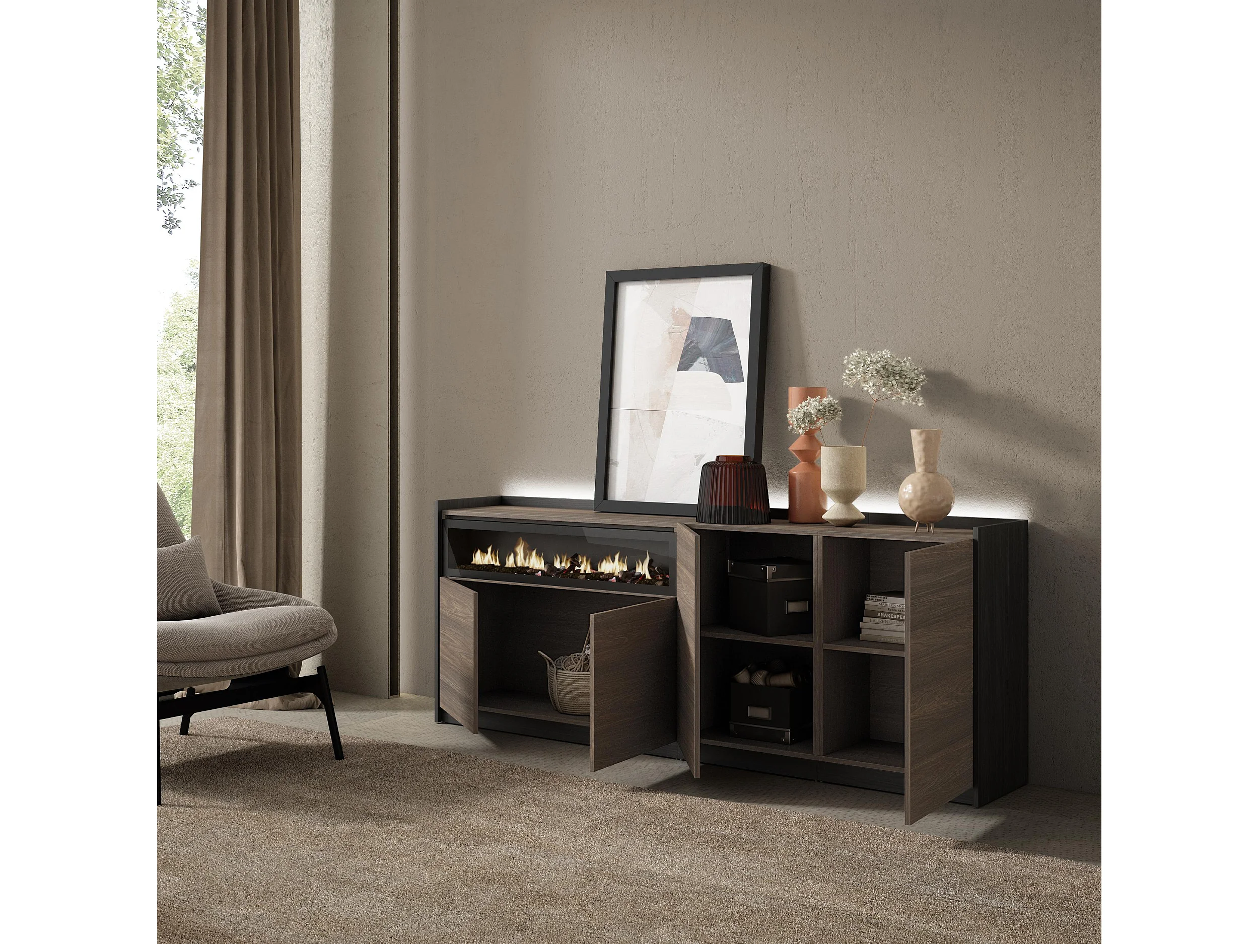 Credenza, Mobile, Cucina, 207x80x37 cm, 4 Porte, Camino elettrico, LED, Rovere scuro e Nero