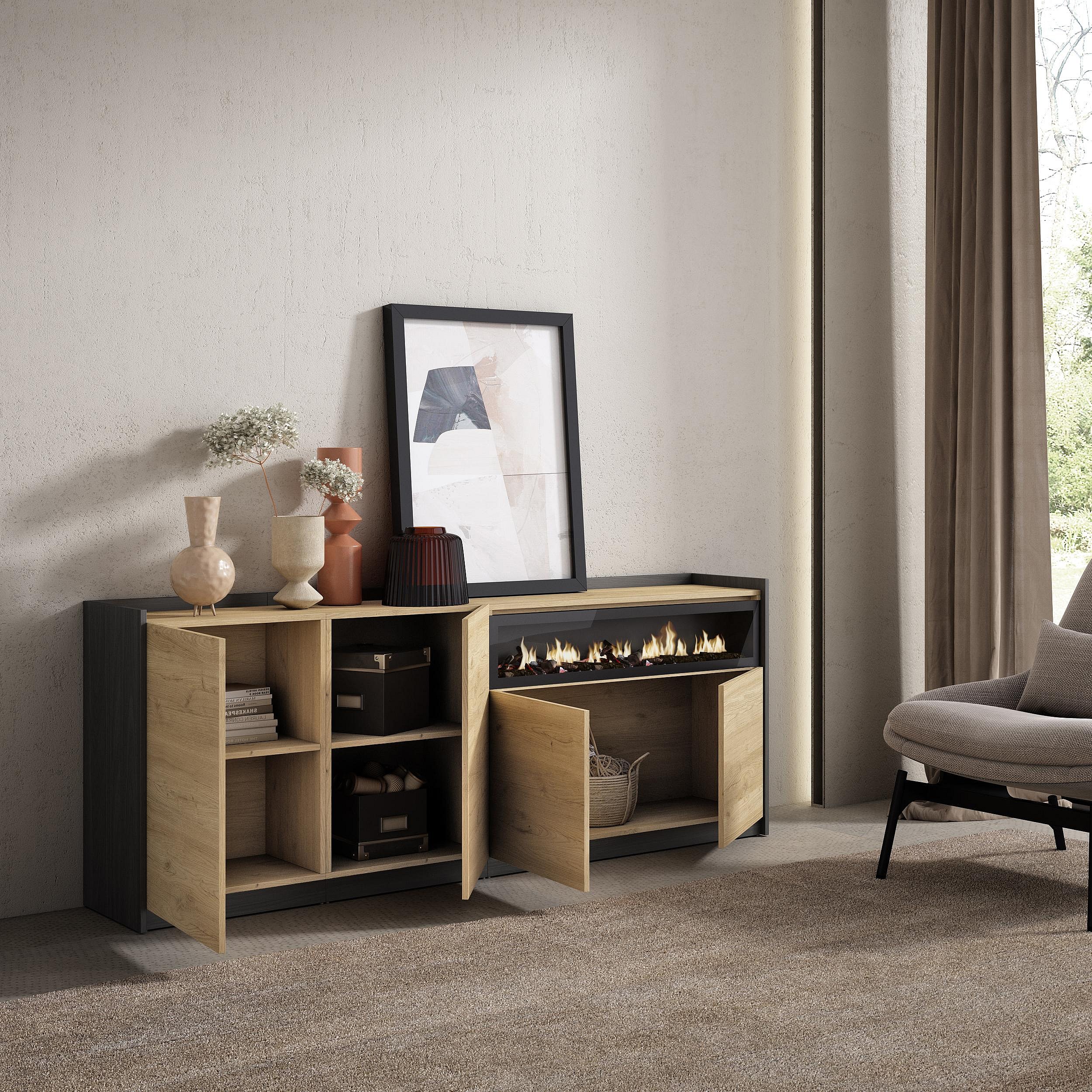 Credenza, Mobile, Cucina, 207x80x37 cm, 4 Porte, Camino elettrico, Rovere e nero