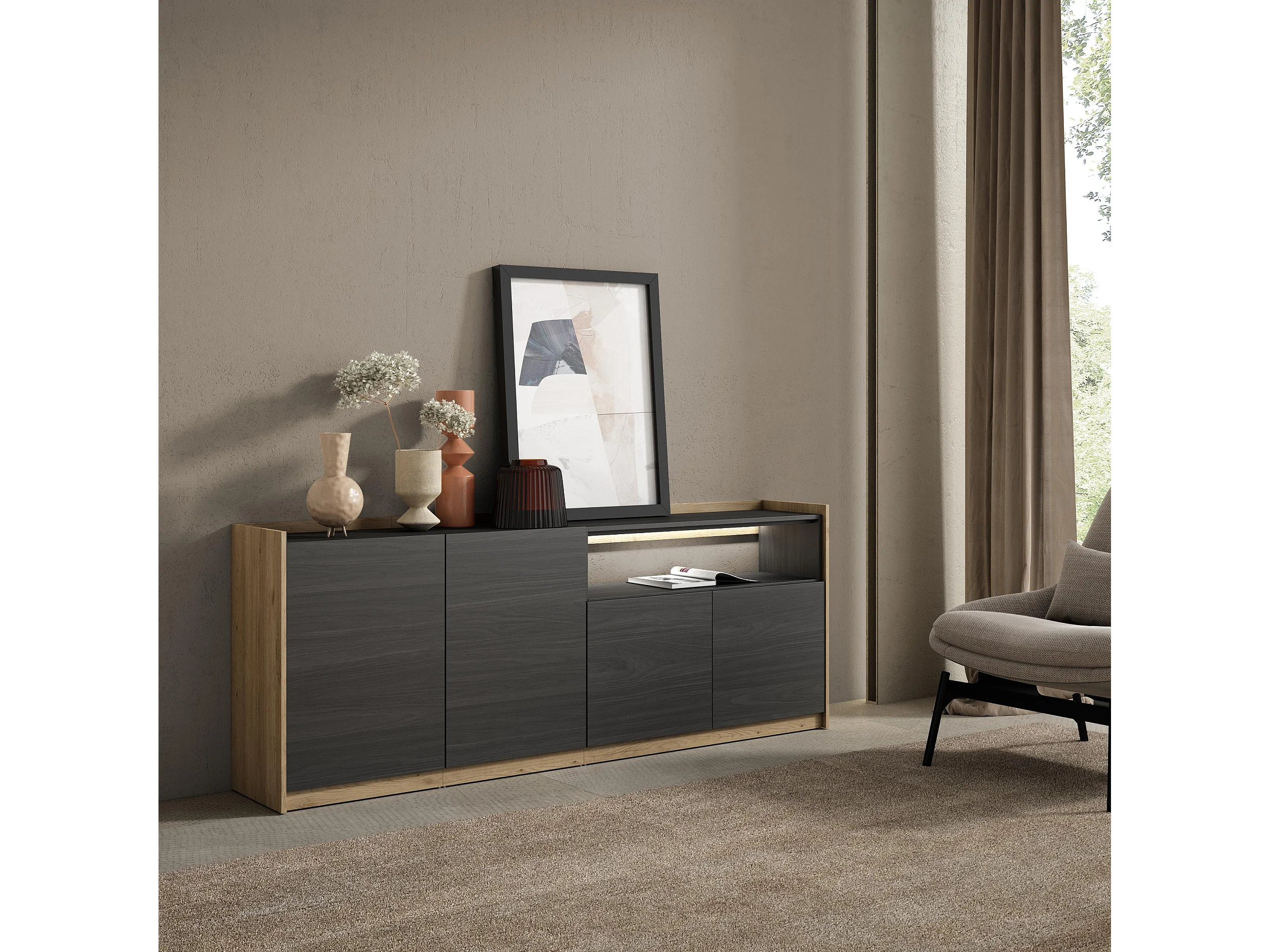 Credenza, Mobile, Cucina, 207x80x37 cm, 4 Porte, LED, Nero e rovere