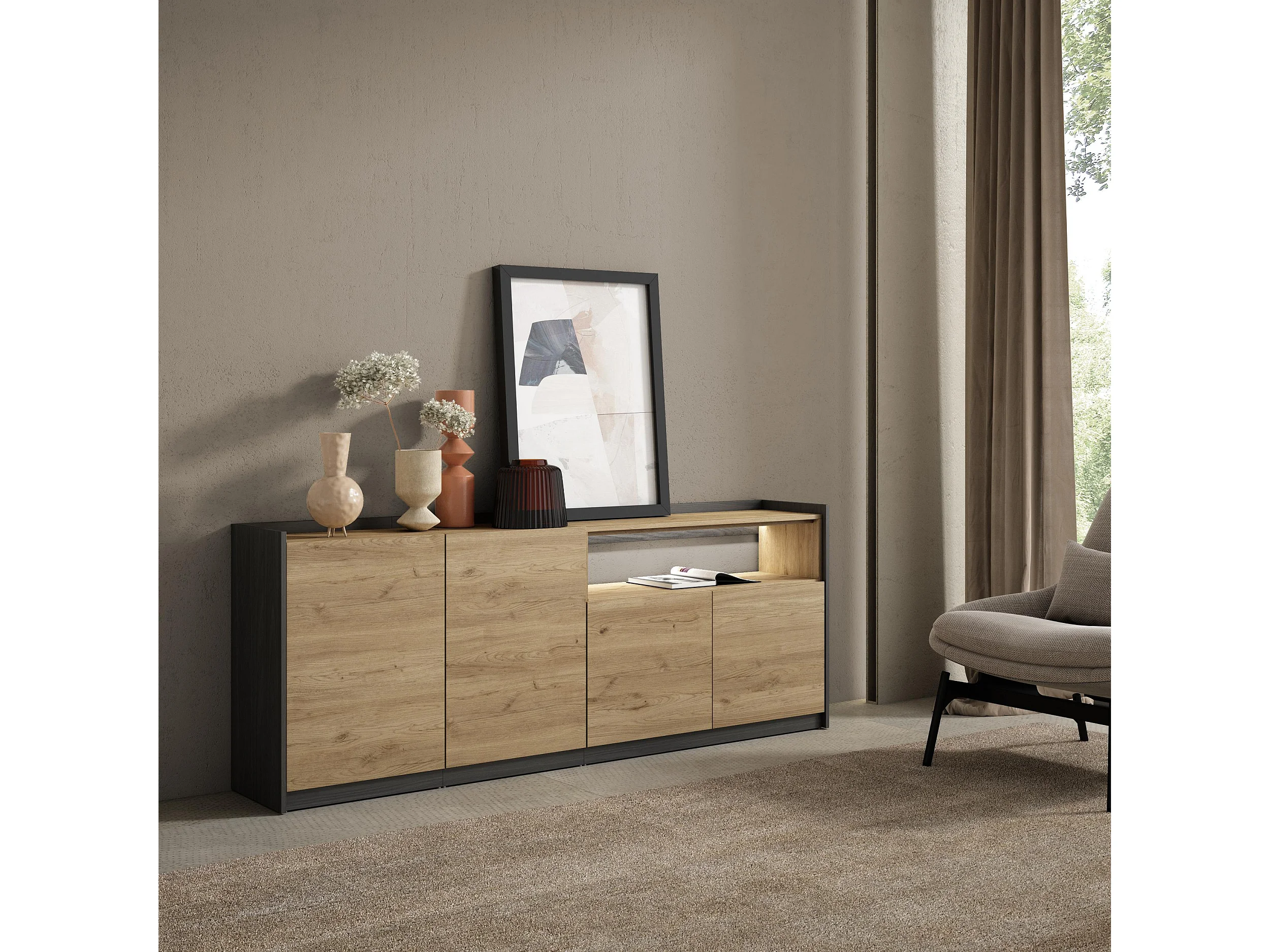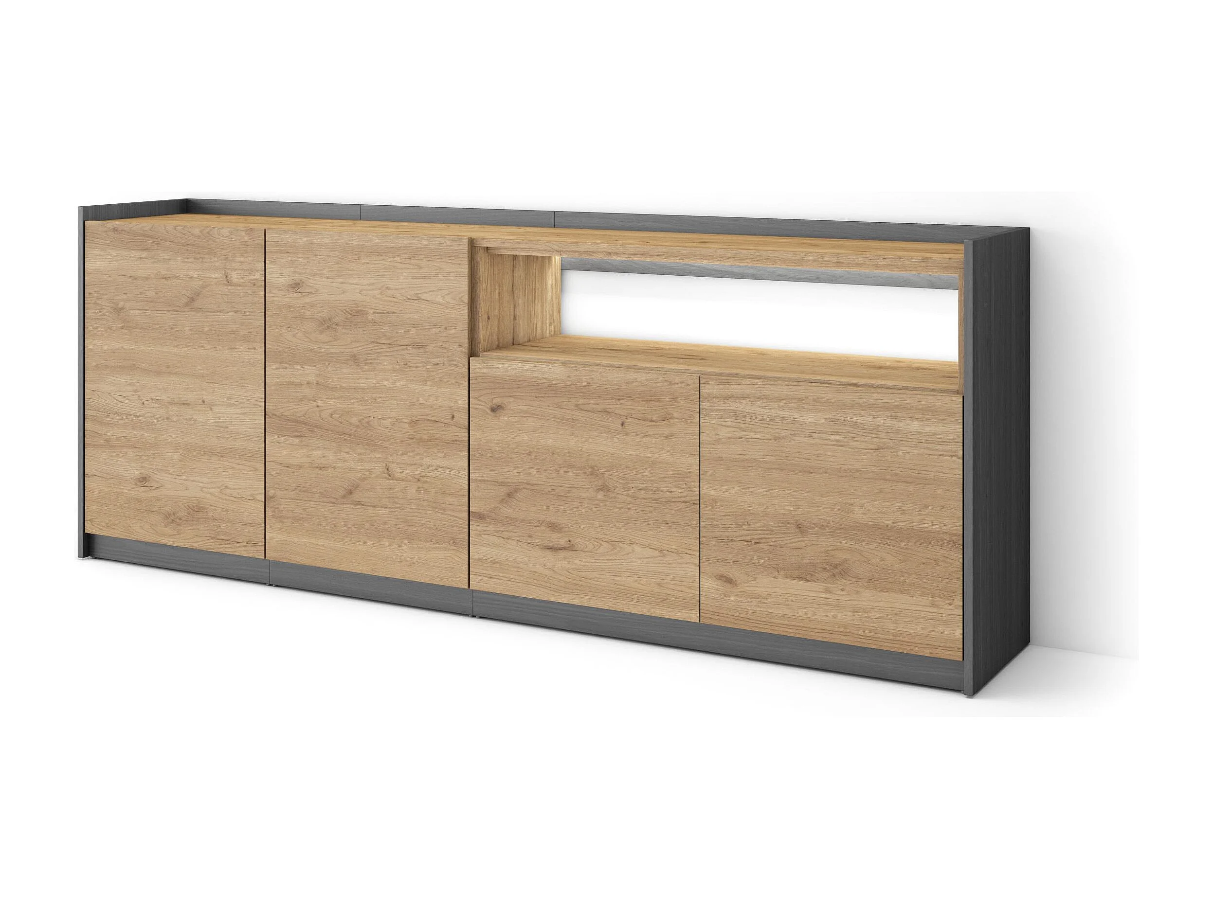 Credenza, Mobile, Cucina, 207x80x37 cm, 4 Porte, LED, Rovere e nero