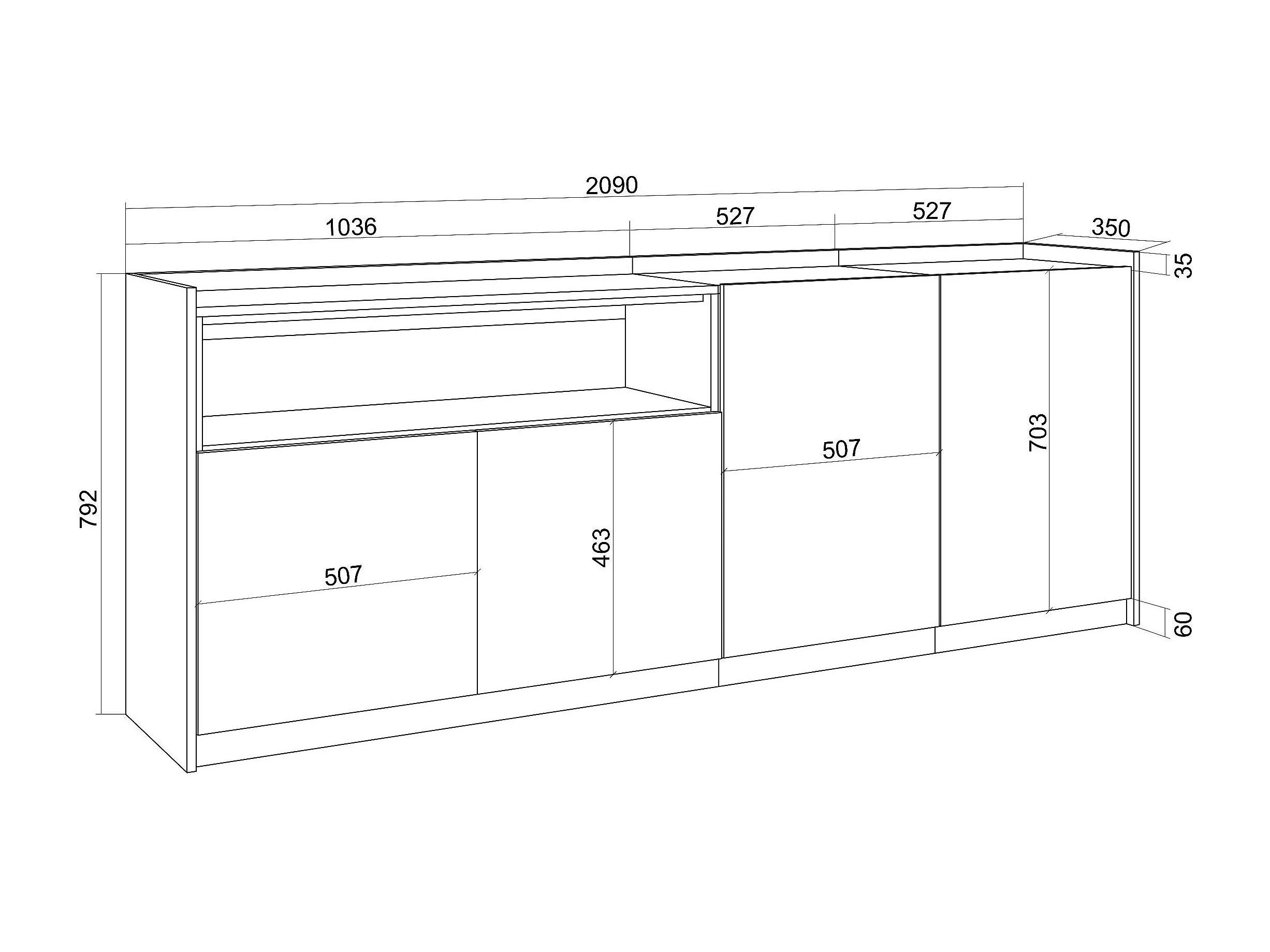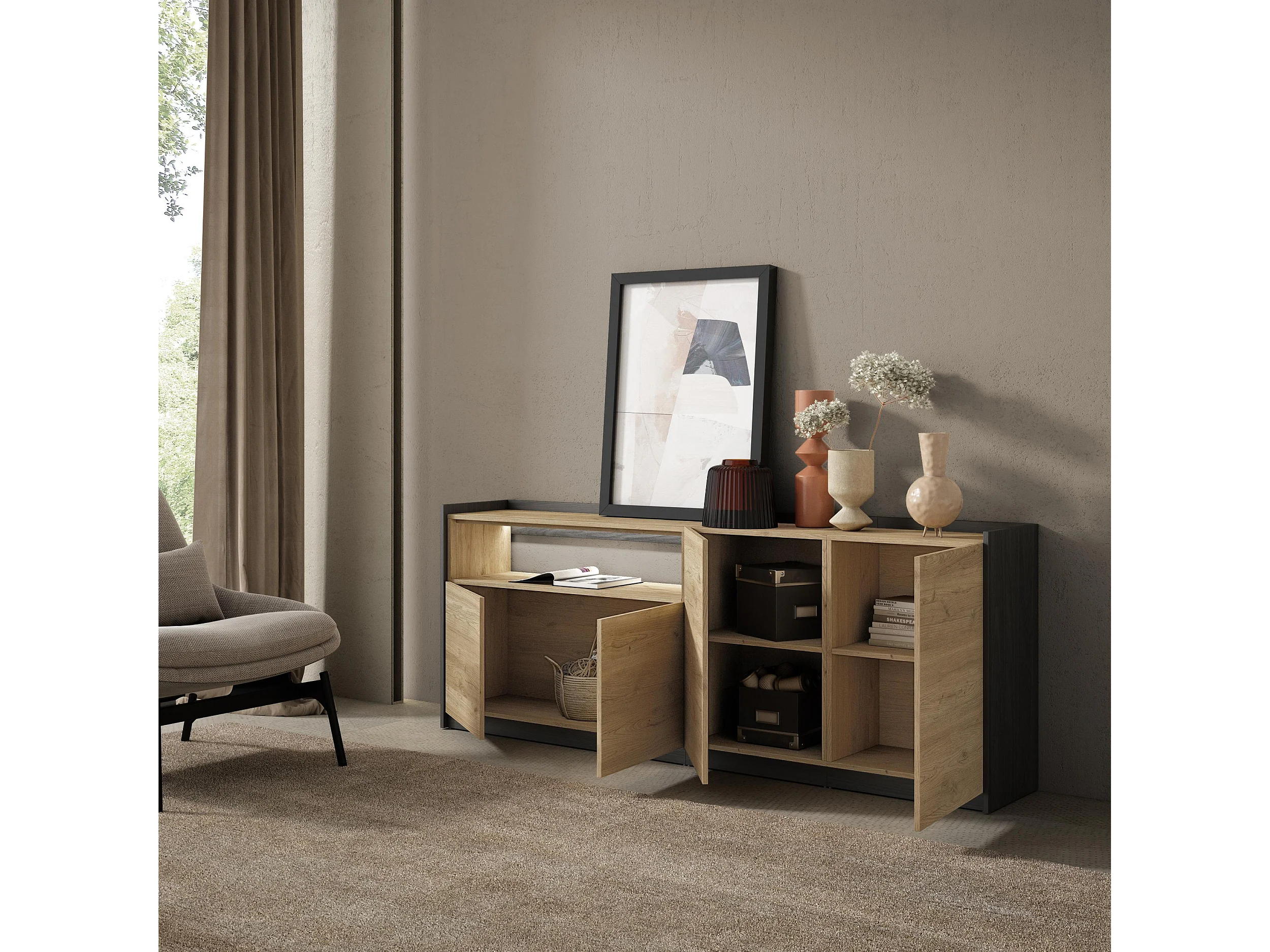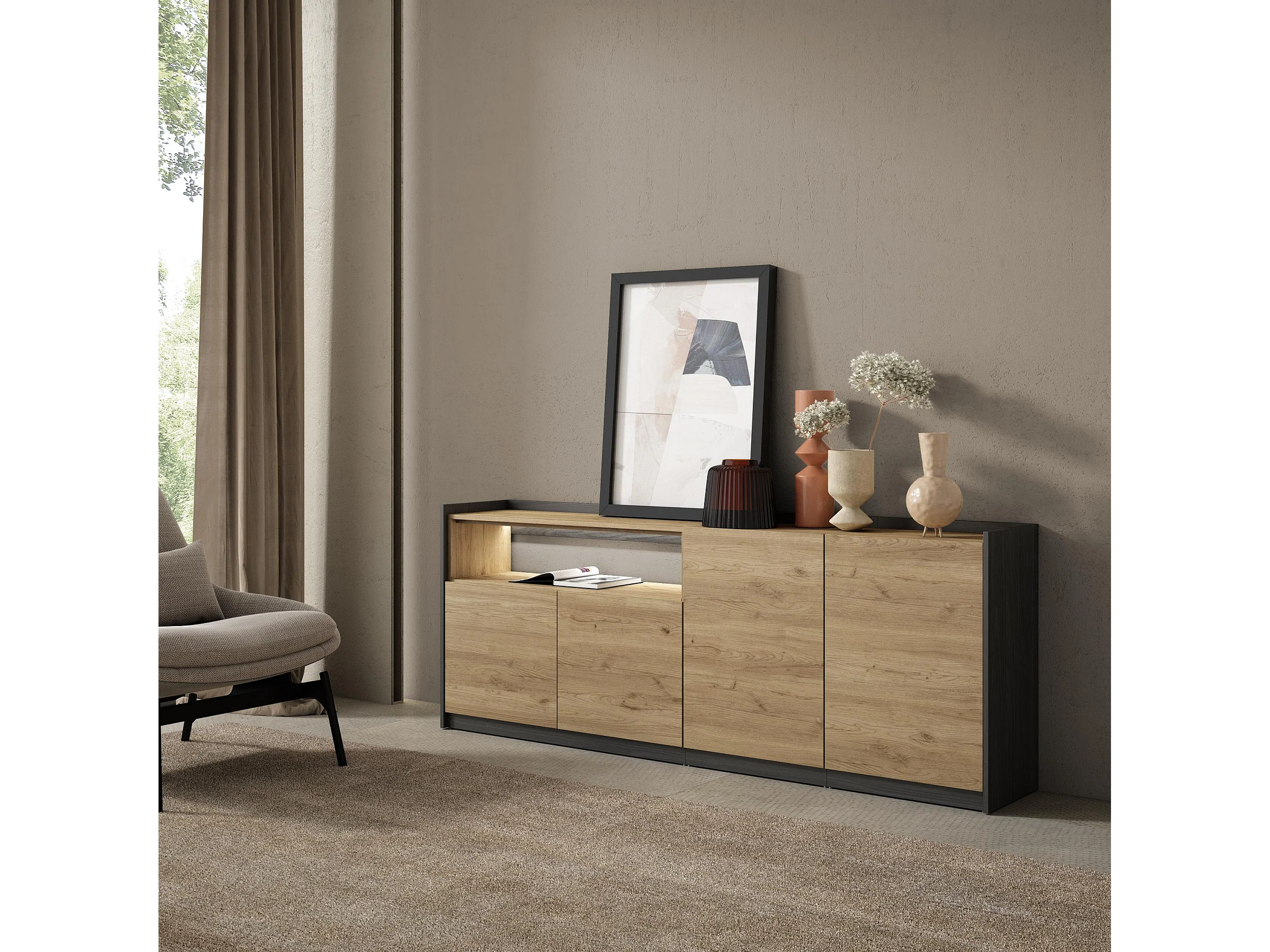 Credenza, Mobile, Cucina, 207x80x37 cm, 4 Porte, LED, Rovere e nero