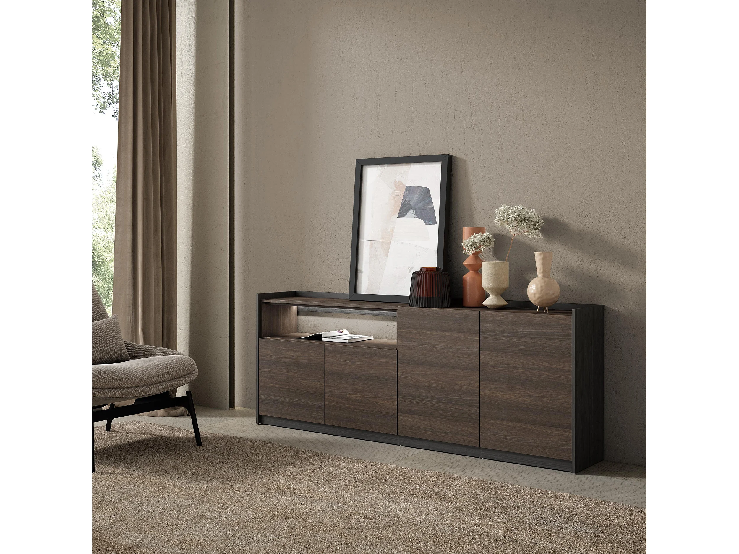 Credenza, Mobile, Cucina, 207x80x37 cm, 4 Porte, LED, Rovere scuro e Nero