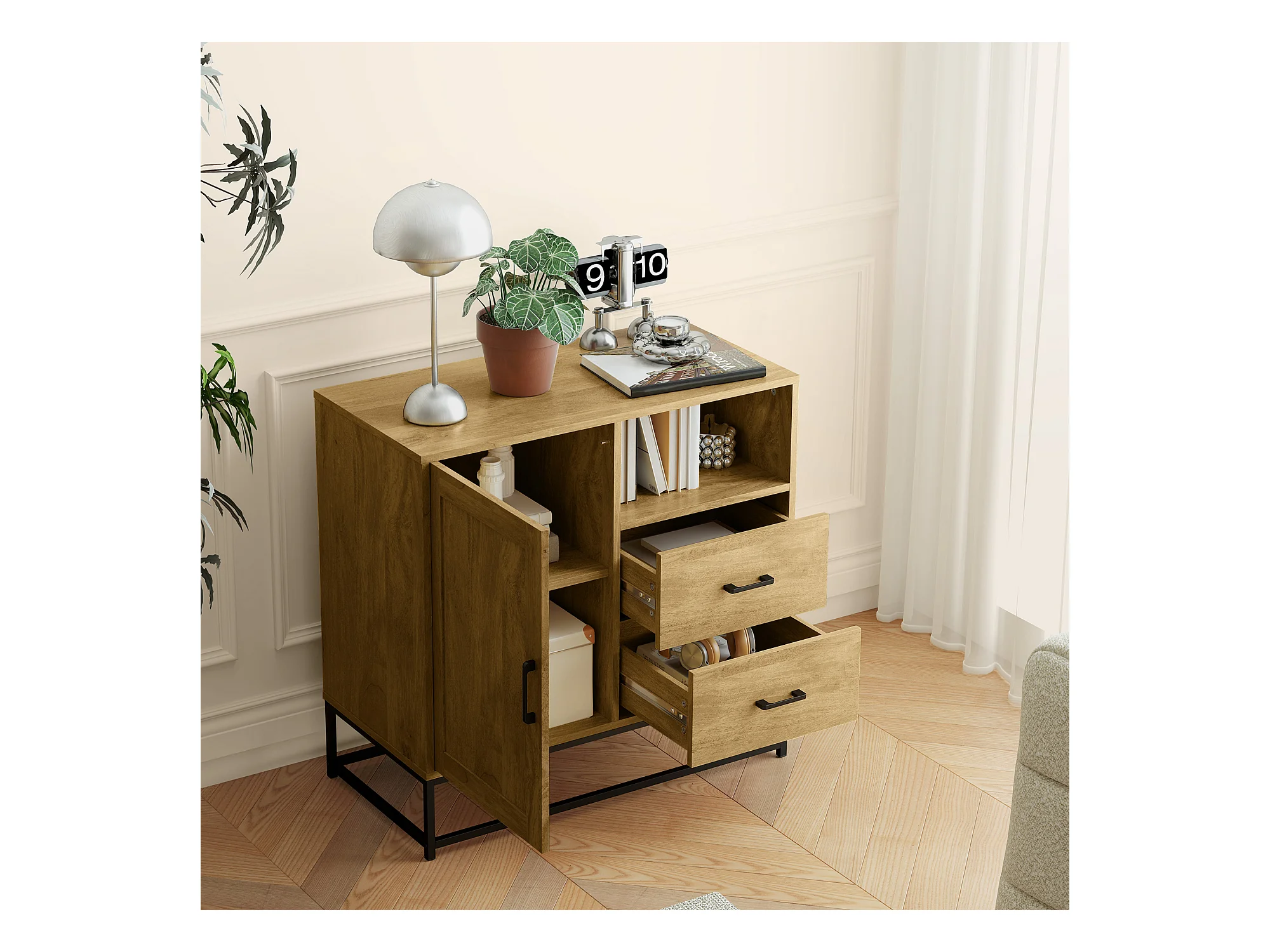 Credenza moderna con 2 cassetti, armadietto e ripiano aperto marrone