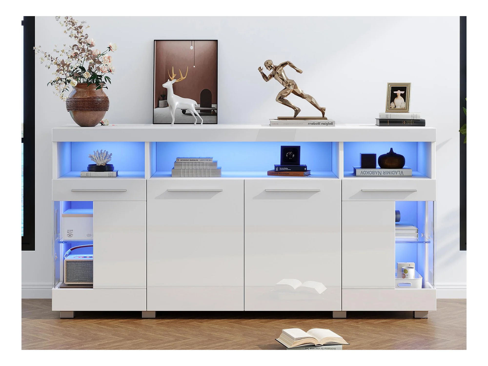 Credenza moderna LED - 4 ante e 9 scomparti per riordino - MDF + vetro temperato trasparente - Bianco