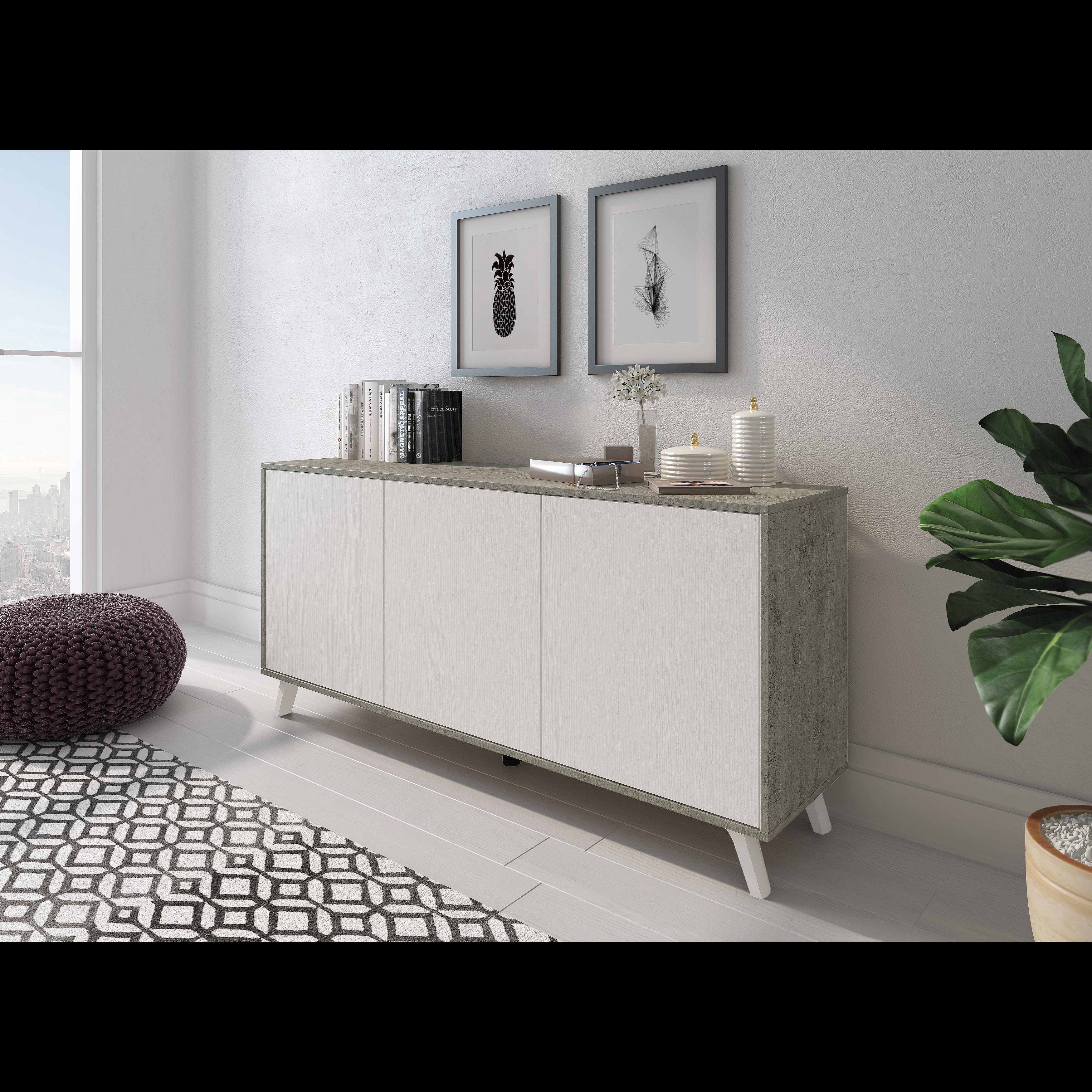 Credenza Moderna Madia 3 Ante Senza Maniglie Design Minimal Con Piedini Rialzati Per Soggiorno Ingresso Corridoio Salotto 154 x 72 x 40 Cm Bianco e Grigio Cemento