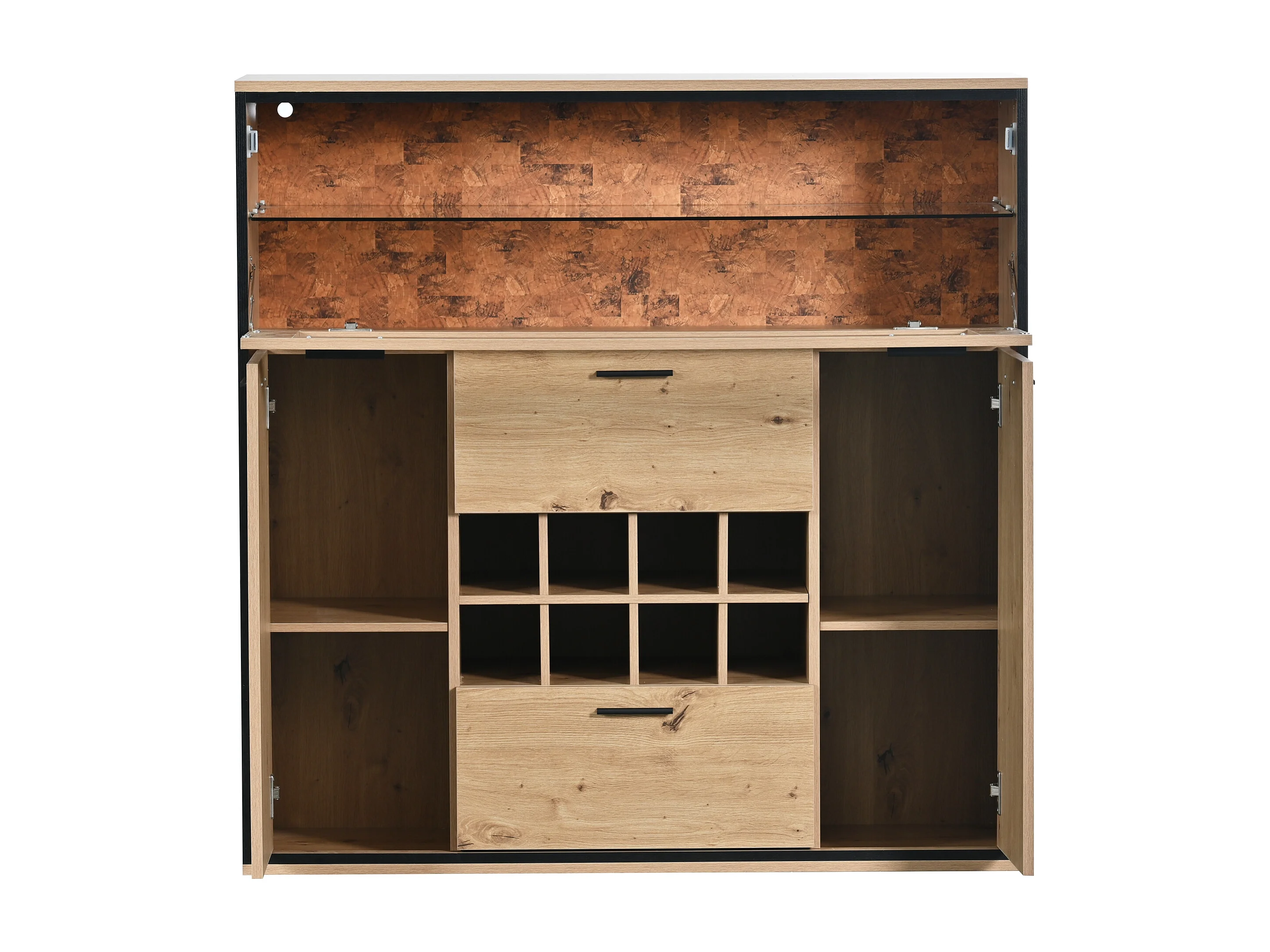 Credenza multifunzionale 110x38x111 cm ripiano in vetro con LED e 8 portabottiglie - Naturale