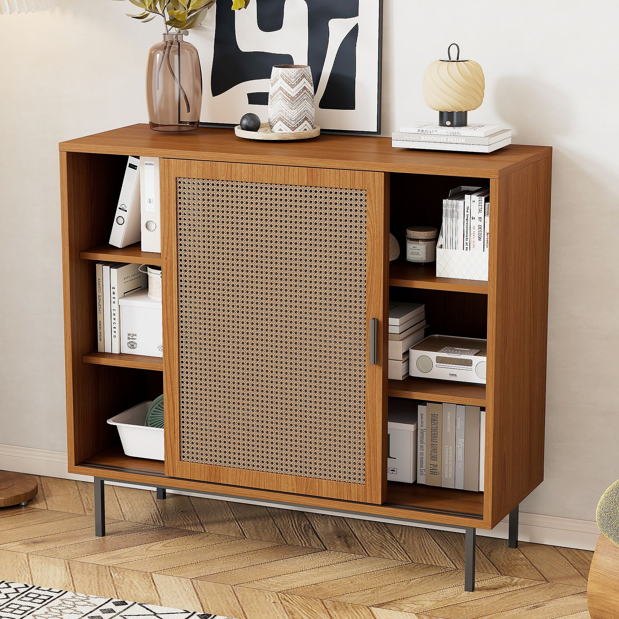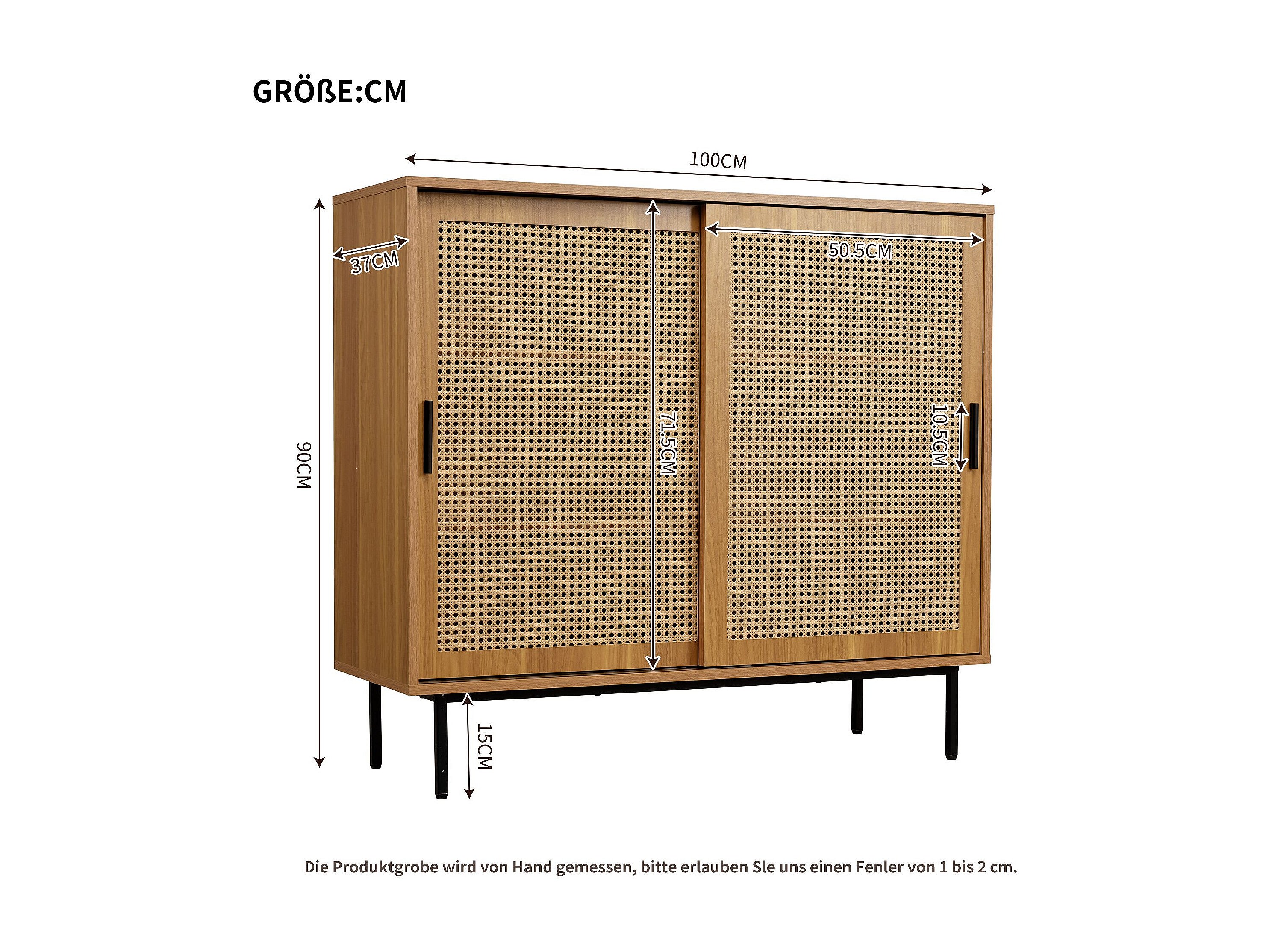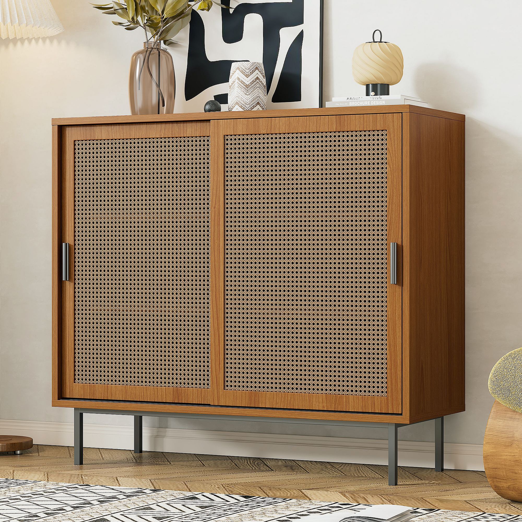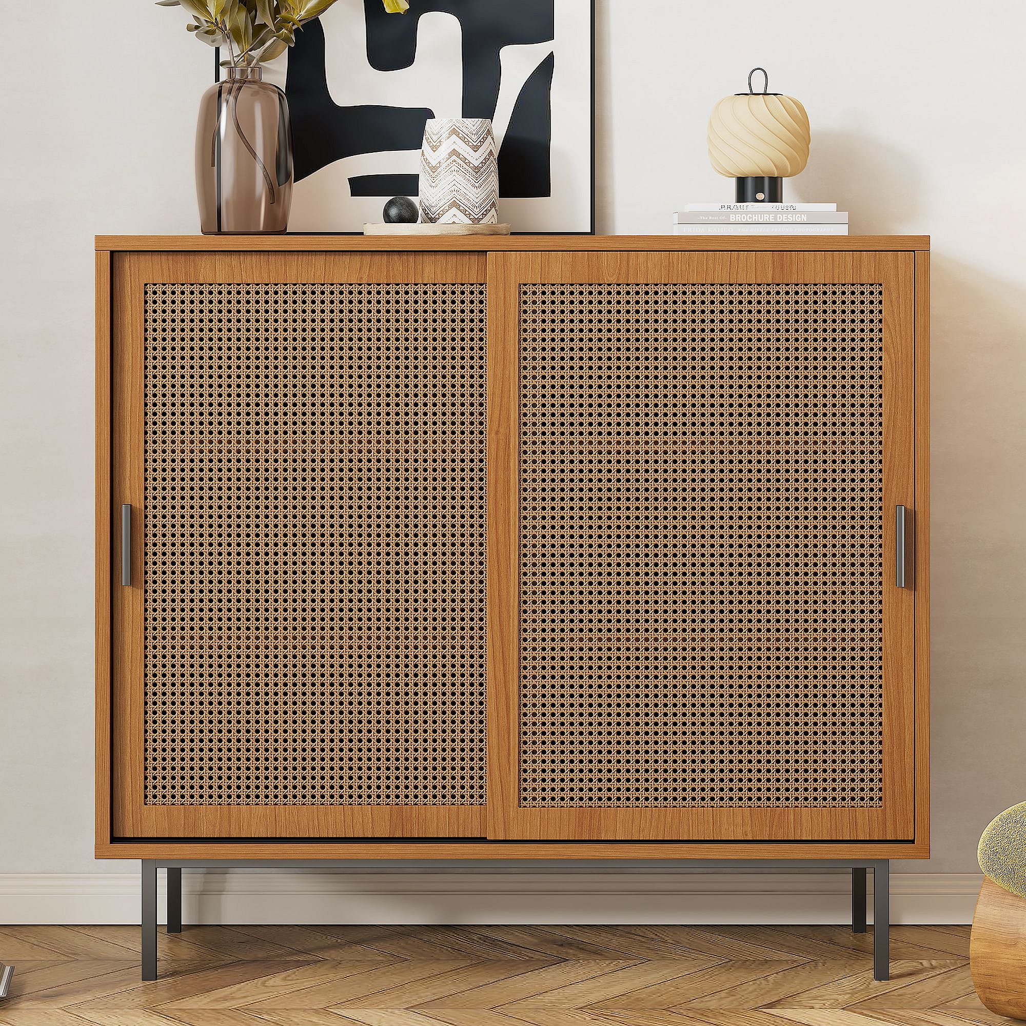 Credenza naturale con 2 ante in rattan e ripiani regolabili - maniglie e gambe nere