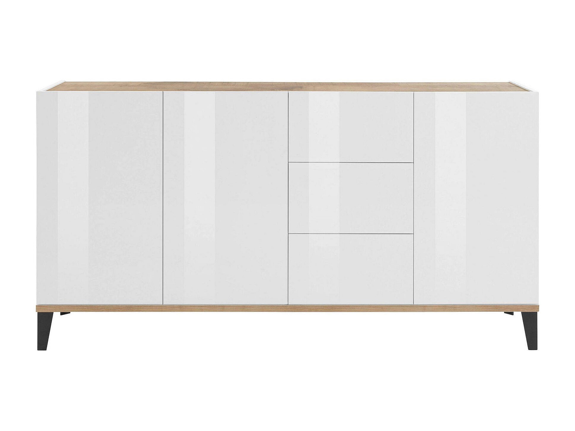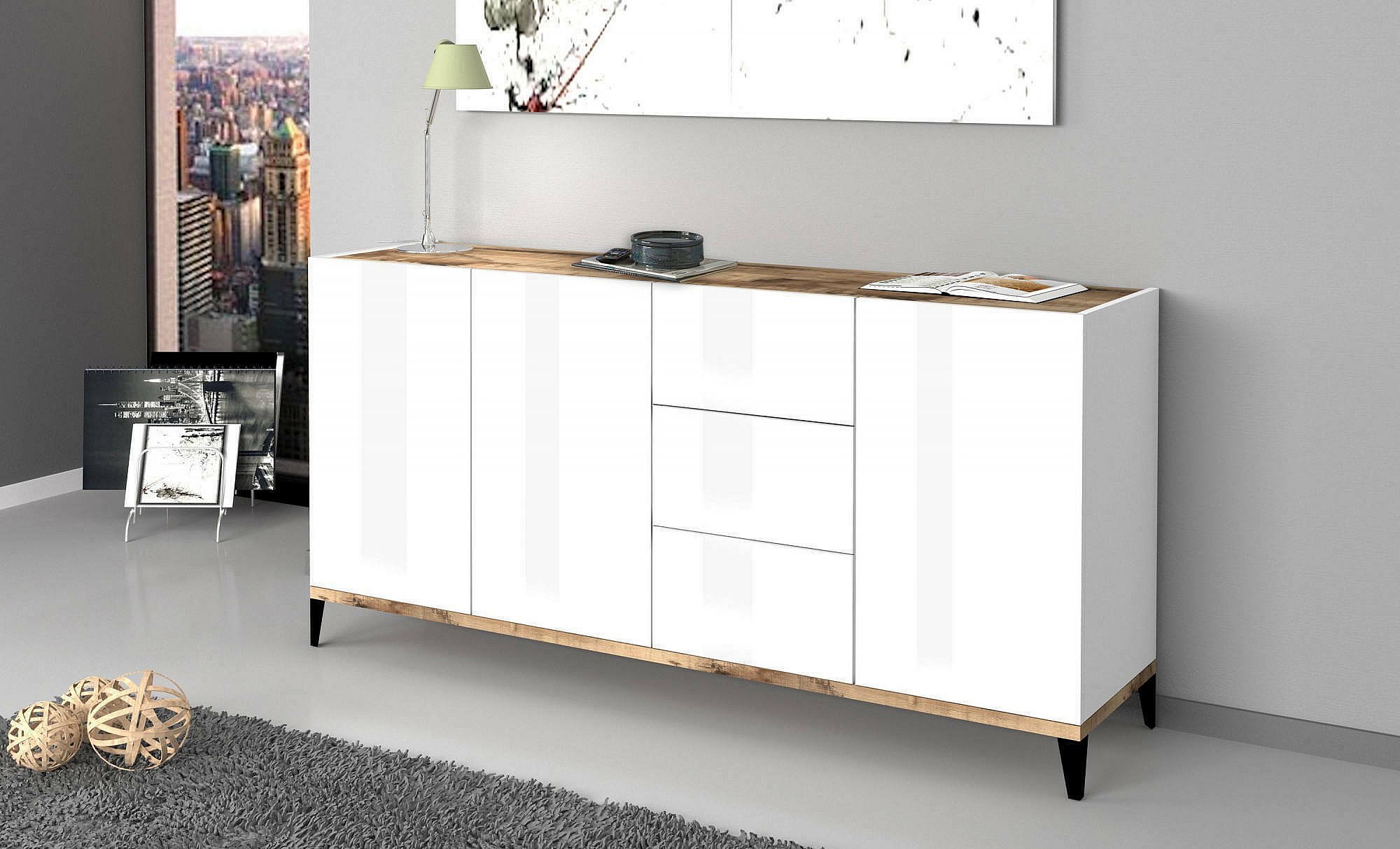 Credenza Liam, Madia da cucina a 4 ante, Buffet da soggiorno, 100% Made in Italy, cm 160x40h82, Bianco lucido e Acero