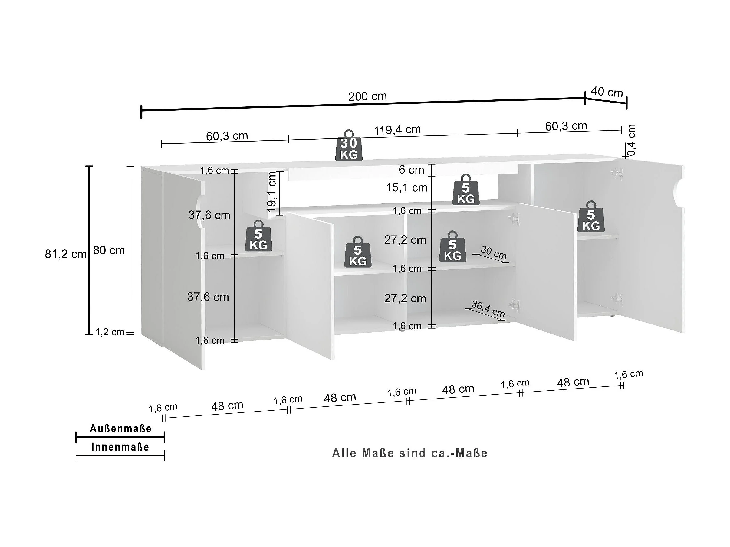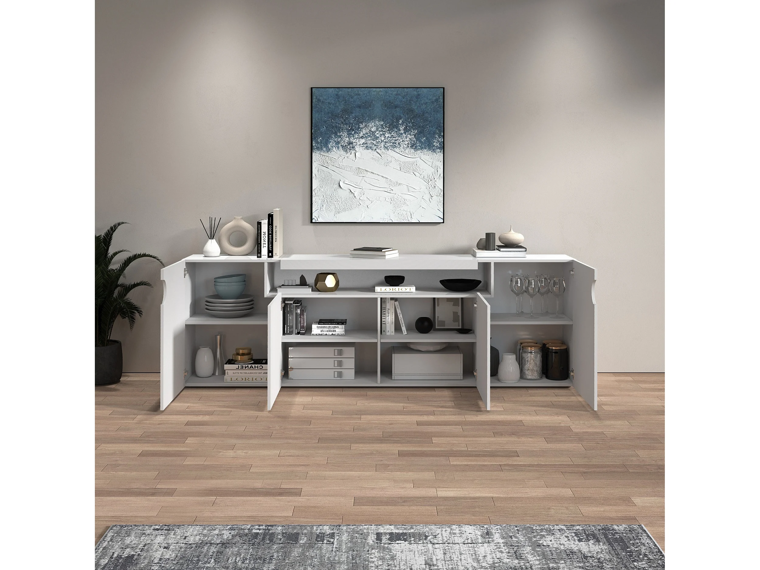 Credenza Real con 4 ante e 1 vano aperto bianco lucido 200x40x80 cm