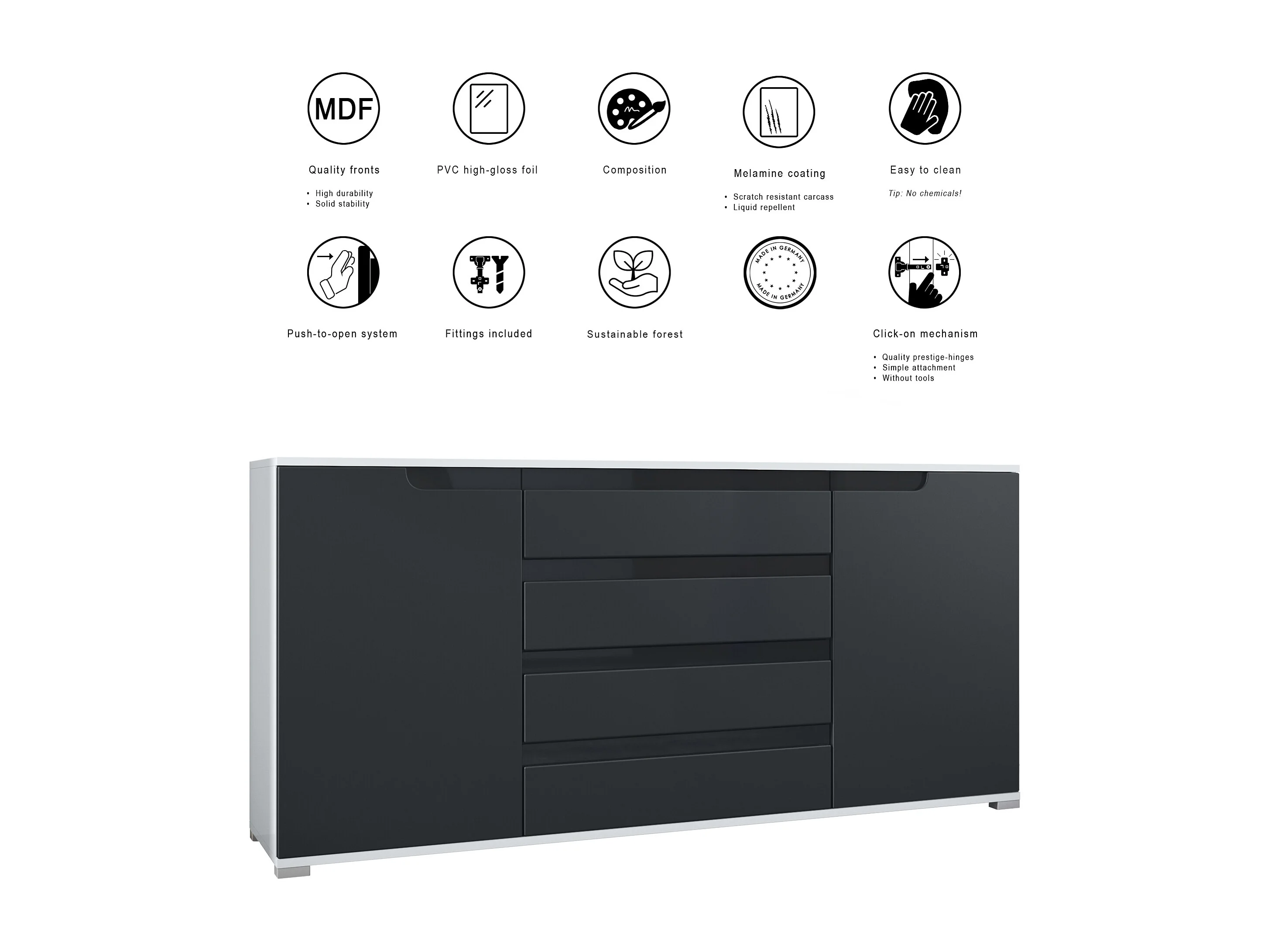 Credenza Sylt V2, Comò con 2 Ante e 4 Cassetti, Struttura - antracite opaco / Frontale - violetto porpora lucido / Dettagli - bianco lucido (166,5 x 75,5 x 35 cm)
