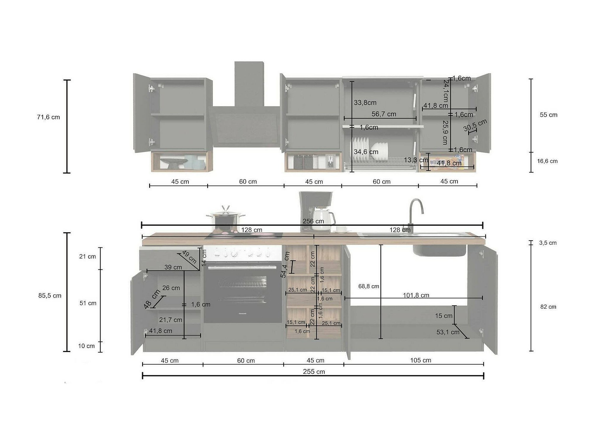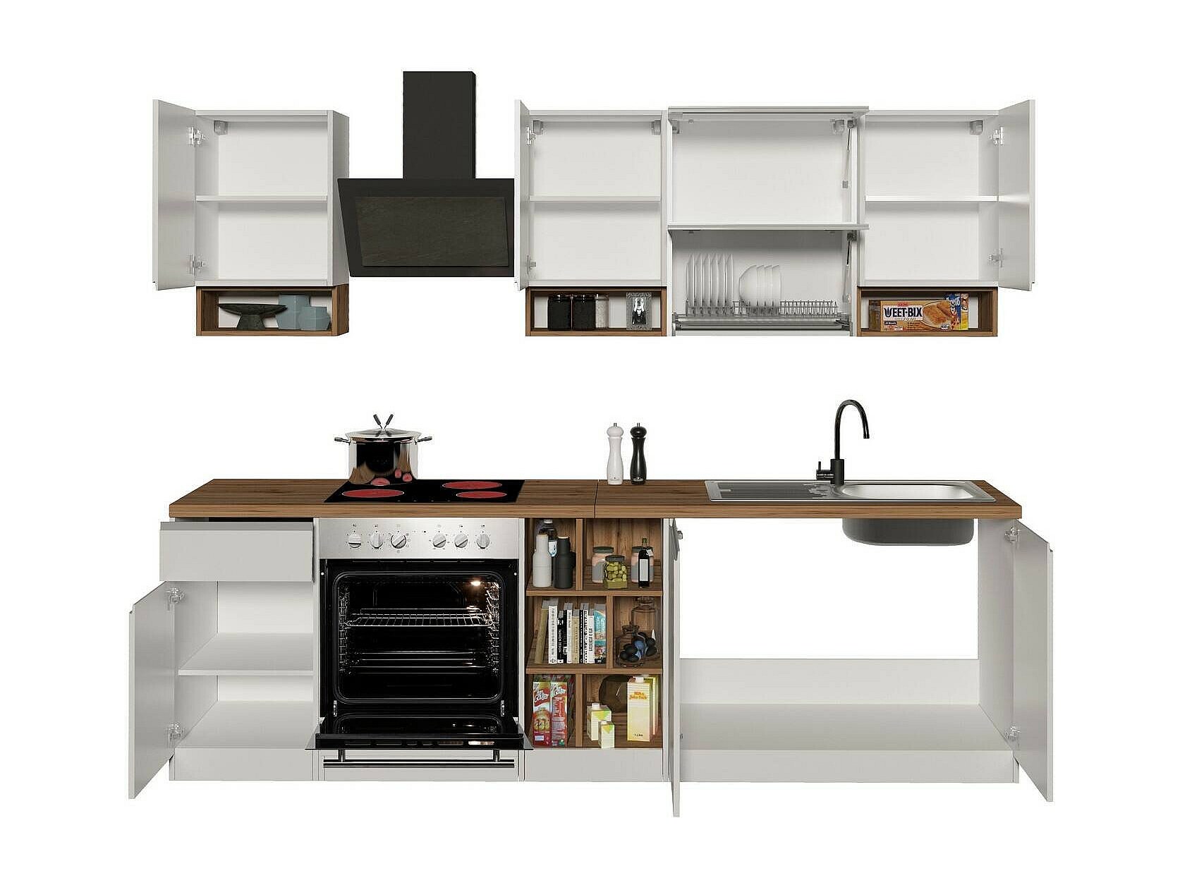 Dmora - Cucina completa Attimis, 255x60h85 cm, Bianco lucido e Rovere