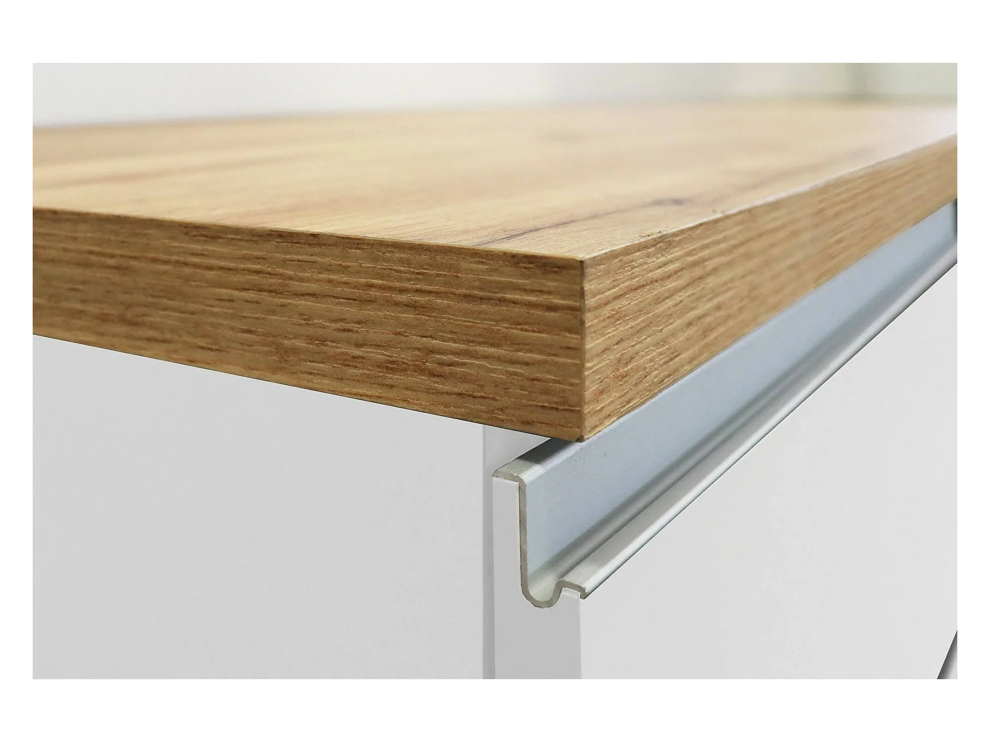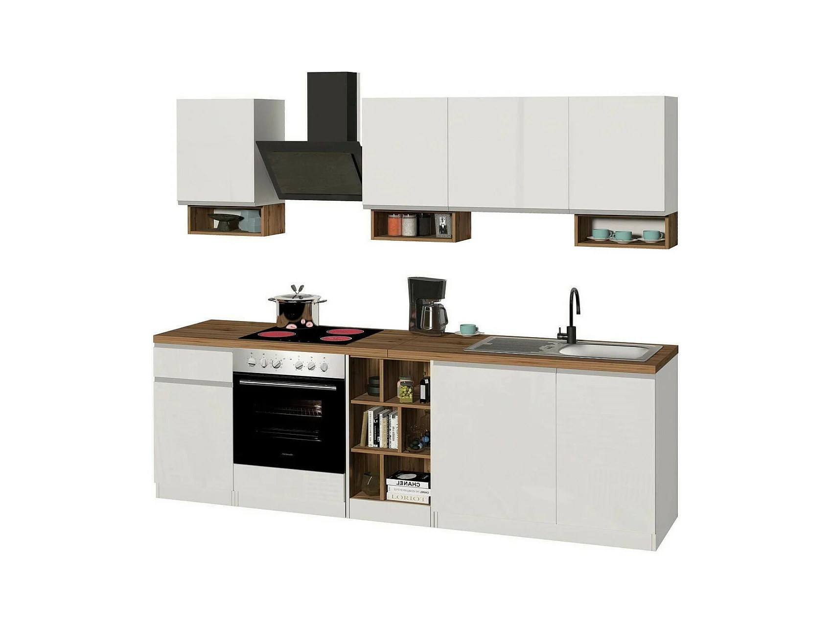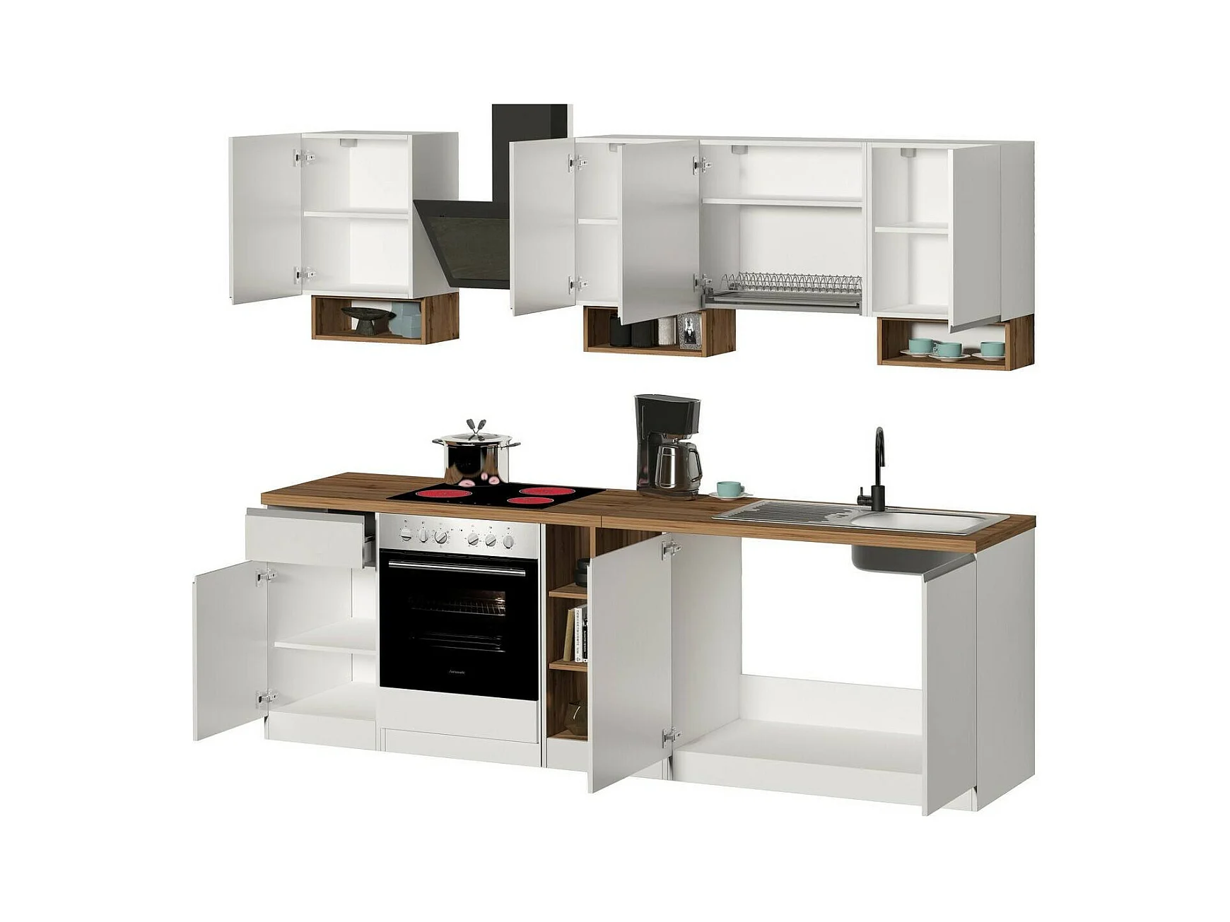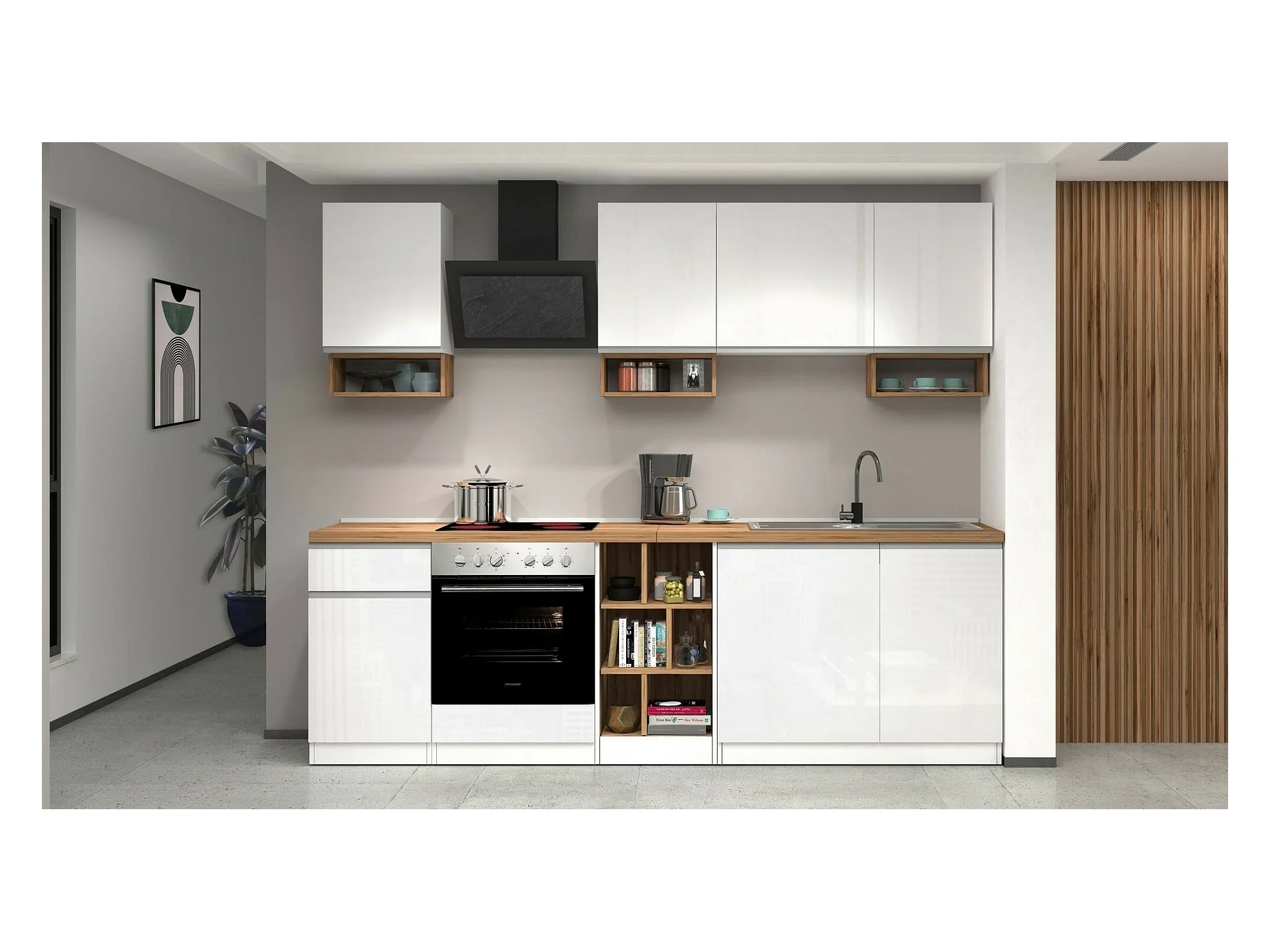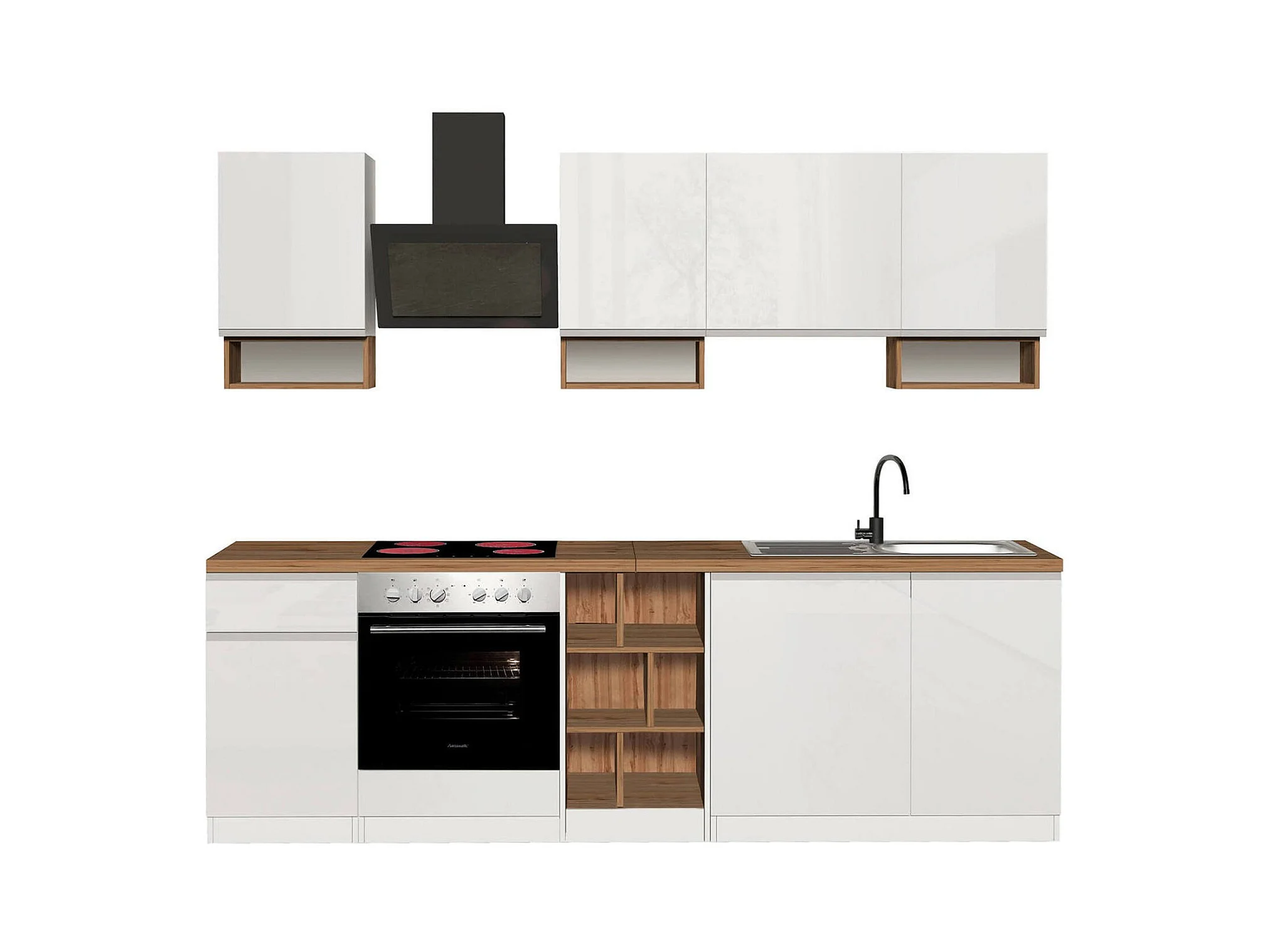 Dmora - Cucina completa Attimis, 255x60h85 cm, Bianco lucido e Rovere